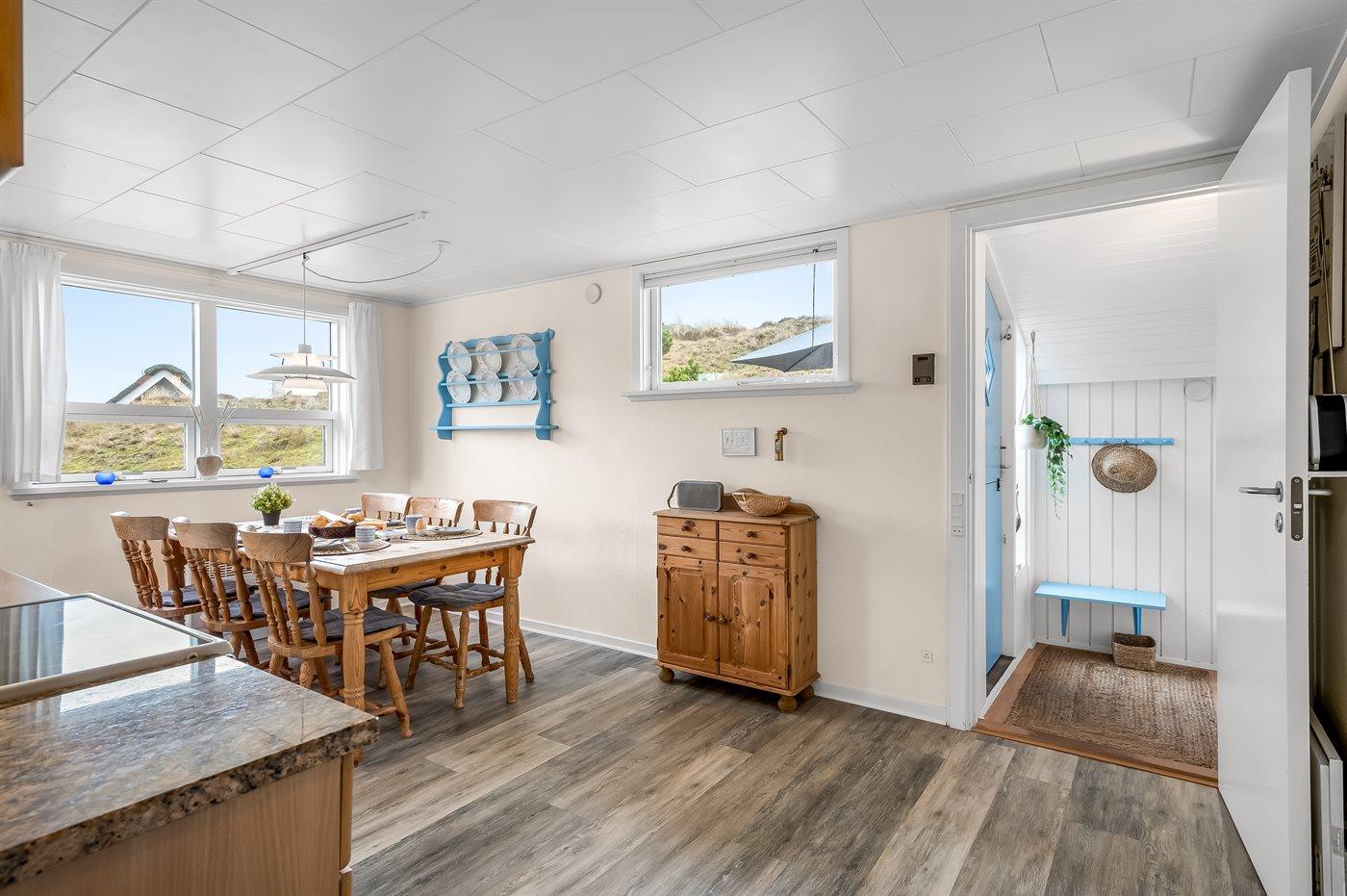 Køkkenet er udstyret med 1 køleskab. Der er 4 elkogeplader, varmluftovn, mikrobølgeovn samt opvaskemaskine.