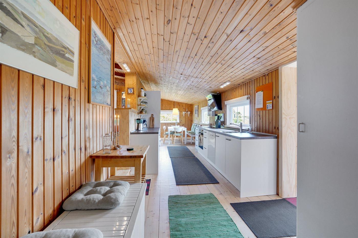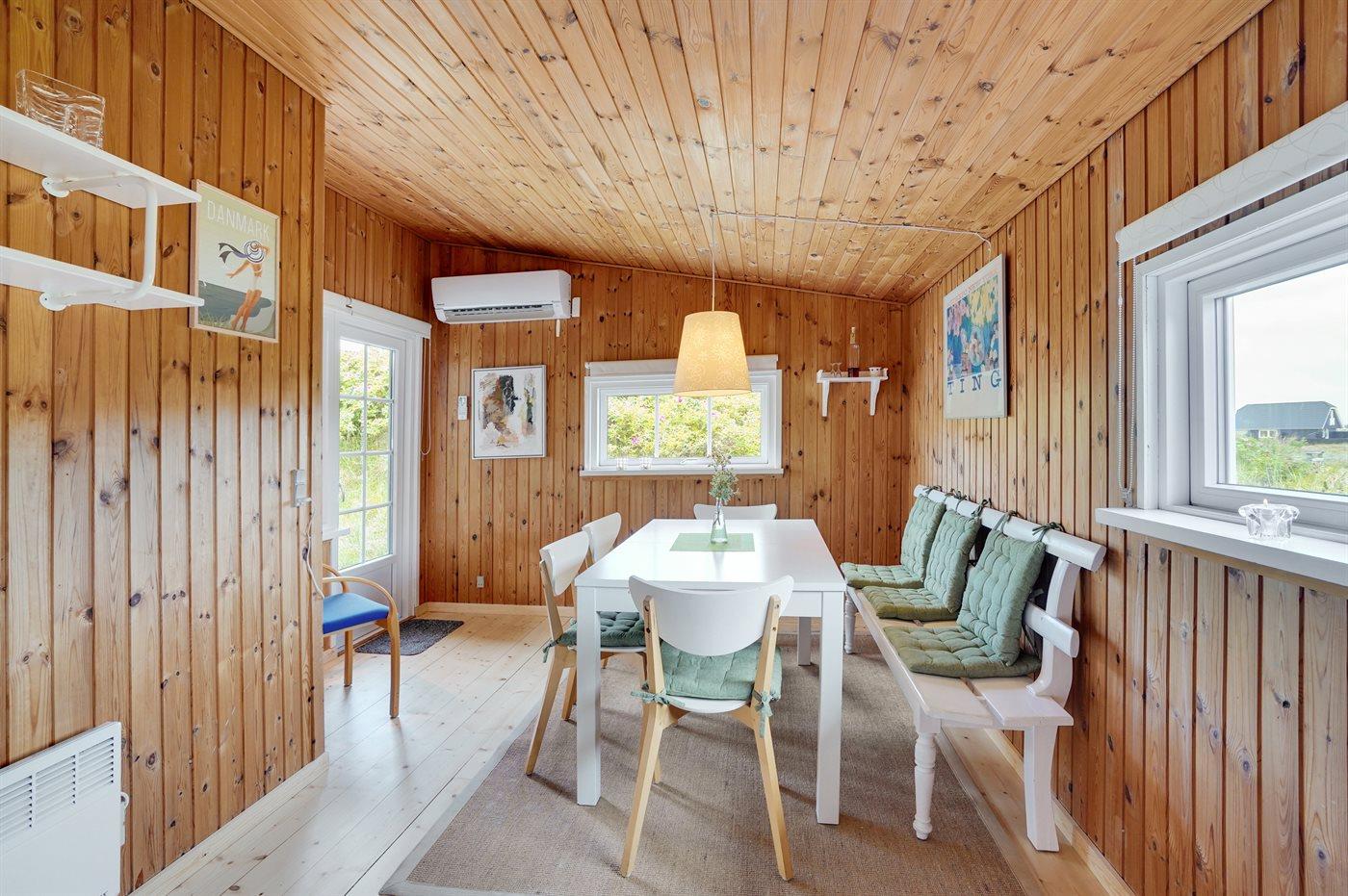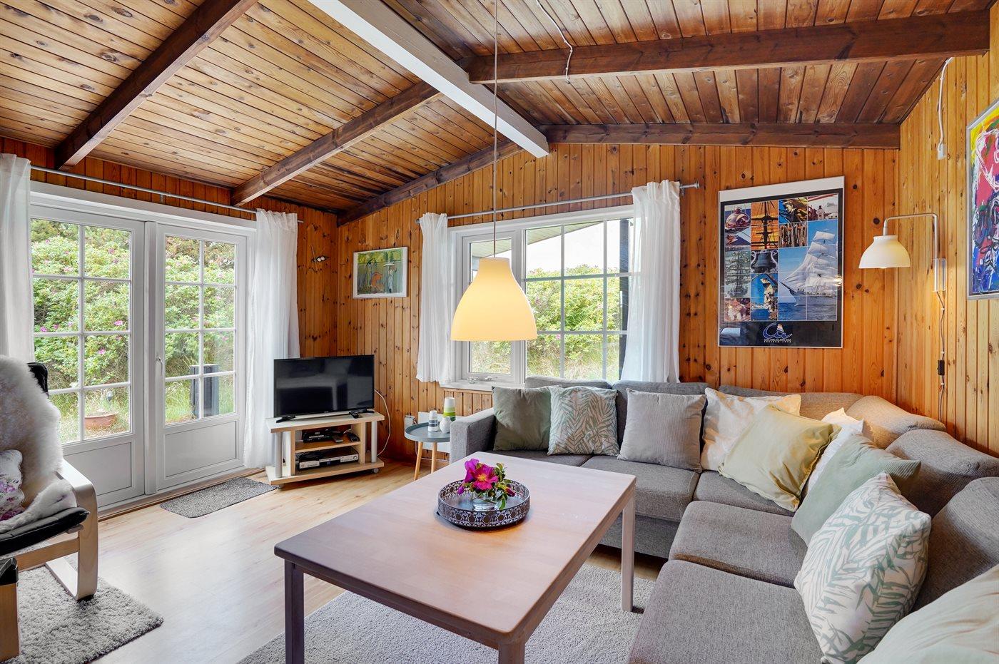 Dette charmerende sommerhus, som er moderniseret med bl.a. en tilbygning i 2022, ligger i forskudt plan på en højtbeliggende klitgrund med en flot udsigt til klitområderne. Huset er godt indrettet med mange hyggekroge, ligesom der er flere og til dels ovedækkede læ- og solterrasser, hvor det er muligt at slappe og og lytte til lyden af havets brusen.