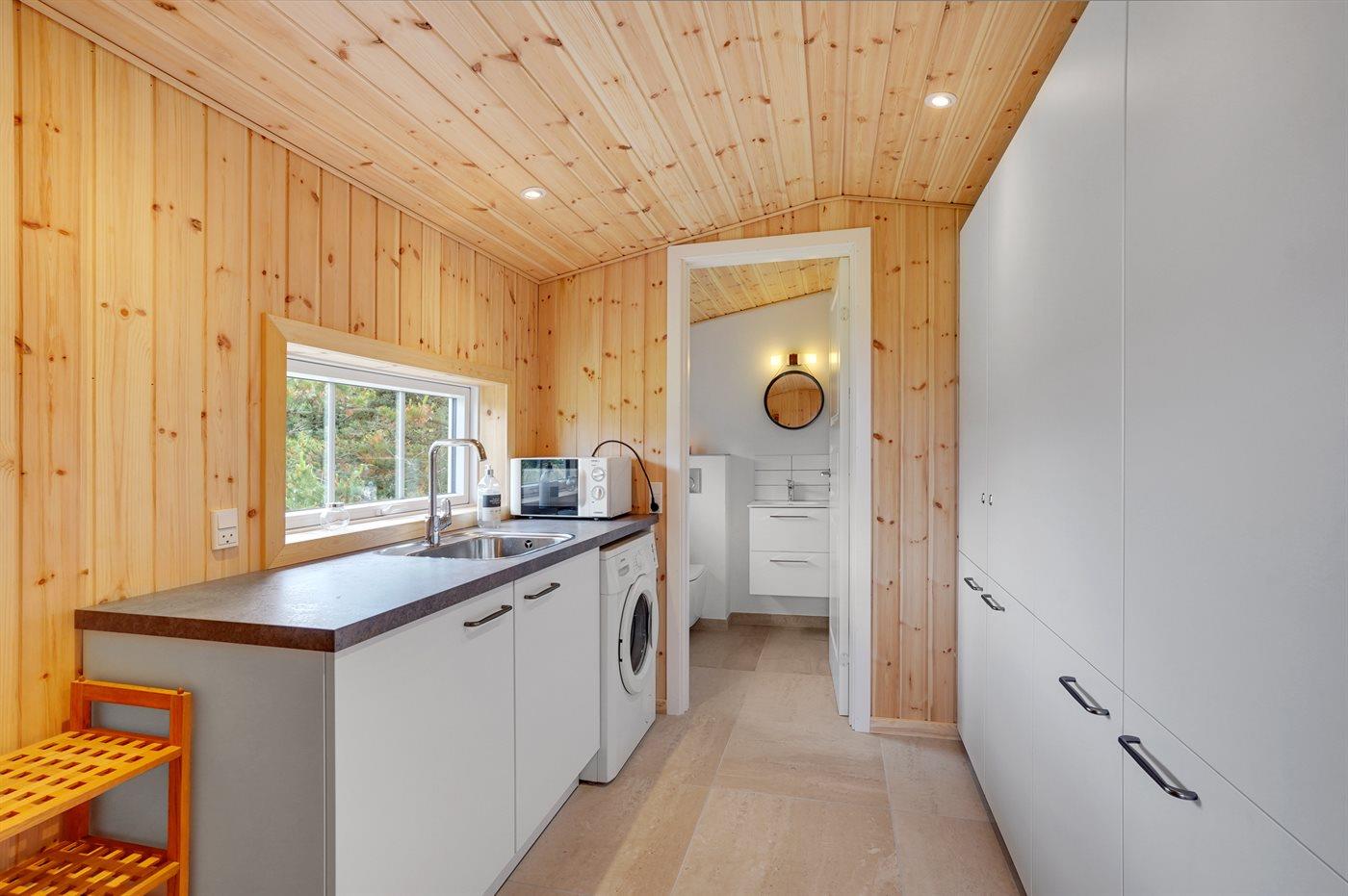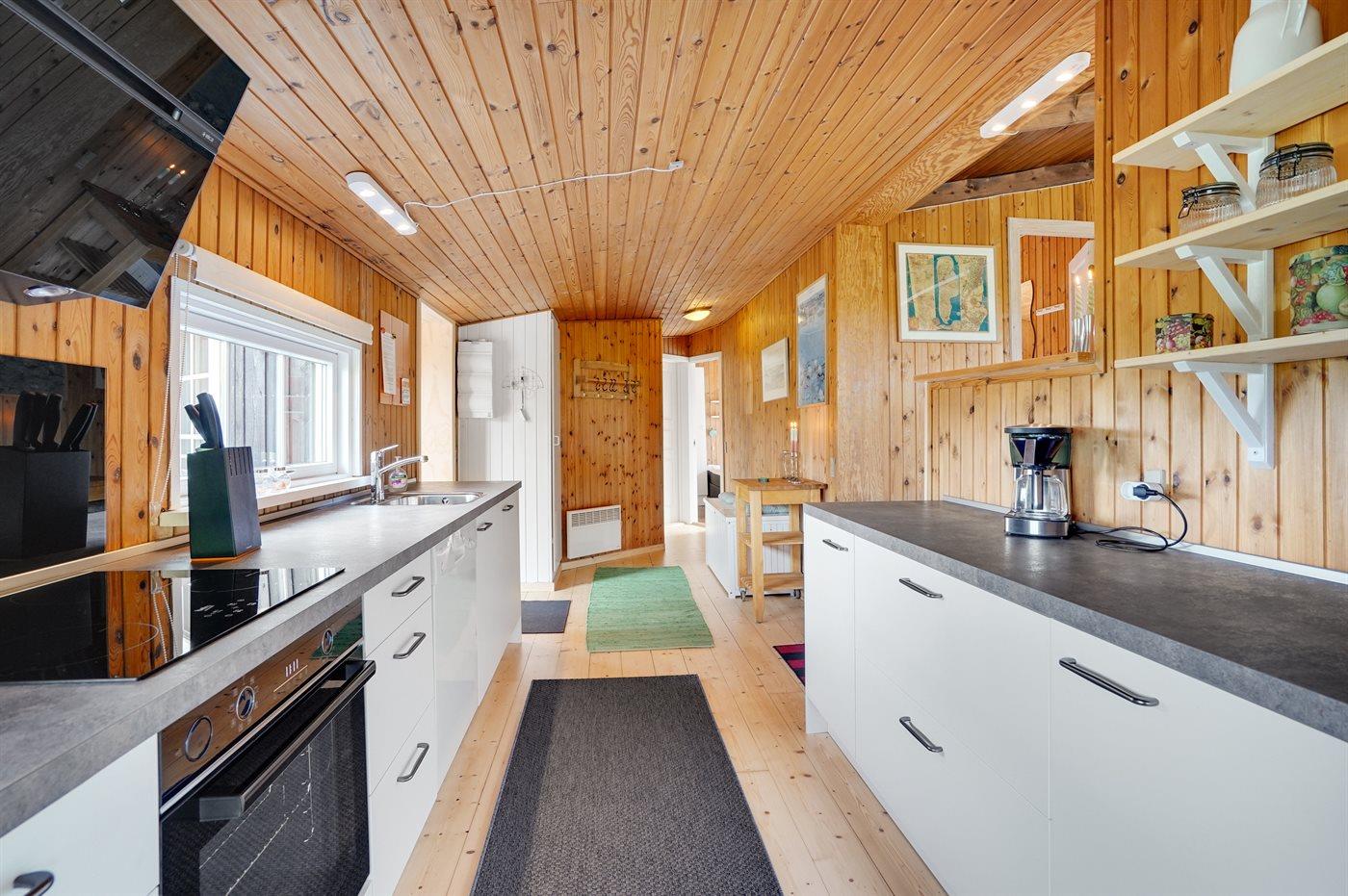 Køkkenet er udstyret med 1 køleskab. Der er 4 elkogeplader, bageovn, mikrobølgeovn samt opvaskemaskine.