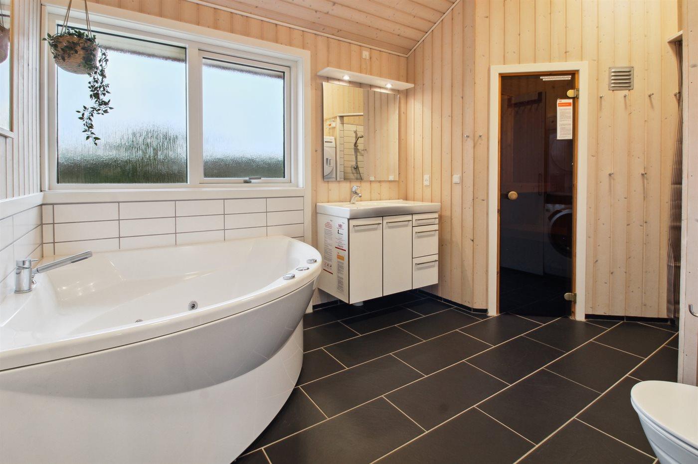 Der er 2 badeværelser med bruseniche og 2 toiletter. Der er gulvvarme på 2 badeværelser. I saunaen er der mulighed for afslapning.