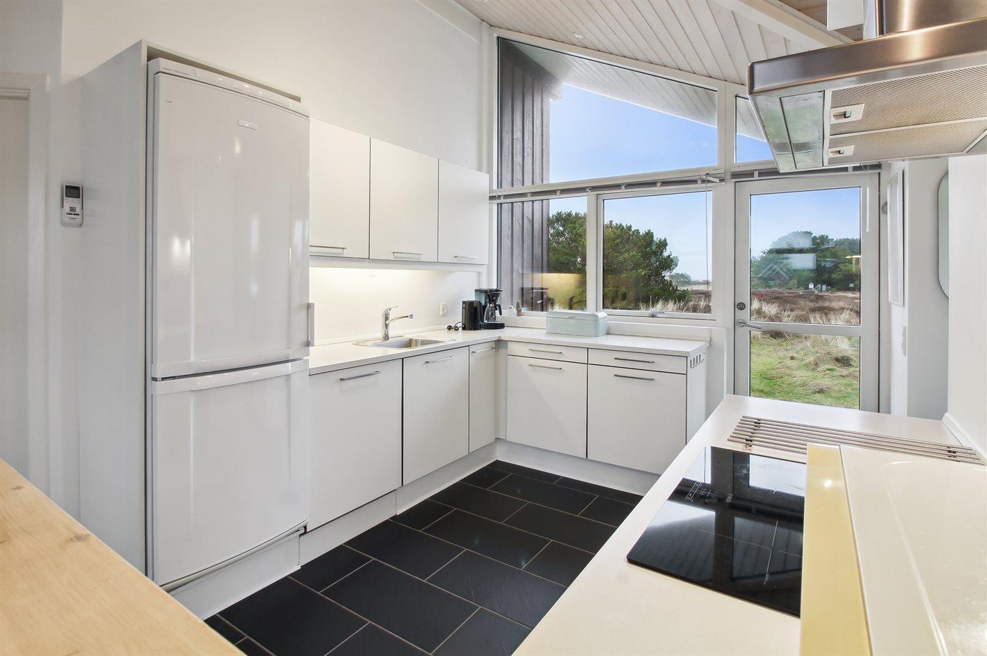 Køkkenet er udstyret med 1 køleskab. Der er 4 keramiske kogeplader, varmluftovn, mikrobølgeovn samt opvaskemaskine.