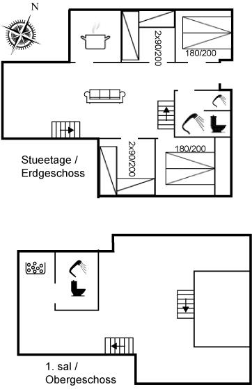 Husets sovepladser er fordelt på 4 soverum; 2 med dobbeltseng og 2 med hver 2 enkeltsenge. I underetagen findes en lækker, separat spa-, bad- og saunaafdeling, som indbyder til mange timers afslapning. Husets andet badeværelse er stort med tørretumbler og vaskemaskine. Foruden klimaanlæg, kan huset opvarmes med brændeovnen som er placeret i husets hjerte - alrummet.