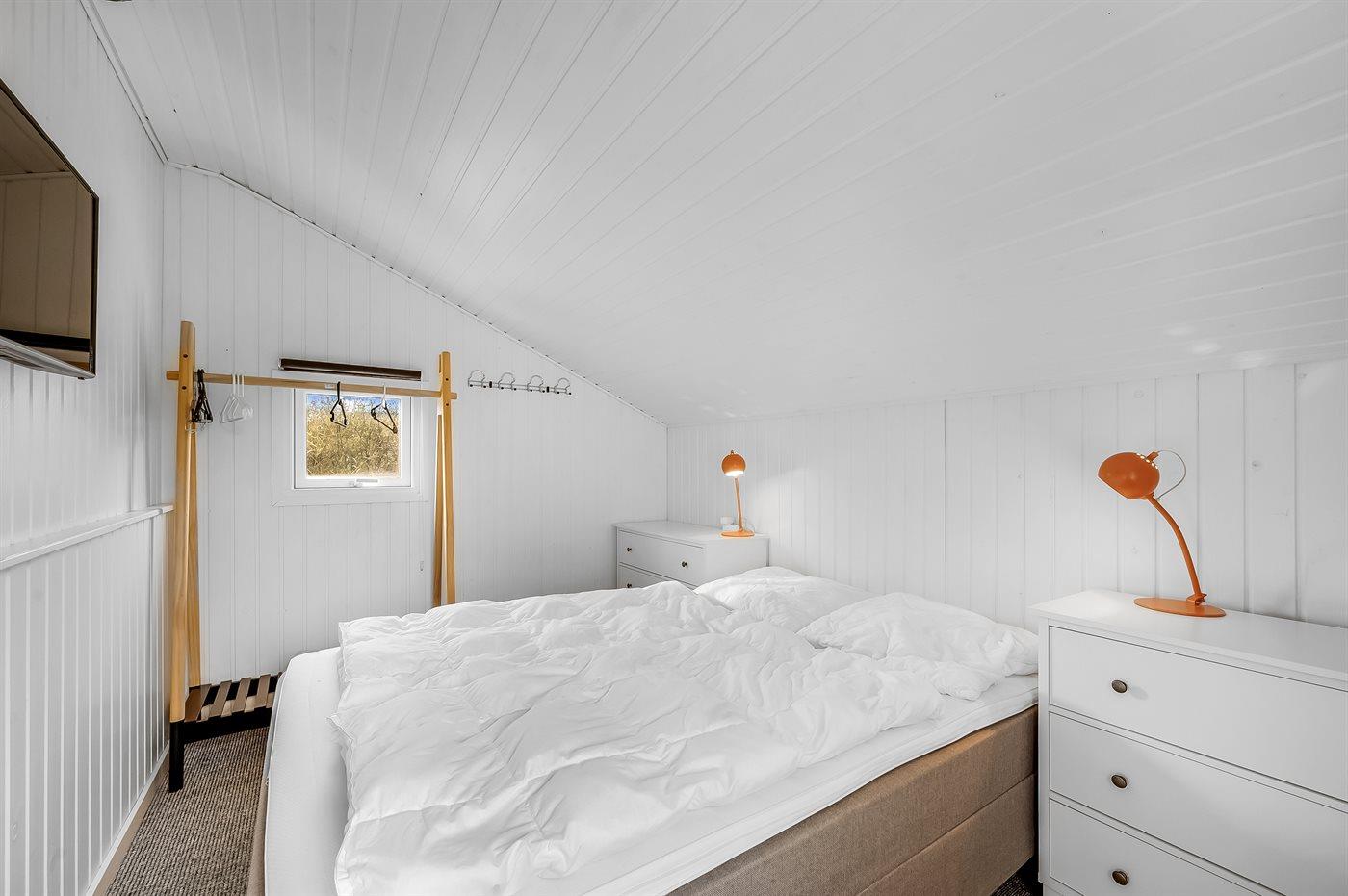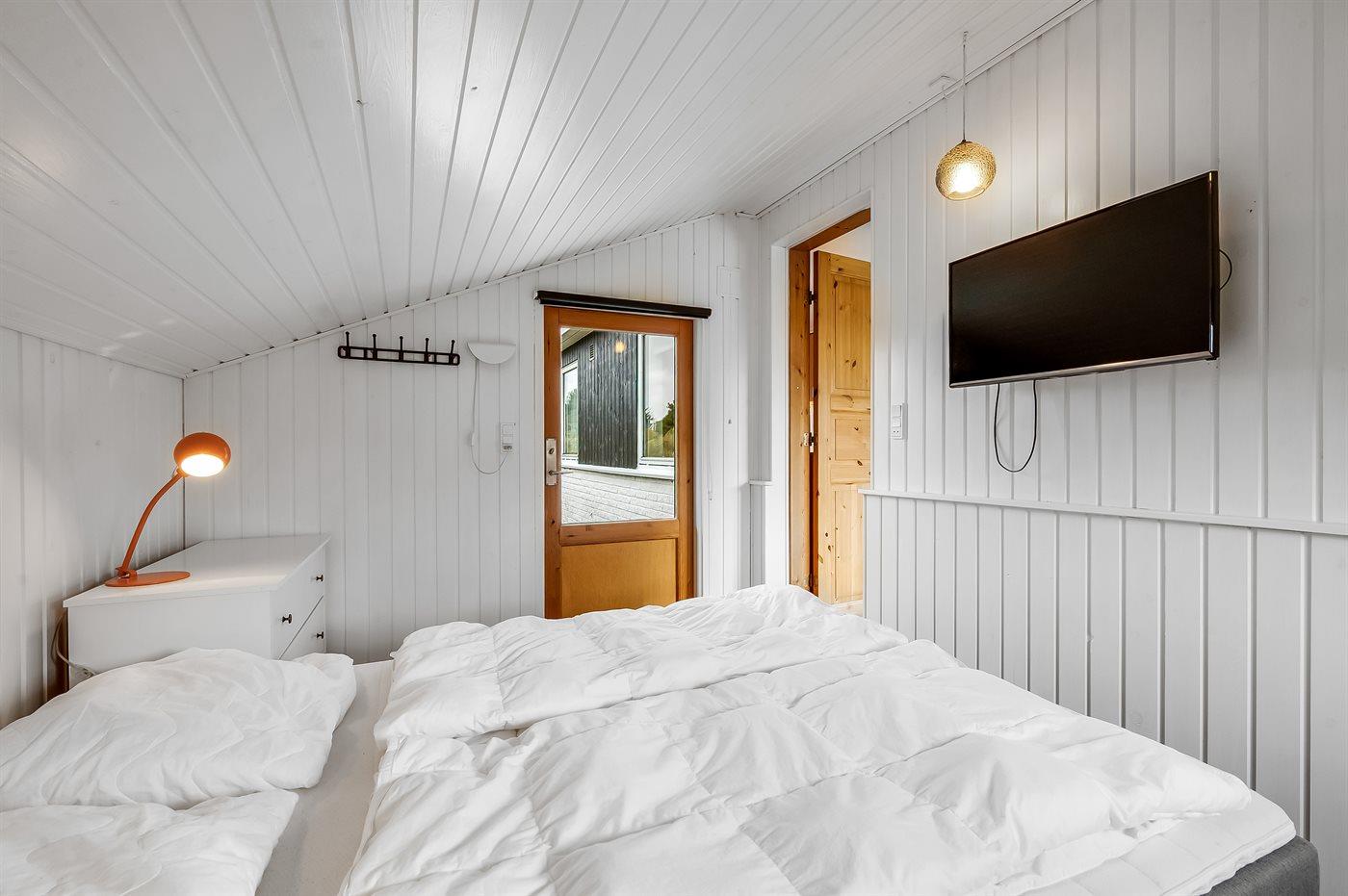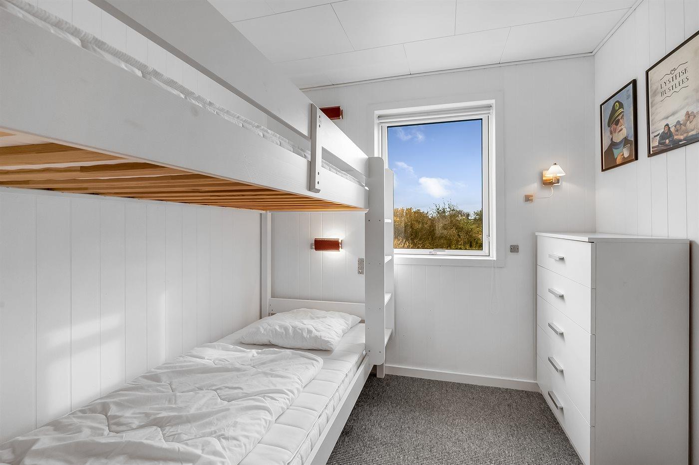 Der er i alt 3 soveværelser. Sovepladserne fordeler sig på: 4 sovepladser i dobbeltsenge. 2 sovepladser i køjeseng. Derudover er der 1 stk. barneseng.