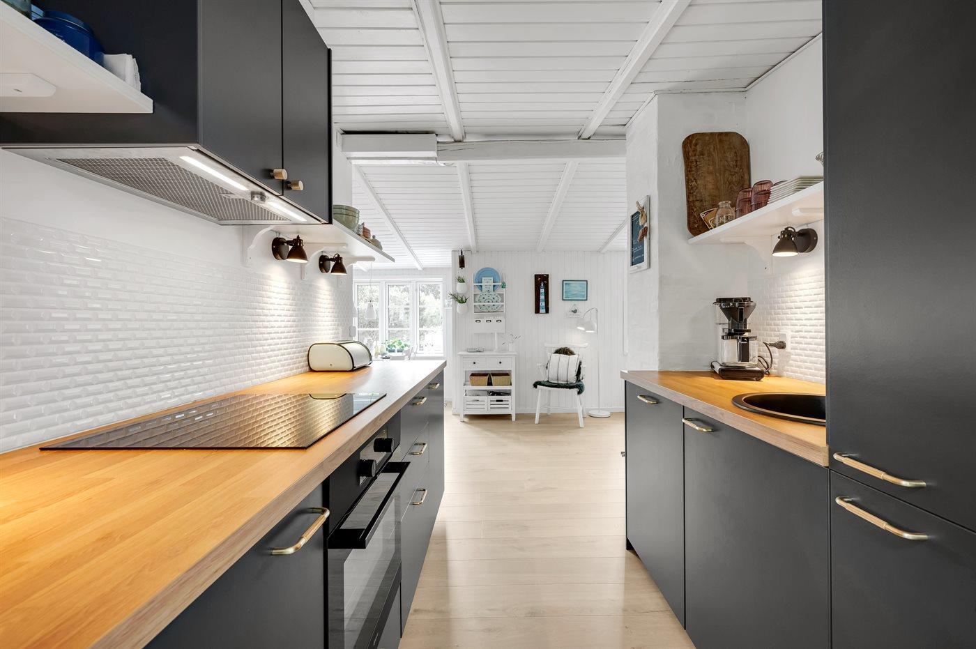 Køkkenet er udstyret med 1 køleskab. Der er 4 keramiske kogeplader, varmluftovn samt opvaskemaskine.