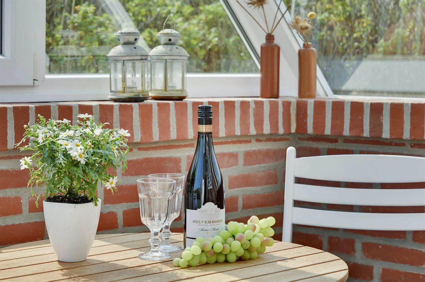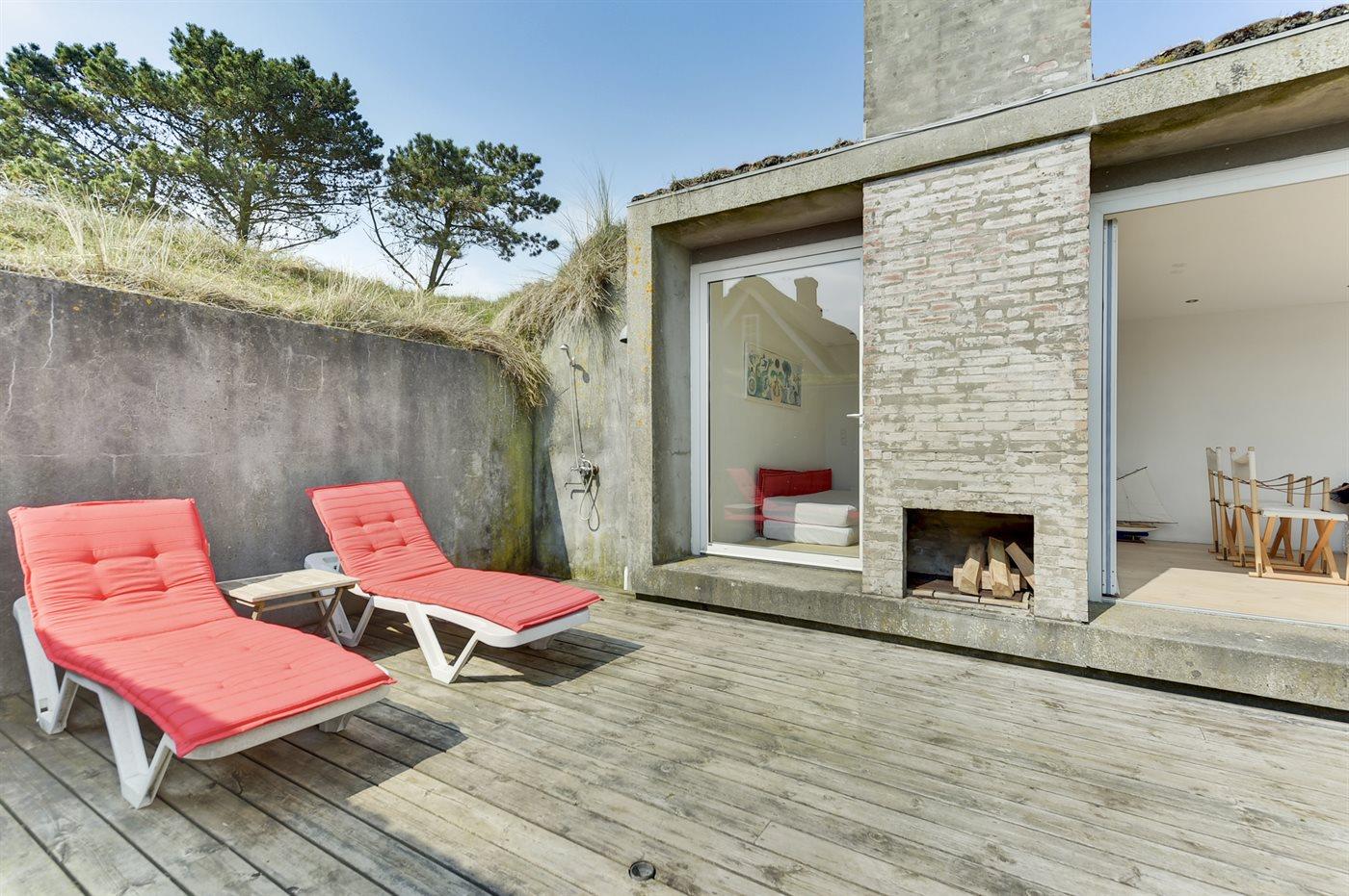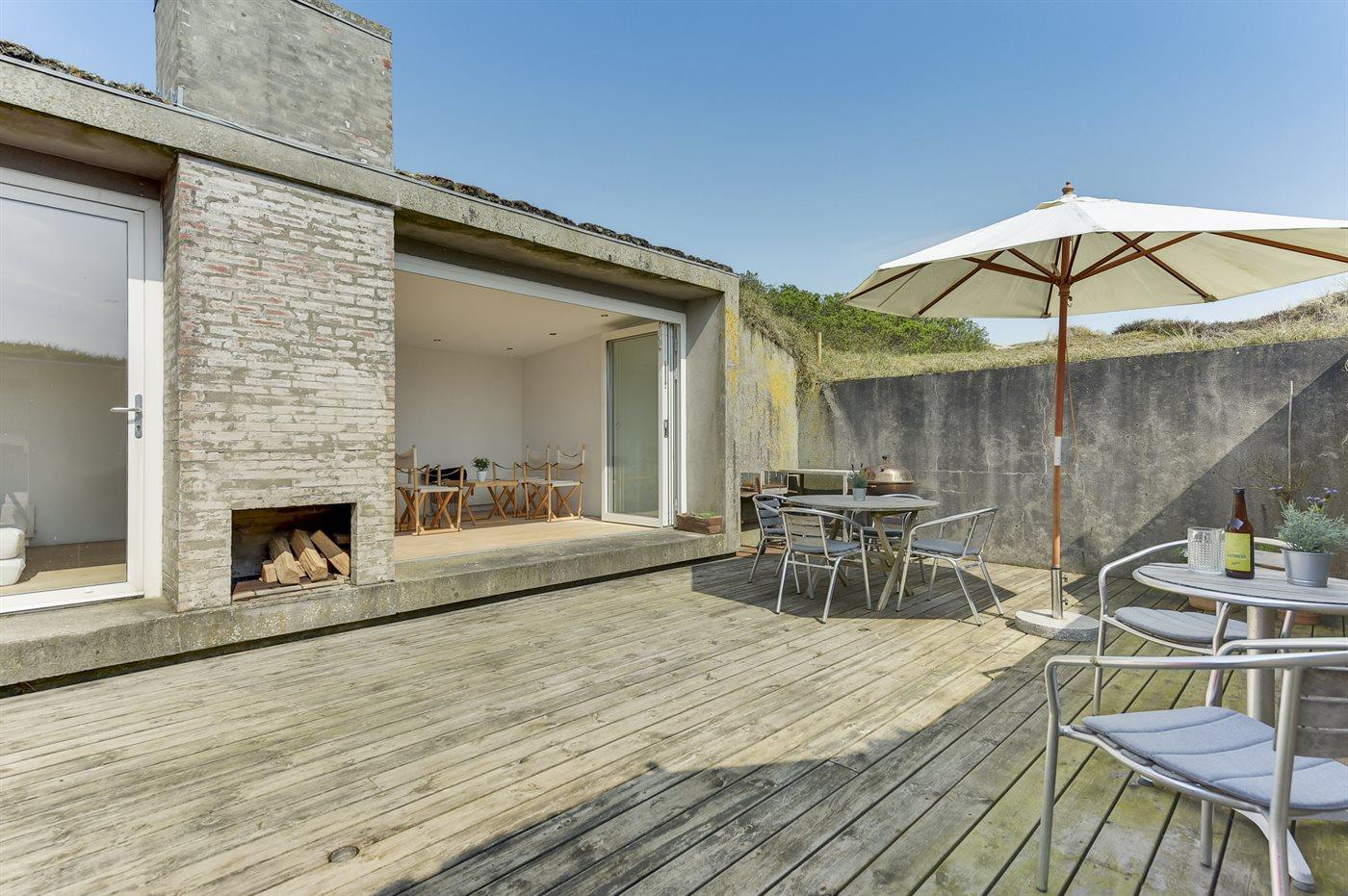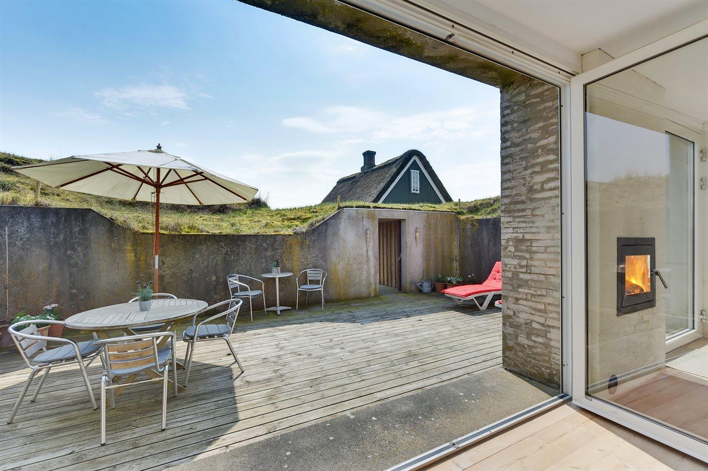 Charmerende sommerhus nær Vesterhavet med hyggelige terrasser og anneks til aktiviteter.