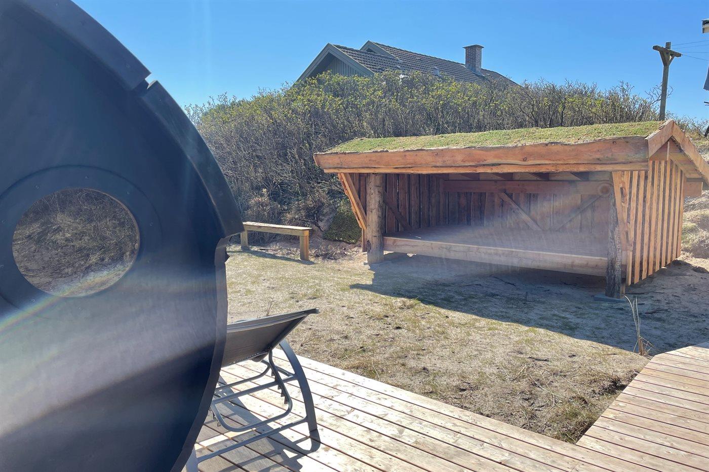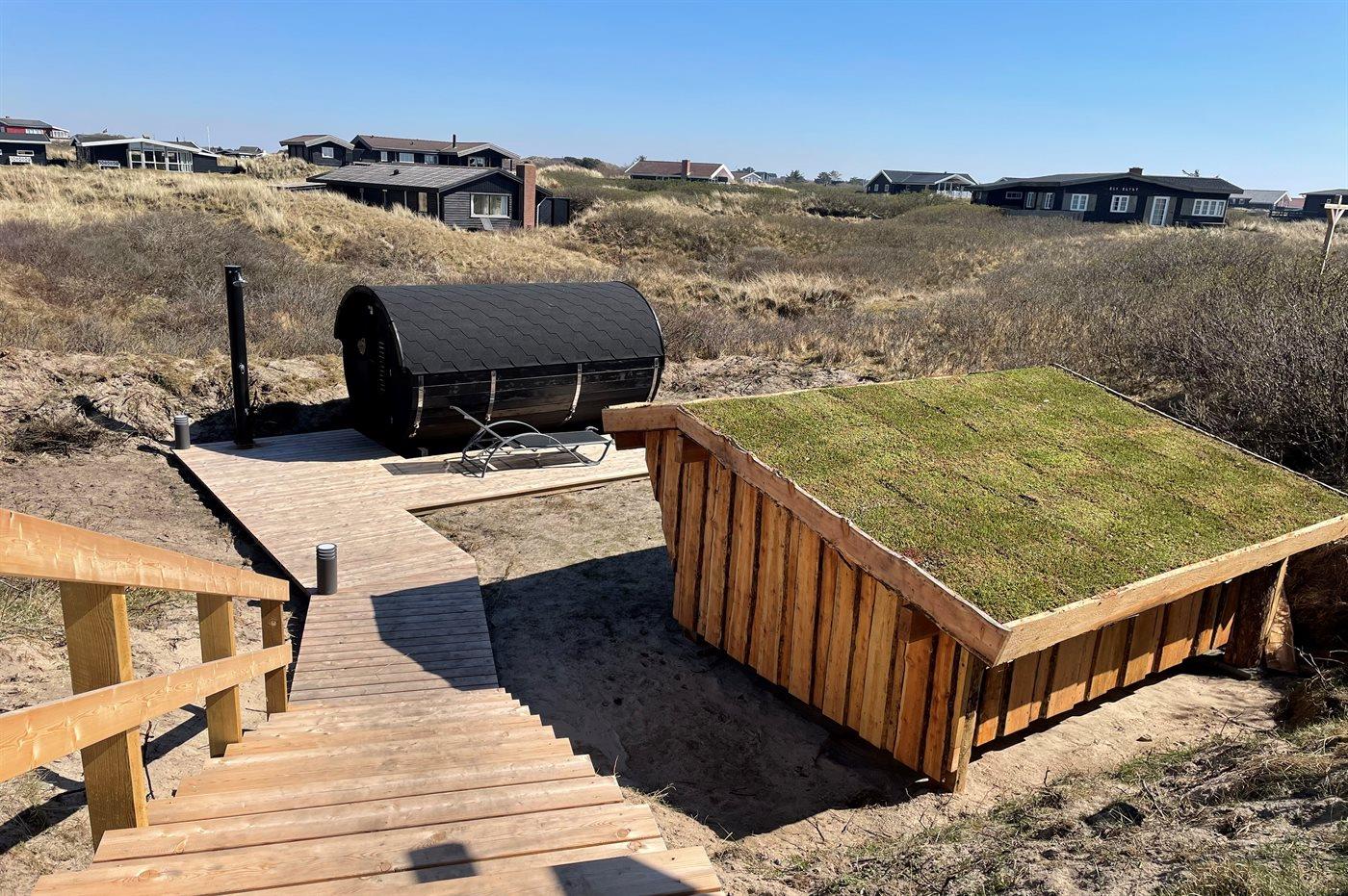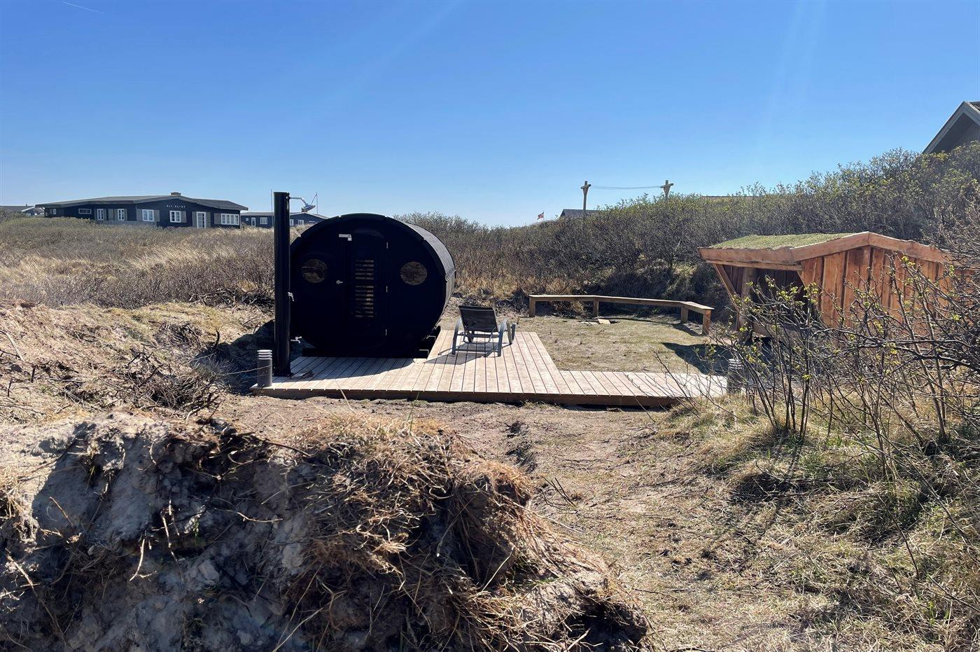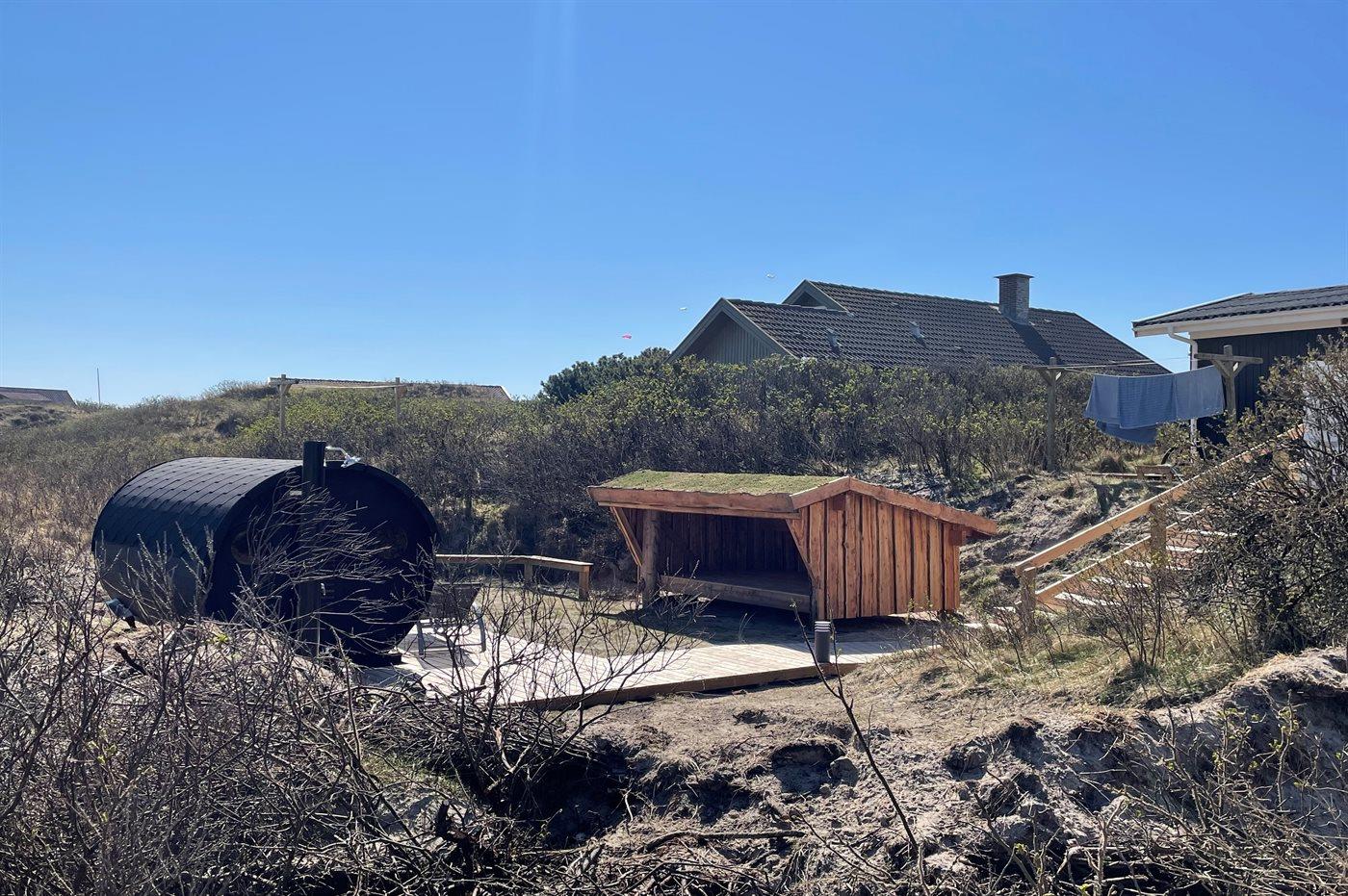 Ferieboligen er beliggende på en 1096 m² stor naturgrund. Der er 100 m til havet. Nærmeste forretning er beliggende i en afstand af 500 m. Der er en golfbane i en afstand af 2500 m. Til ferieboligen hører 48 m² terrasseareal. Desuden er der 12 m² overdækket terrasse. Der er redskabsrum. Shelter. Udendørs sauna. Grill til rådighed. Parkering ved ferieboligen.