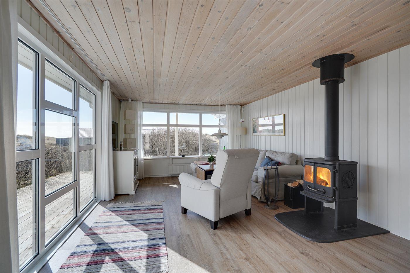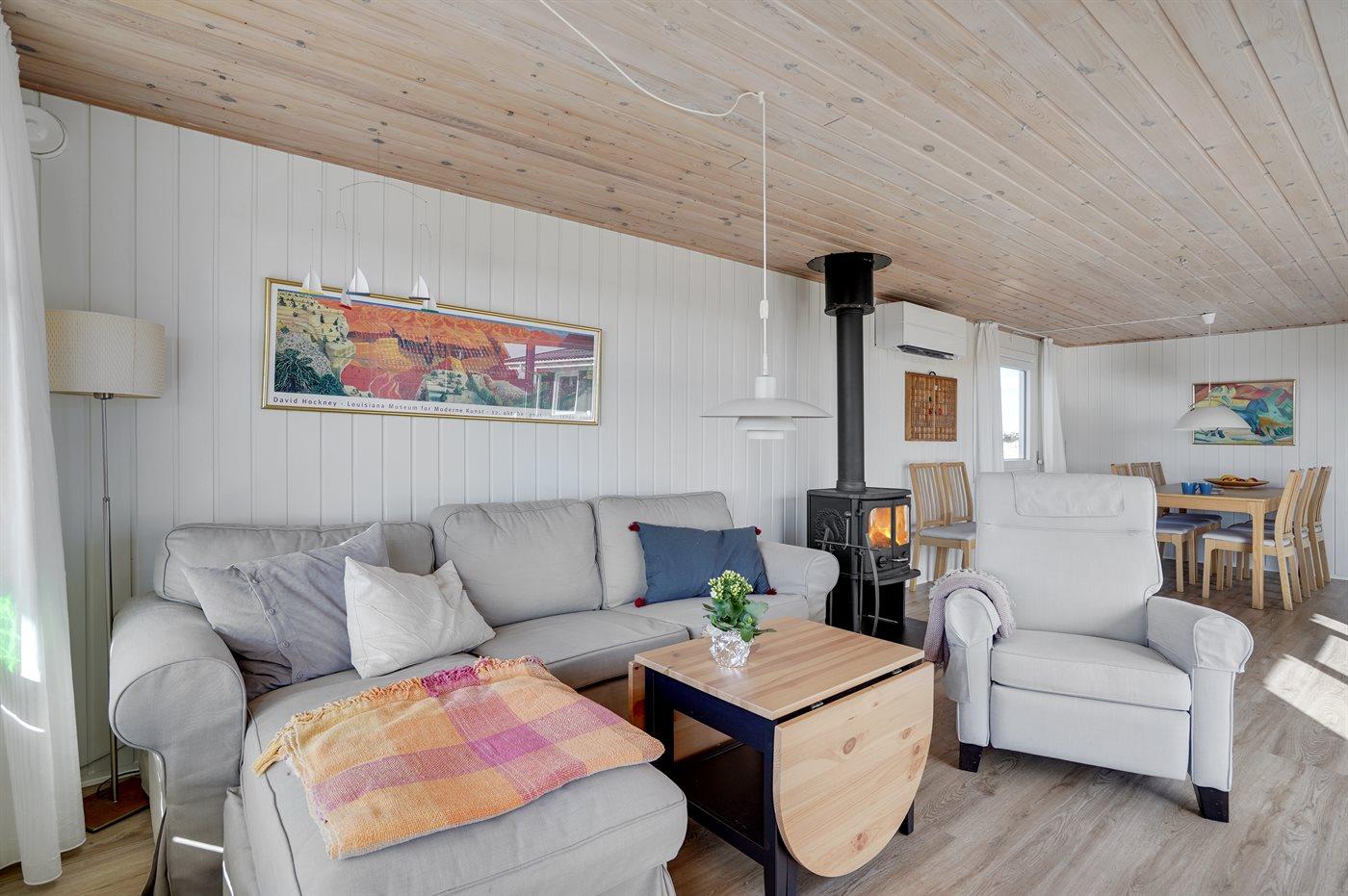 Hyggeligt sommerhus kun 100 m fra stranden med sauna, brændeovn og stor terrasse i Rindby Strand.