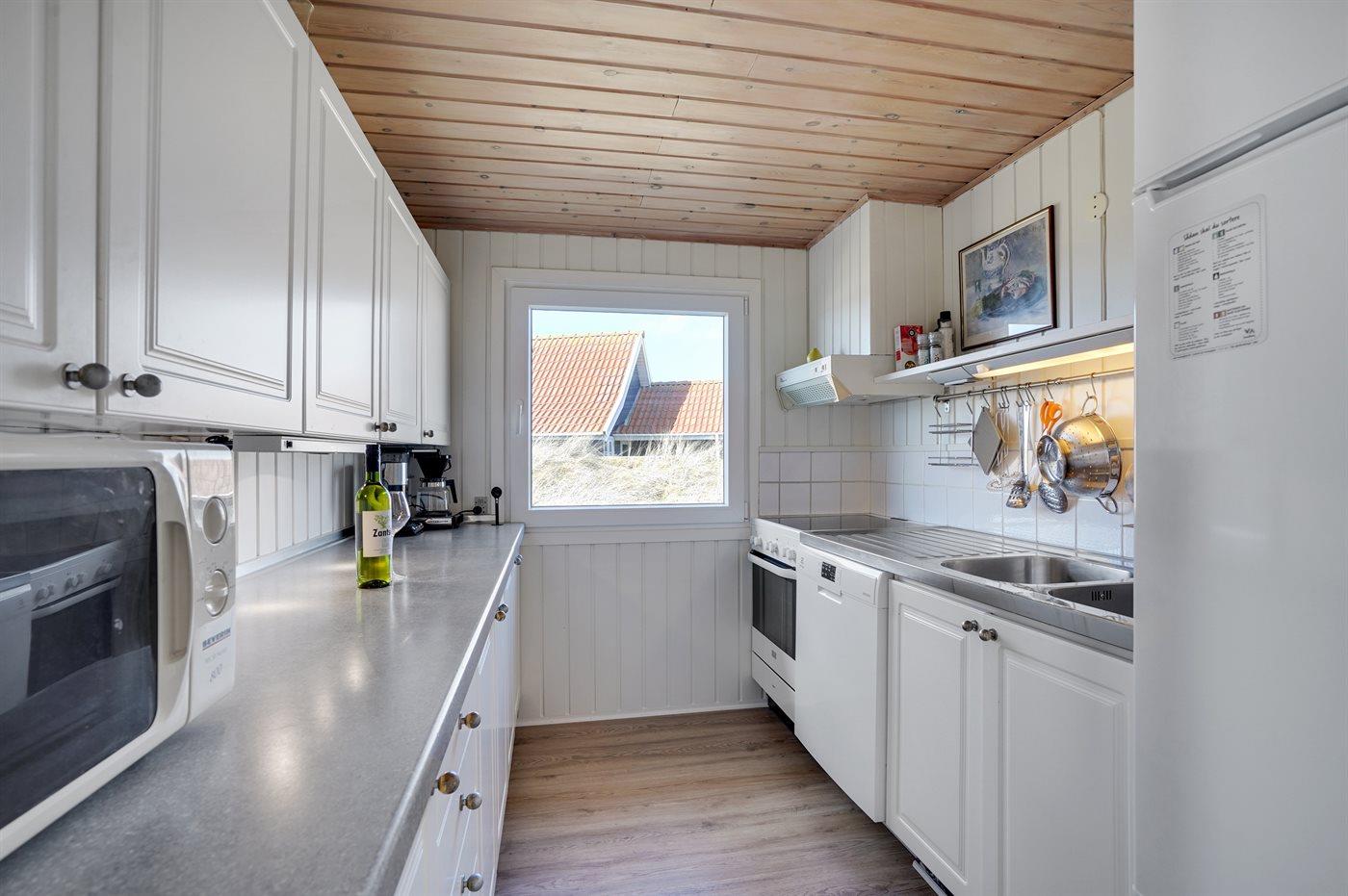 Køkkenet er udstyret med 1 køleskab. Der er 4 keramiske kogeplader, varmluftovn, mikrobølgeovn samt opvaskemaskine Der er gulvvarme i køkkenet.