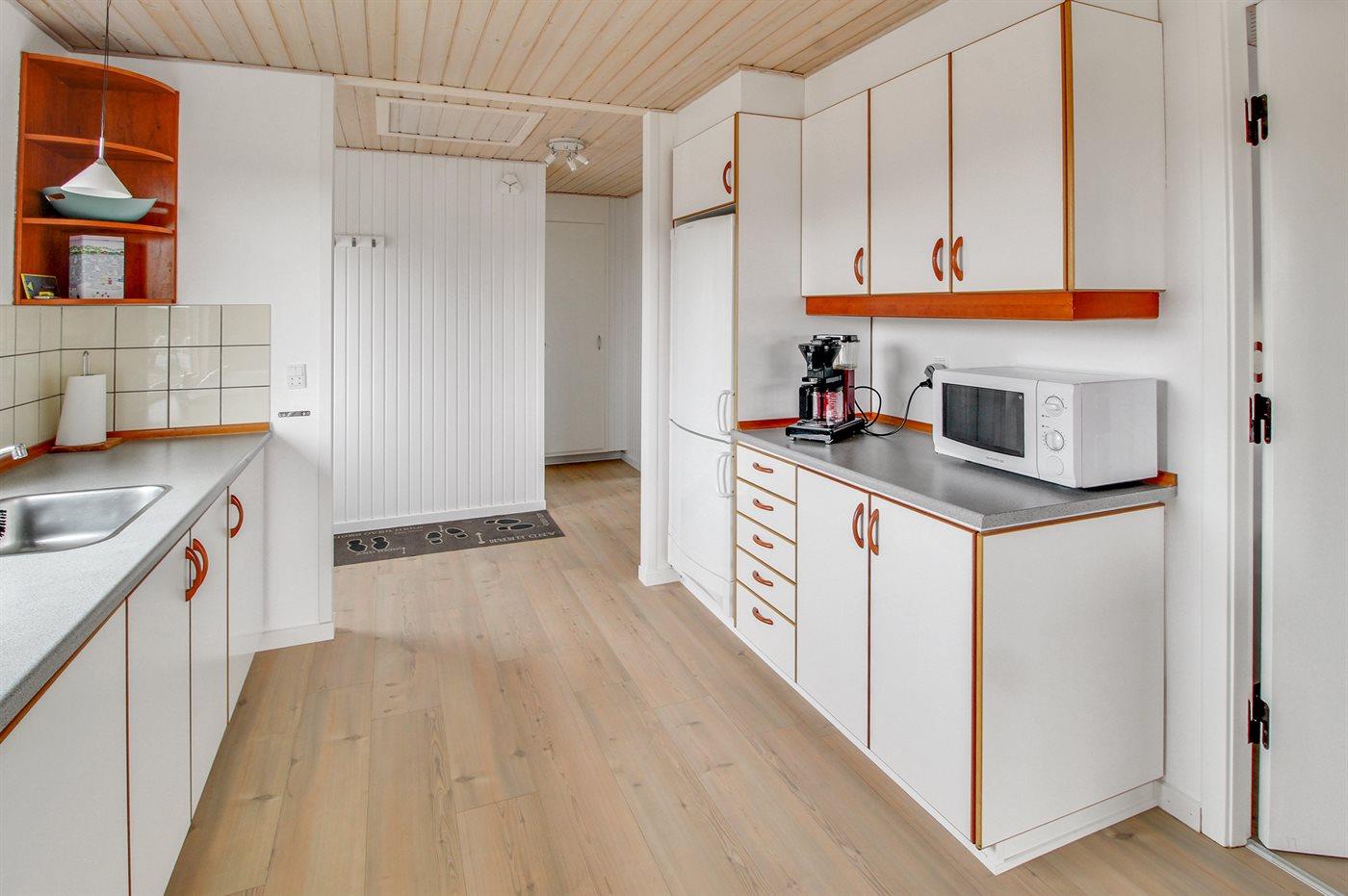 Køkkenet er udstyret med 1 køleskab. Der er 4 elkogeplader, bageovn, mikrobølgeovn.