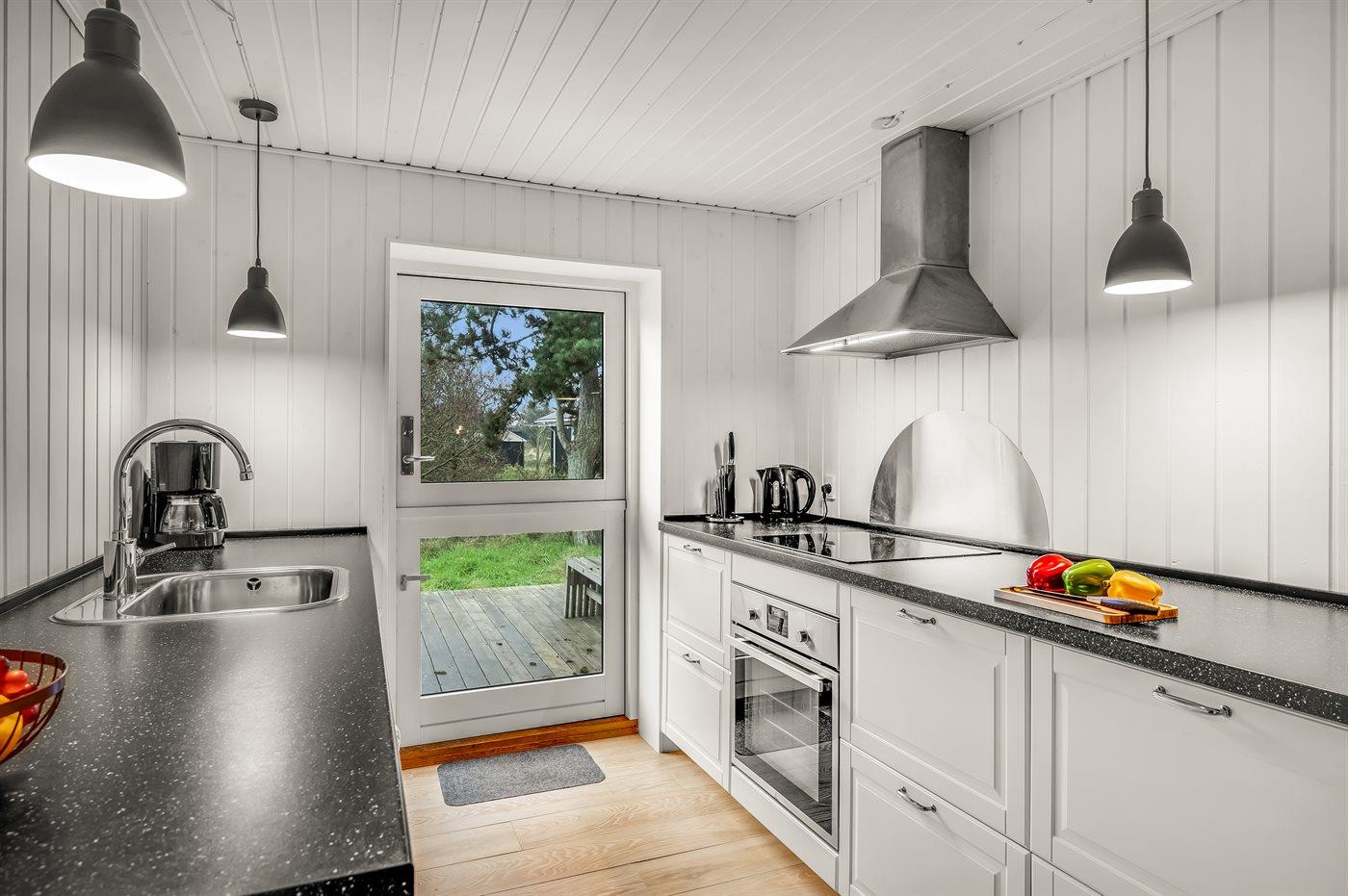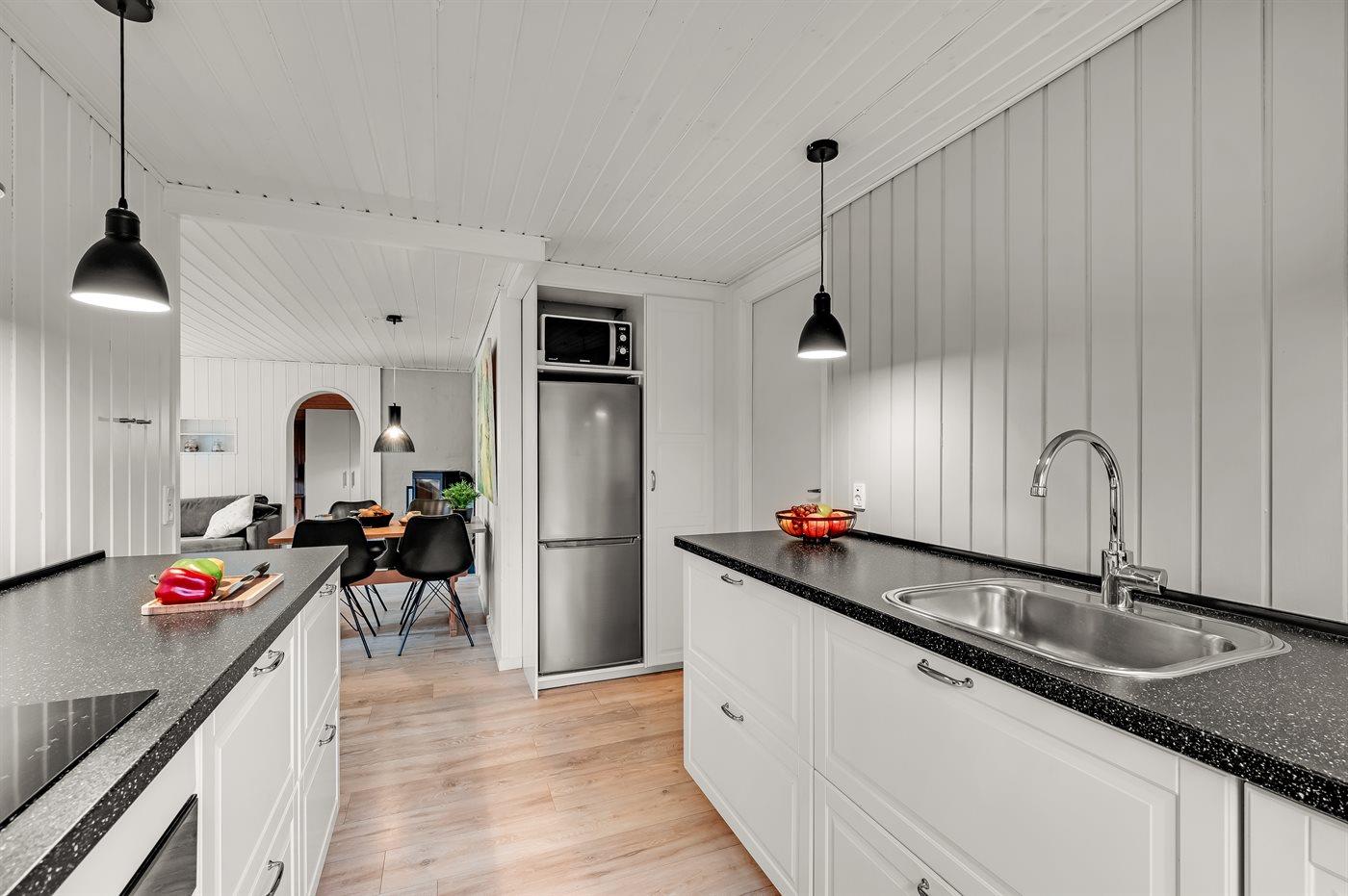 Køkkenet er udstyret med 1 køleskab. Der er 4 keramiske kogeplader, bageovn, mikrobølgeovn samt opvaskemaskine.