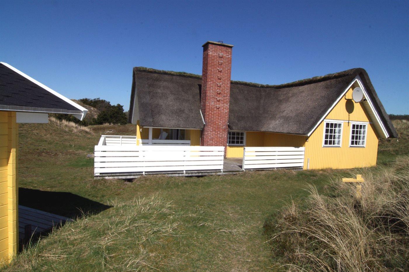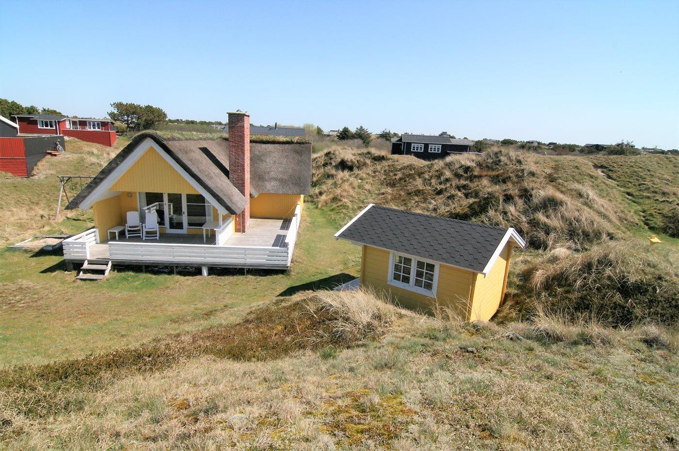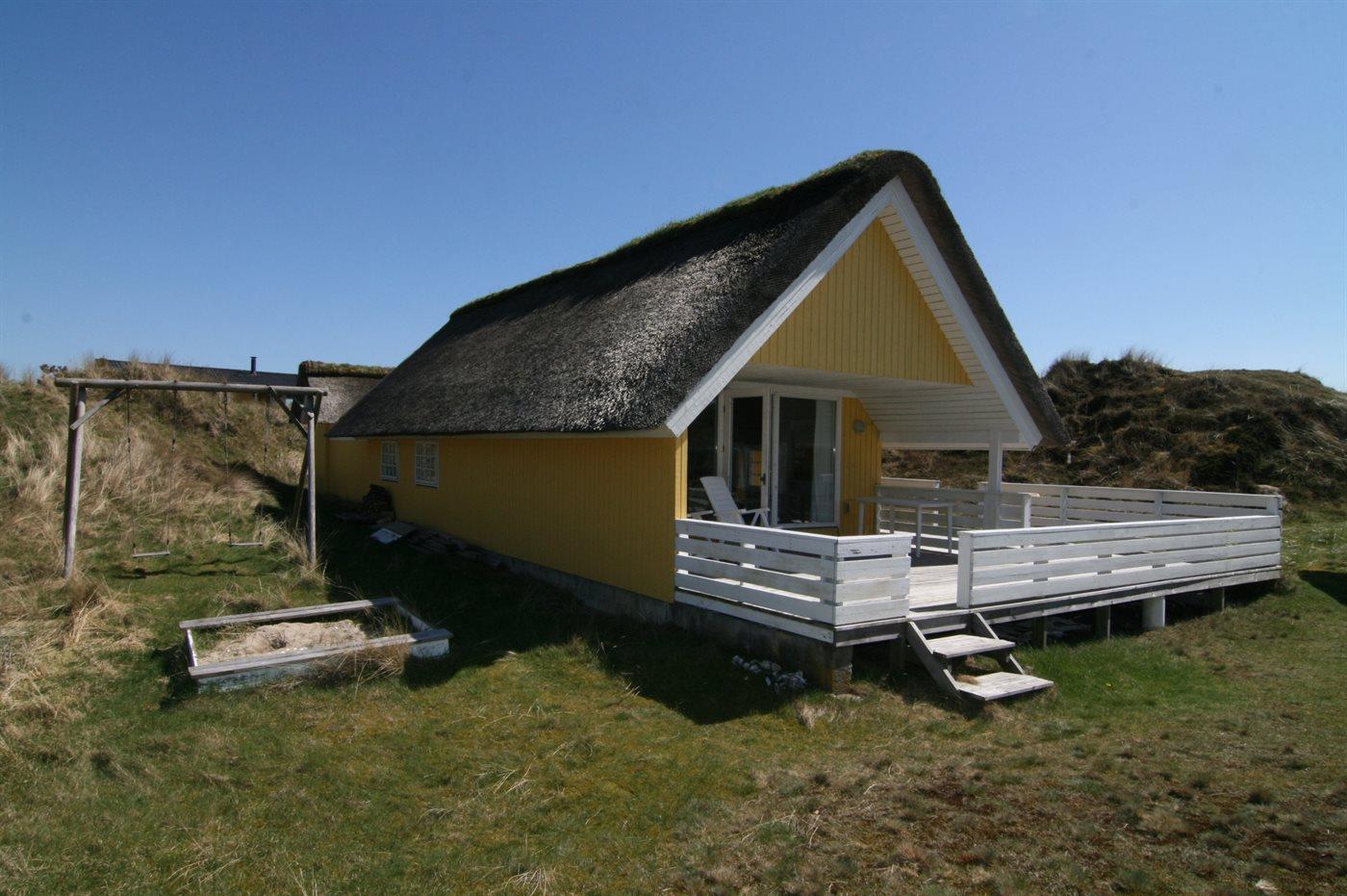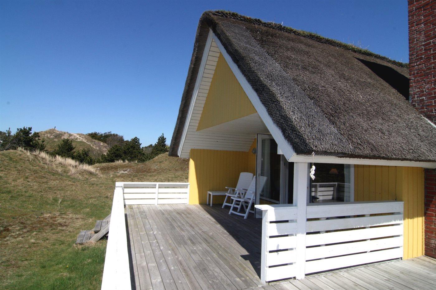Et dejligt, stråtækt feriehus med rolig beliggenhed i ly af klitten, hvorfra der er havudsigt. Huset er hyggeligt indrettet og har nogle rigtig dejlige terrasser. 3 soverum og plads til 5 personer. Trægulve på værelser, i opholdsrum og køkken. Huset ligger vindbeskyttet på en fantastisk grund i et skønt område og kun 200 m fra stranden. Et "rigtigt" sommerhus med sjæl og charme. Annekset er til privat brug.