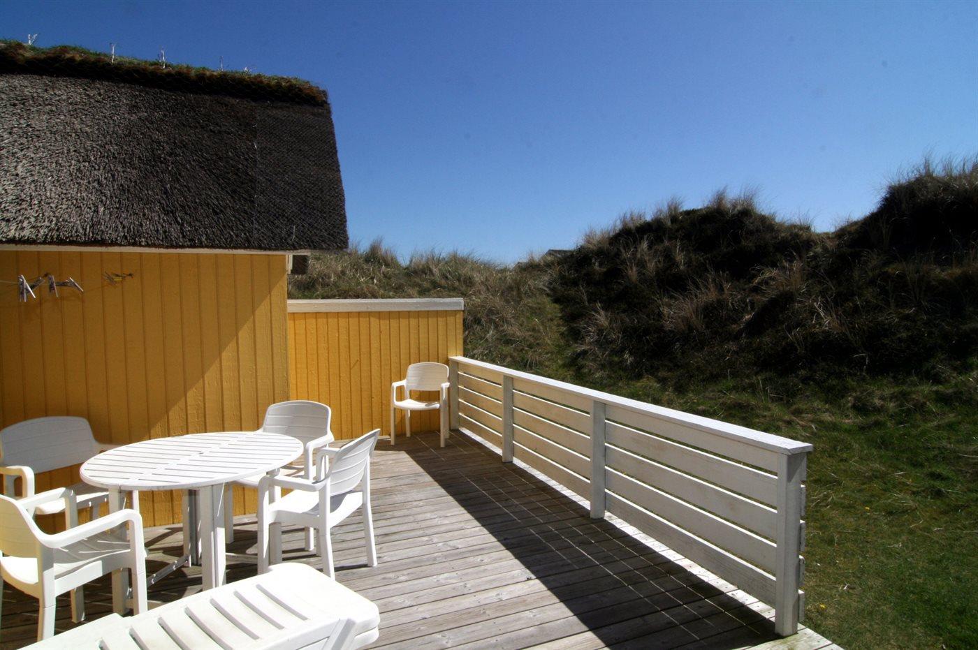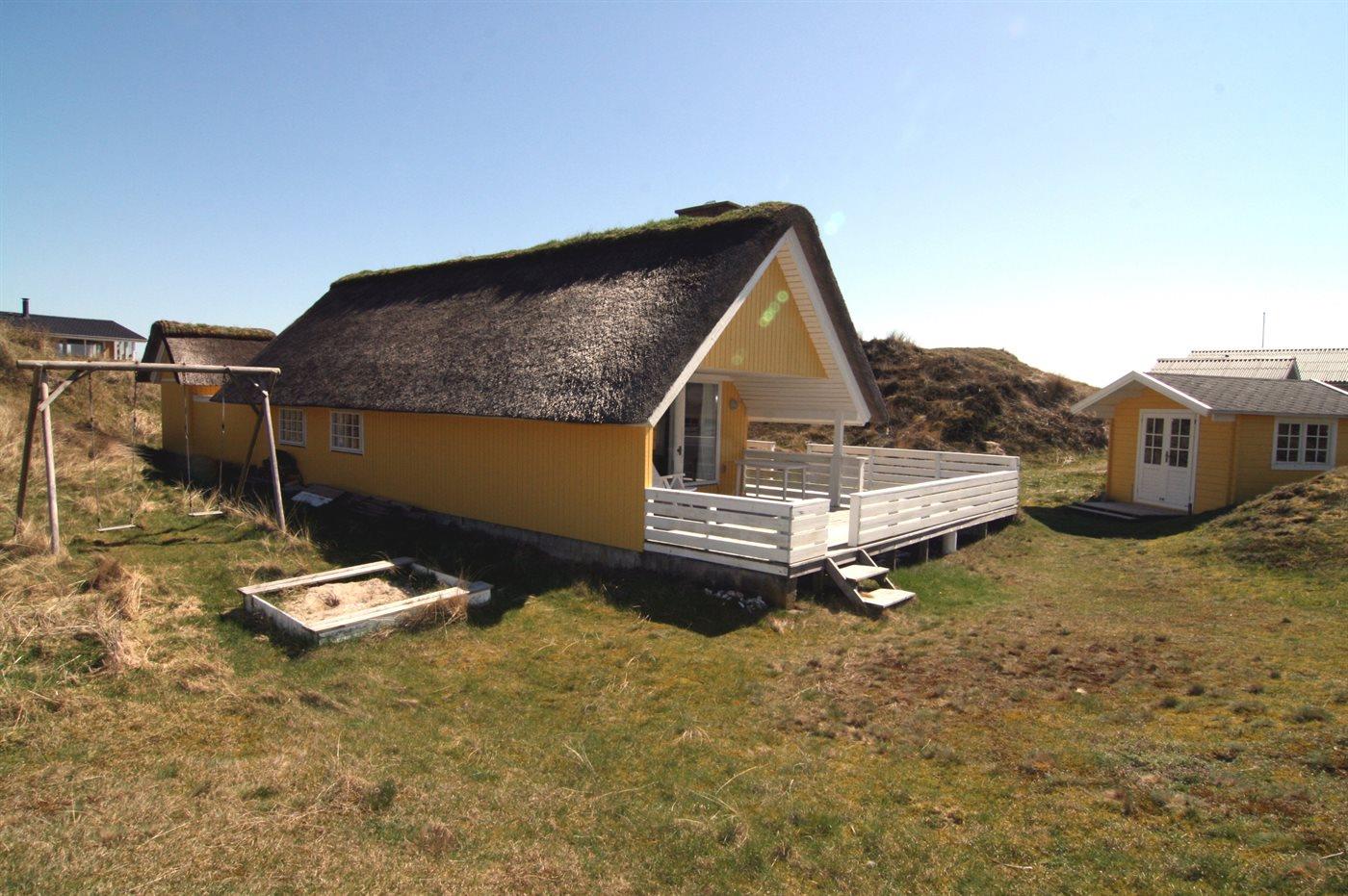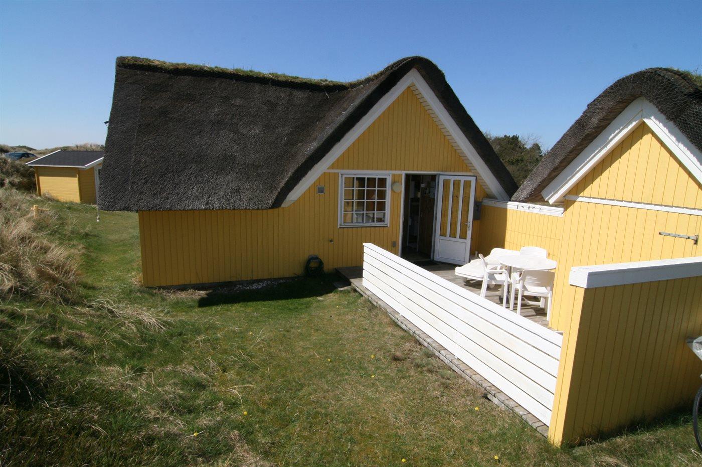 Et dejligt, stråtækt feriehus med rolig beliggenhed i ly af klitten, hvorfra der er havudsigt. Huset er hyggeligt indrettet og har nogle rigtig dejlige terrasser. 3 soverum og plads til 5 personer. Trægulve på værelser, i opholdsrum og køkken. Huset ligger vindbeskyttet på en fantastisk grund i et skønt område og kun 200 m fra stranden. Et "rigtigt" sommerhus med sjæl og charme. Annekset er til privat brug.