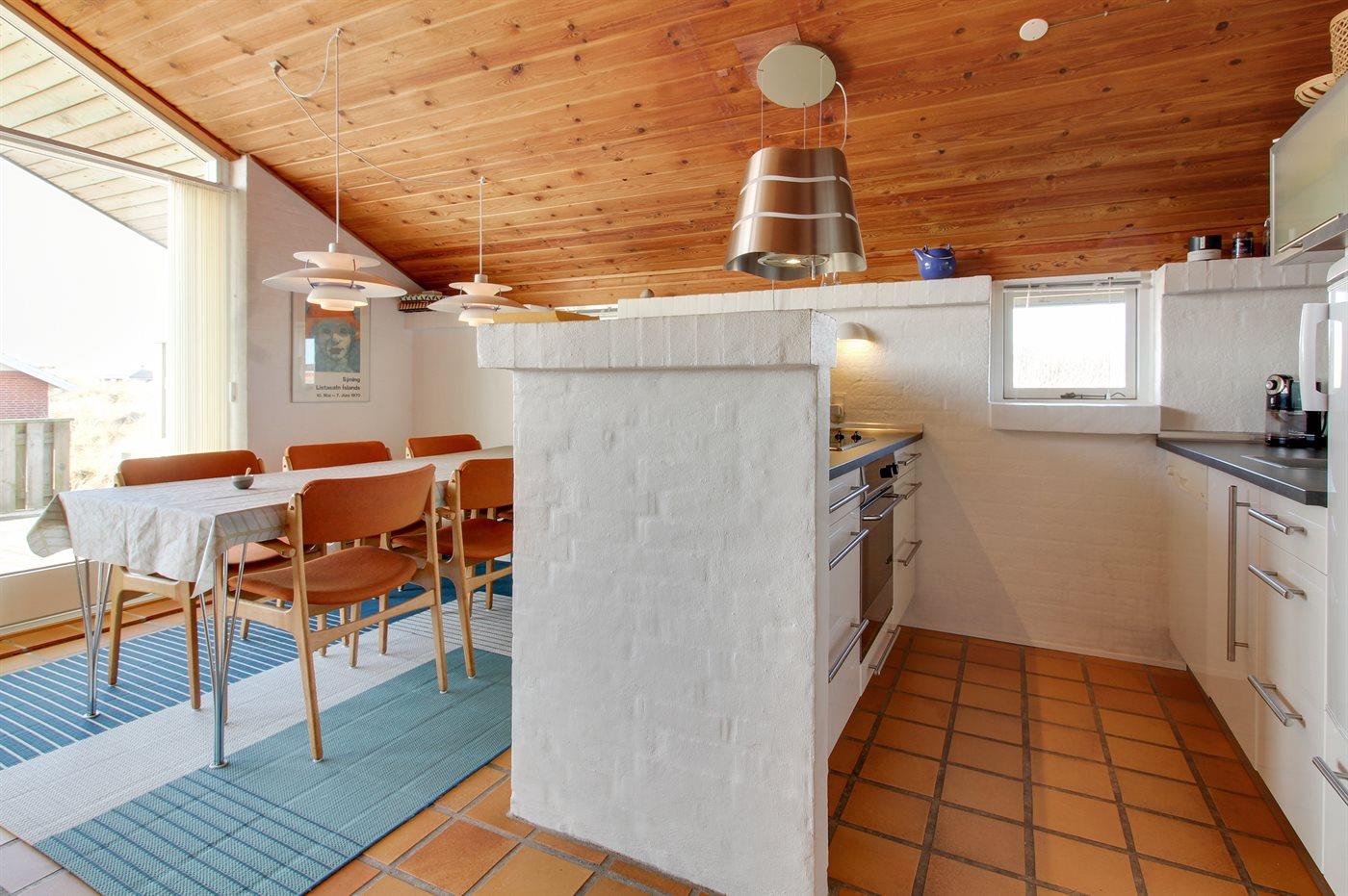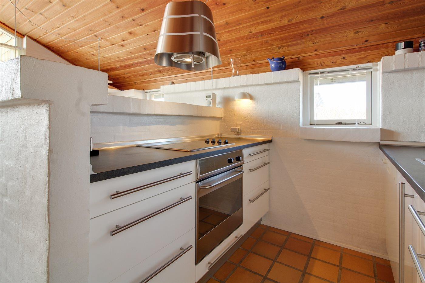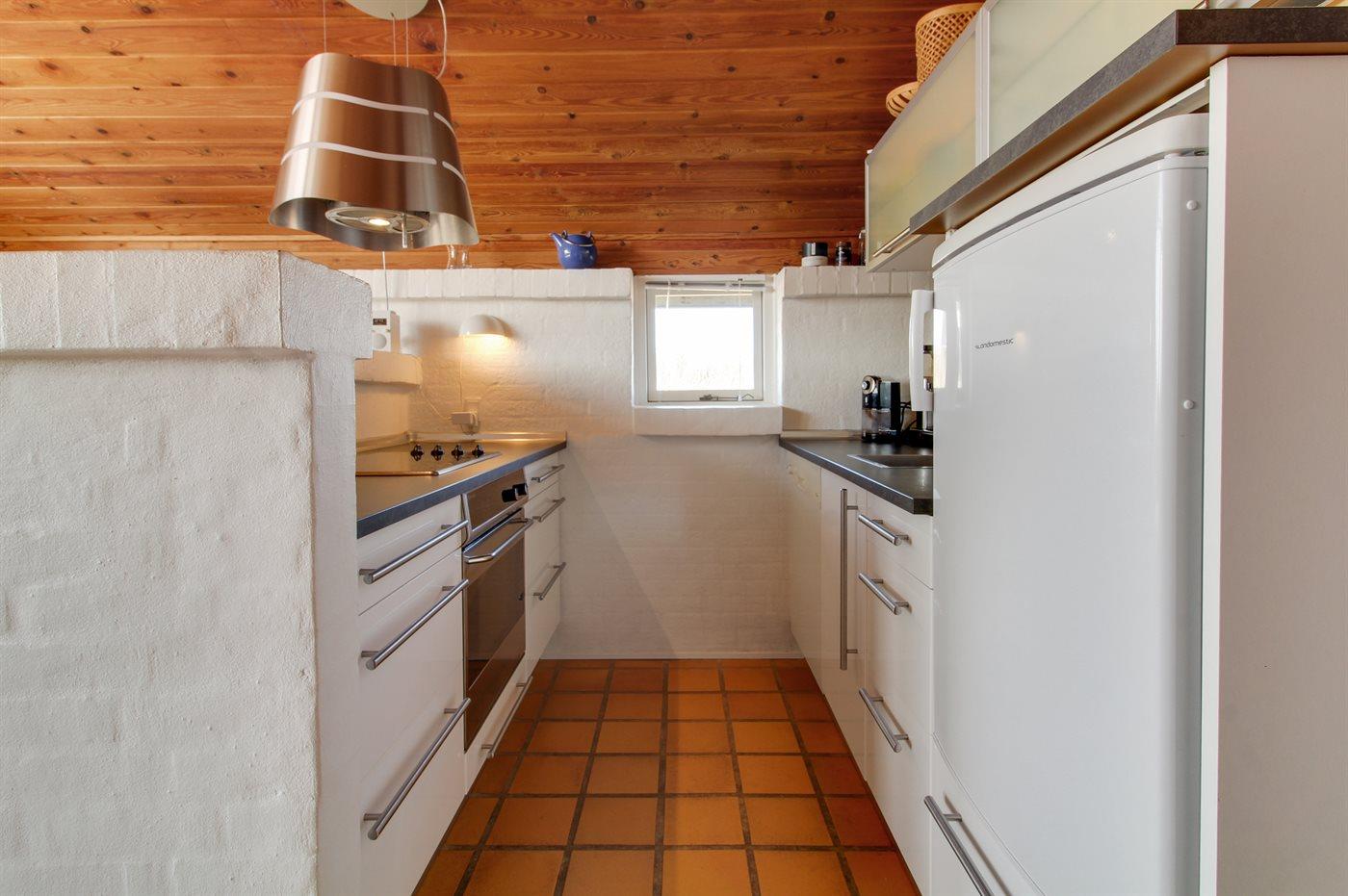 Køkkenet er udstyret med 1 køleskab. Der er 4 keramiske kogeplader, varmluftovn samt opvaskemaskine.