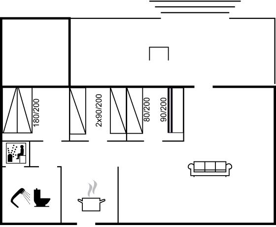 Der er i alt 3 soveværelser. Sovepladserne fordeler sig på: 2 sovepladser i dobbeltseng. 3 sovepladser i enkeltsenge. 2 sovepladser i køjeseng. Derudover er der 1 stk. barneseng.