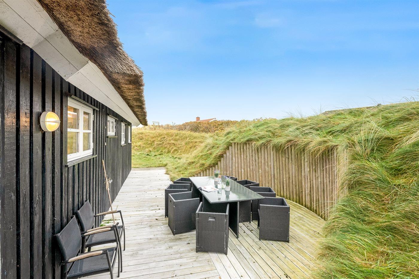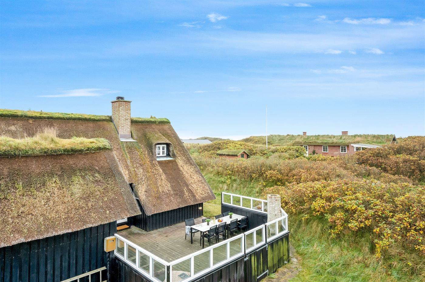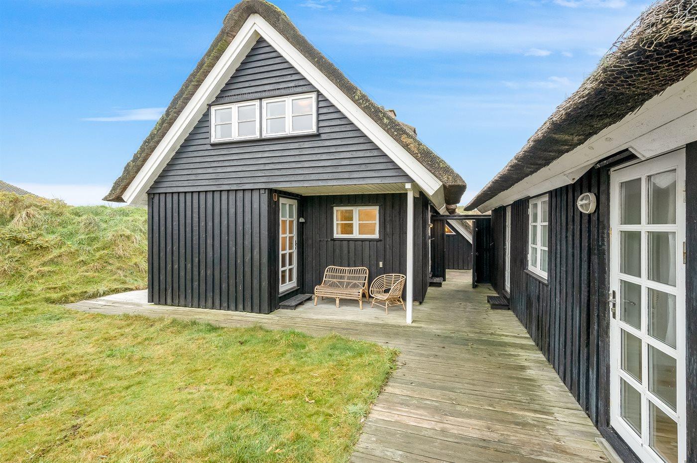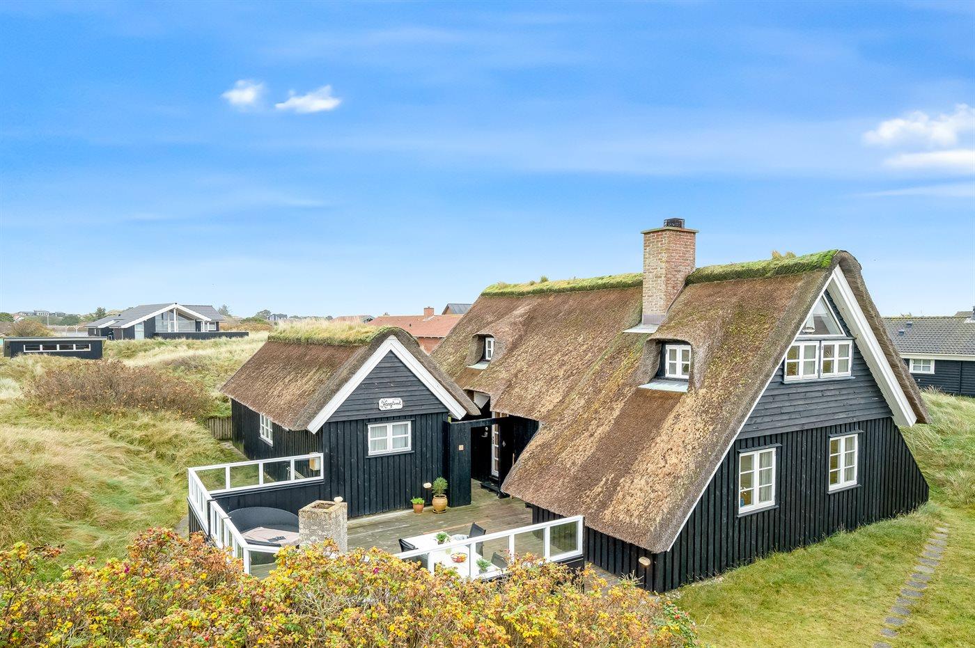 Tæt på stranden ligger dette store stråtækte sommerhus på en kuperet klitgrund med store terrasser, hvor solen kan nydes dagen lang. Indretningen er smagfuld og personlig, og huset egner sig godt til familier med børn. Da sommerhuset blev bygget, kunne man se havet fra den ene opholdsstue i stueetagen. Fanøs klitgrund er imidlertid i stadig forandring, og klitterne foran huset er vokset - men man kan stadig se glimt af havet fra den ekstra opholdsstue på første etage. Der er 2 parkeringspladser ved huset.