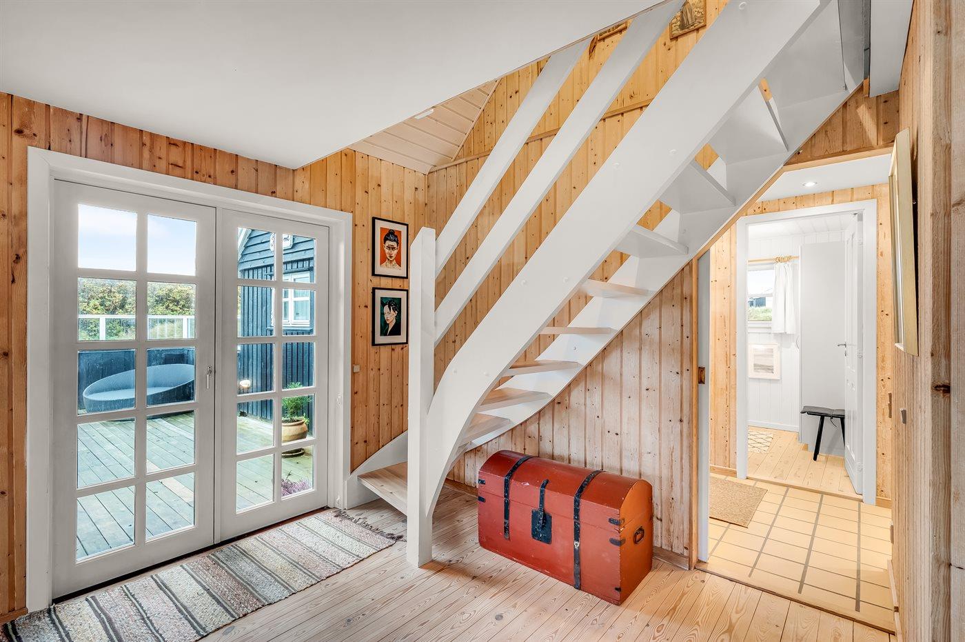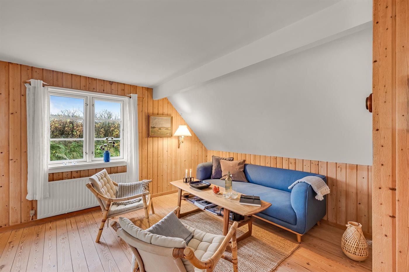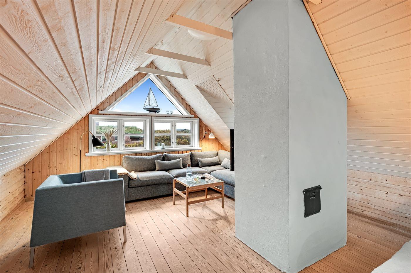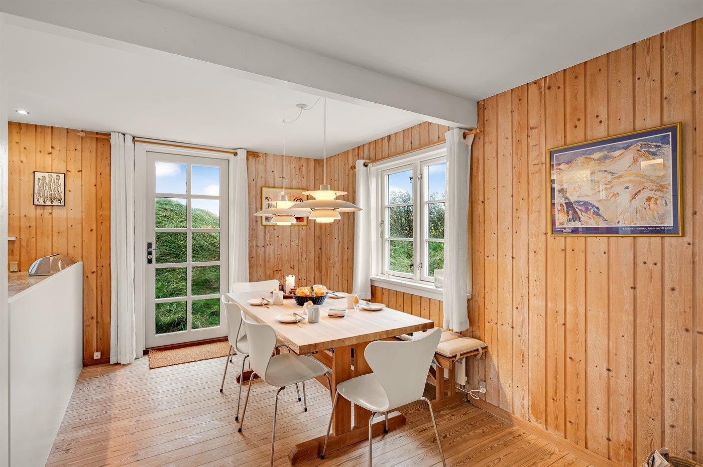 Tæt på stranden ligger dette store stråtækte sommerhus på en kuperet klitgrund med store terrasser, hvor solen kan nydes dagen lang. Indretningen er smagfuld og personlig, og huset egner sig godt til familier med børn. Da sommerhuset blev bygget, kunne man se havet fra den ene opholdsstue i stueetagen. Fanøs klitgrund er imidlertid i stadig forandring, og klitterne foran huset er vokset - men man kan stadig se glimt af havet fra den ekstra opholdsstue på første etage. Der er 2 parkeringspladser ved huset.