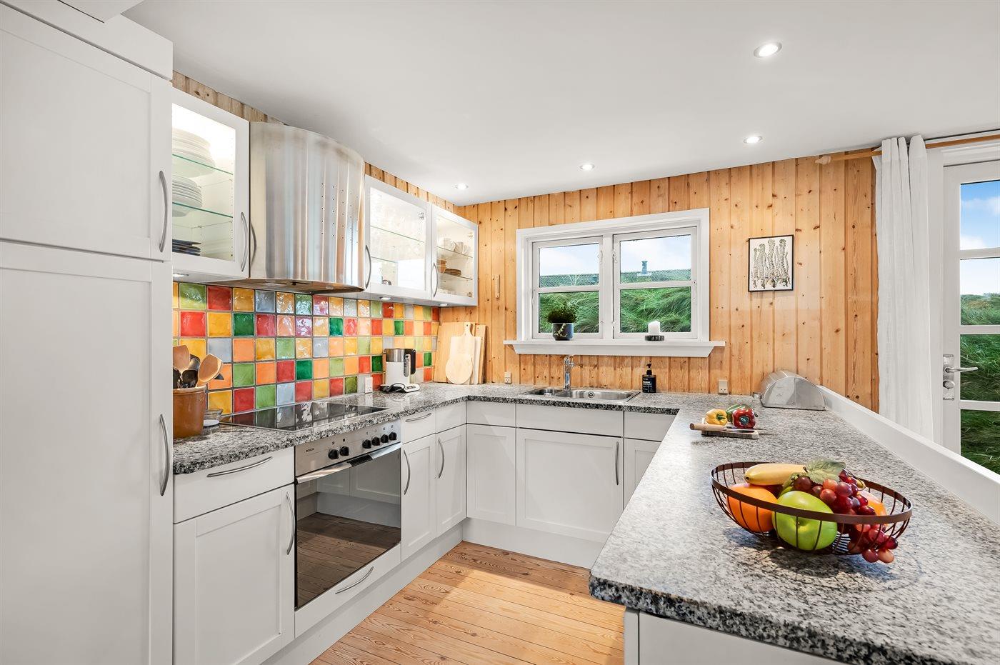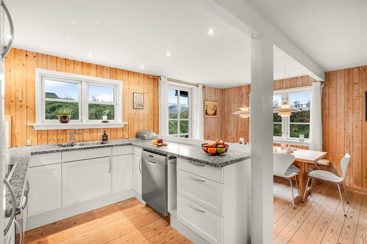 Køkkenet er udstyret med 1 køleskab. Der er 4 keramiske kogeplader, varmluftovn, mikrobølgeovn samt opvaskemaskine.