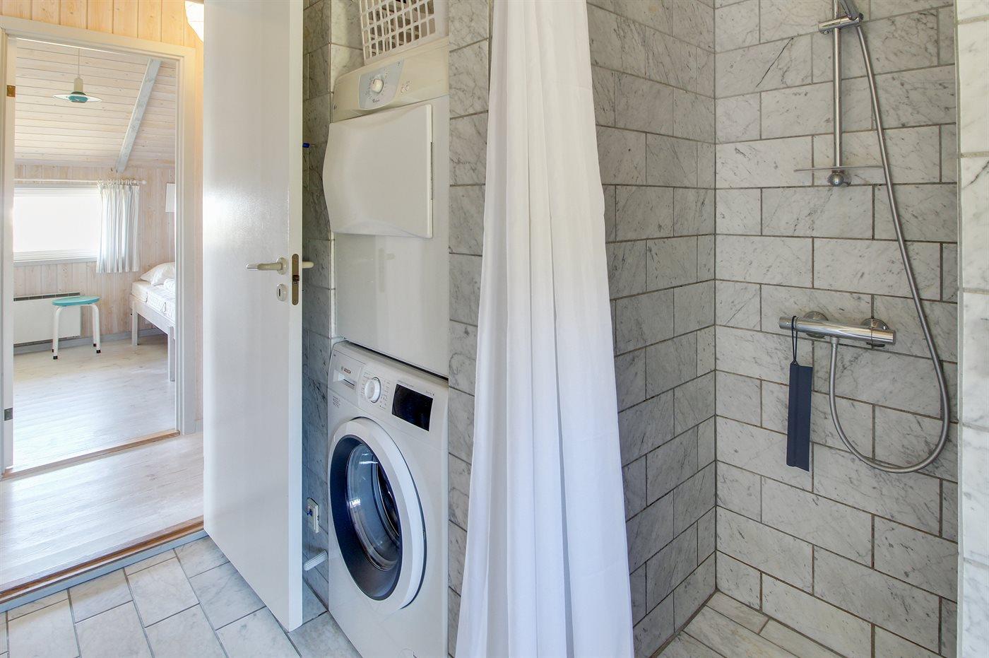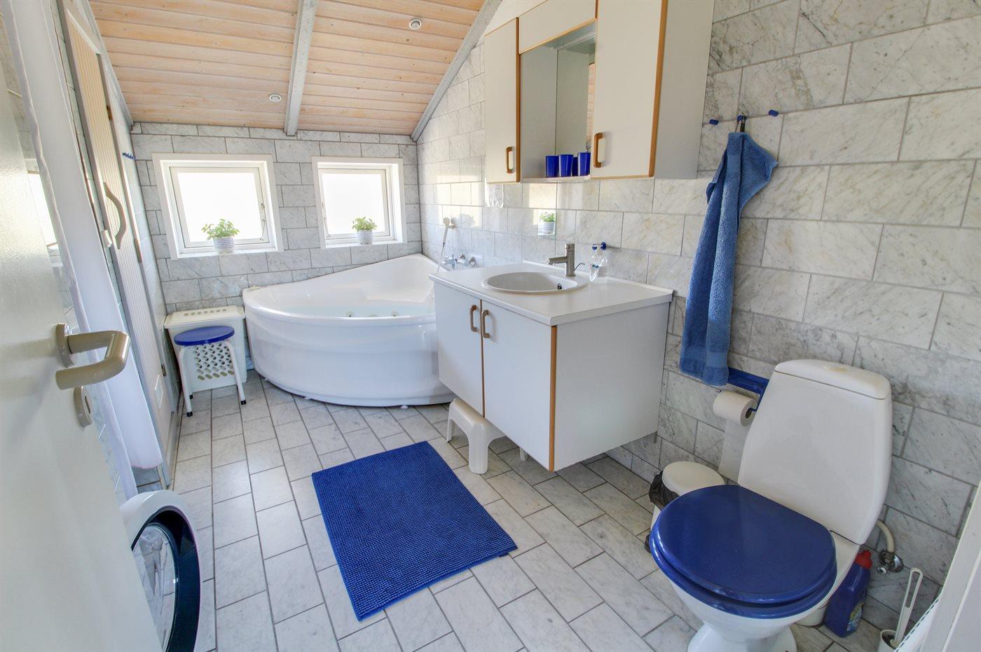 Der er 1 badeværelse med bruseniche og 2 toiletter, heraf 1 gæstetoilet. Der er gulvvarme på 1 badeværelse. Der er gulvvarme på gæstetoilettet. I saunaen er der mulighed for afslapning.