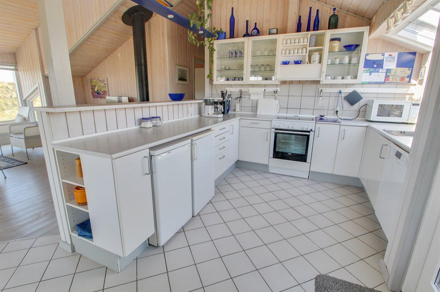 Køkkenet er udstyret med 1 køleskab. Der er 4 keramiske kogeplader, varmluftovn, mikrobølgeovn samt opvaskemaskine.