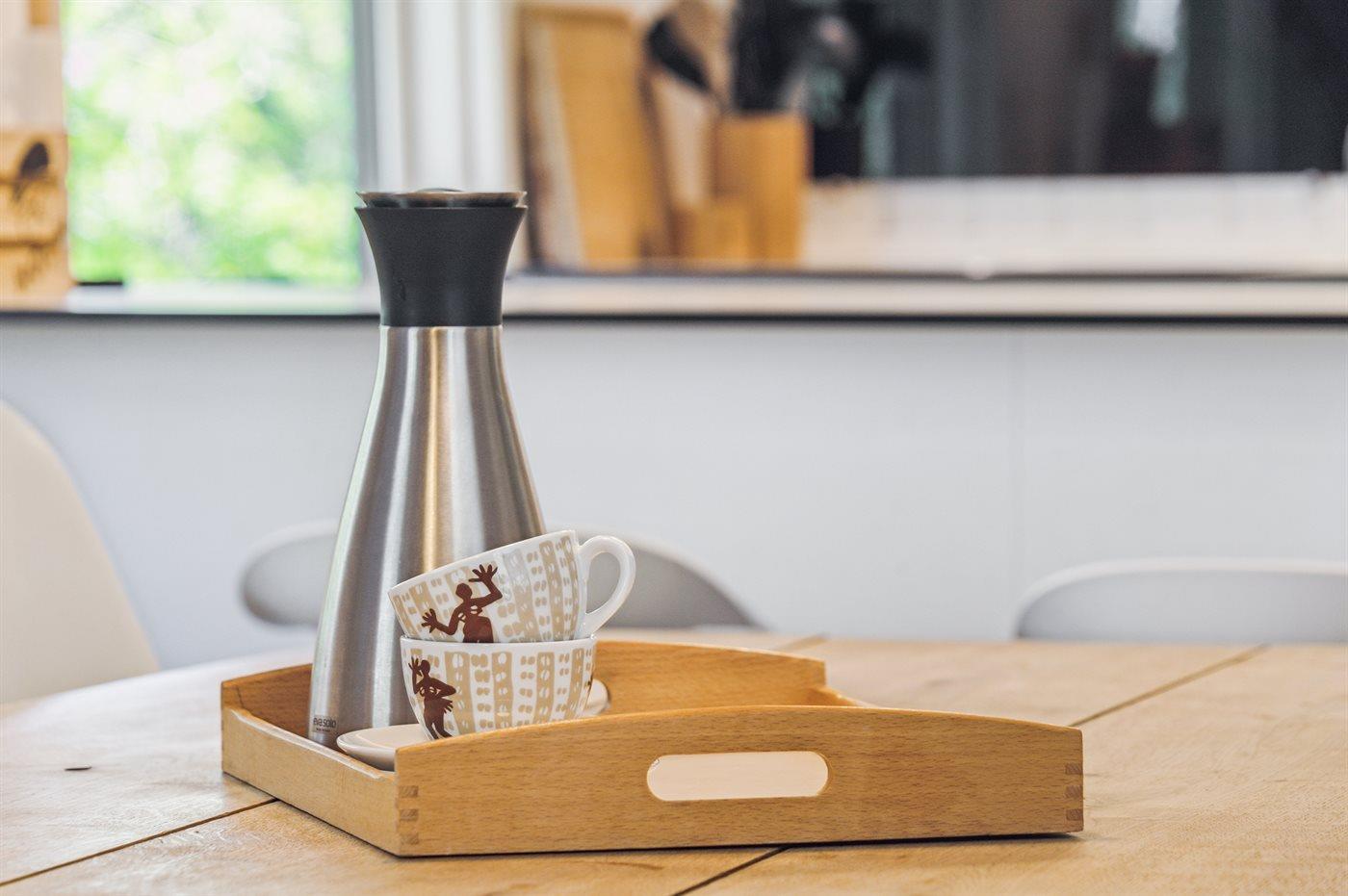 Køkkenet er udstyret med 1 køleskab. Der er 4 keramiske kogeplader, varmluftovn, mikrobølgeovn samt opvaskemaskine.