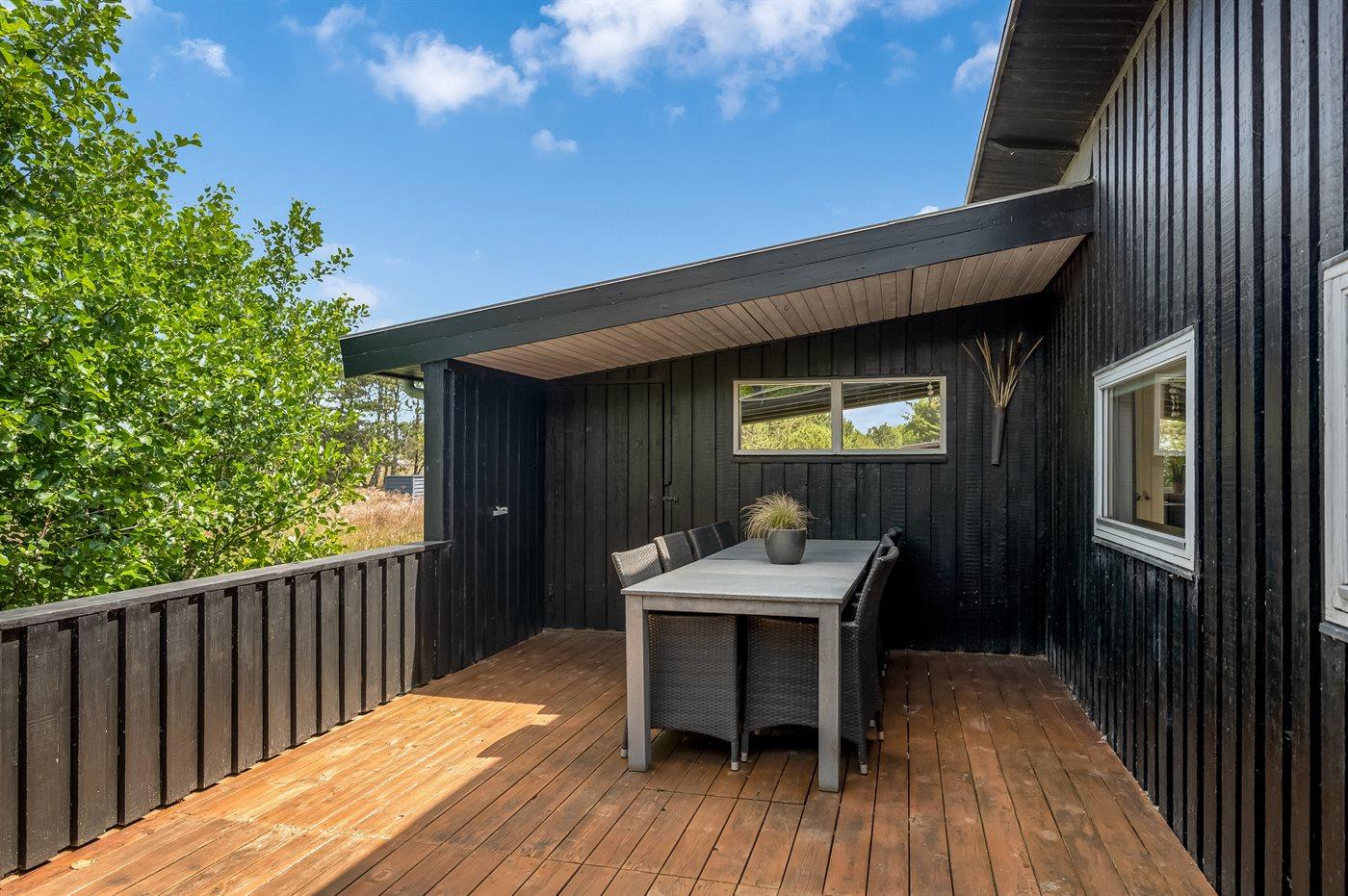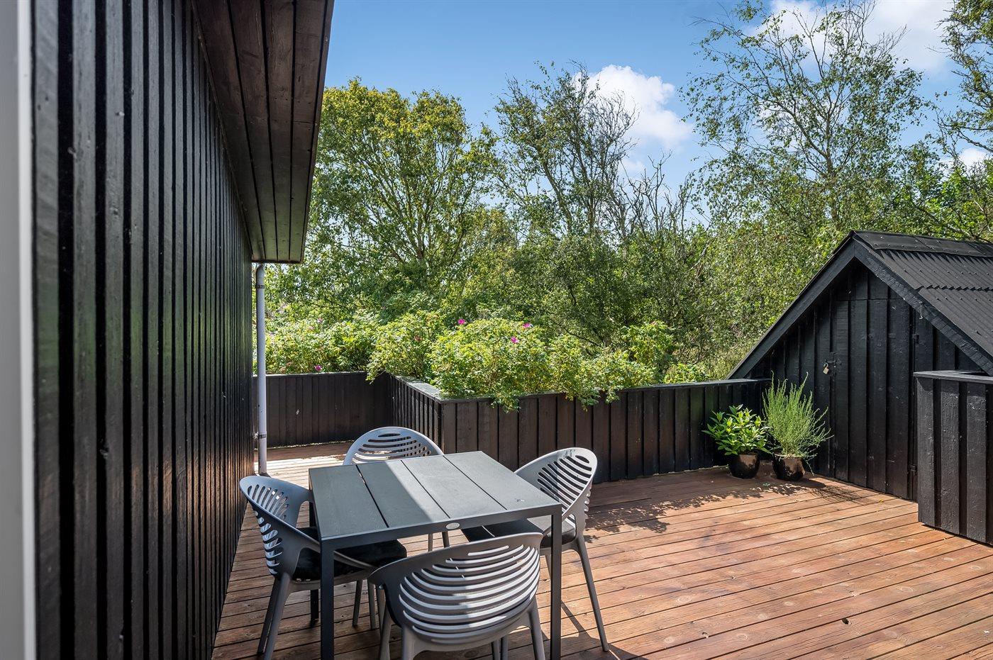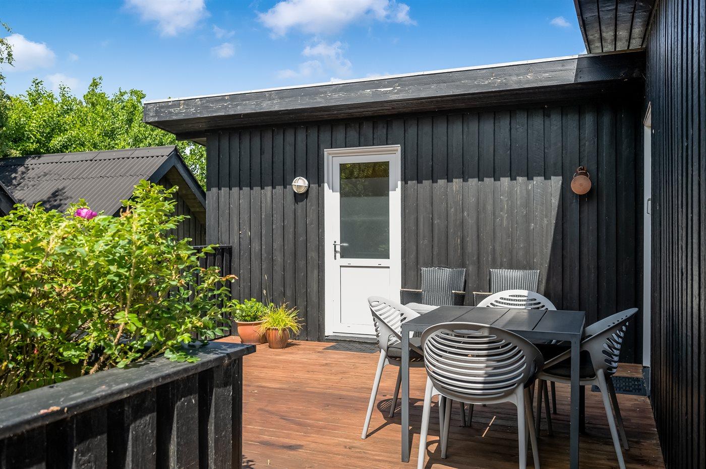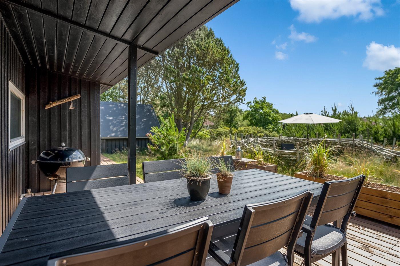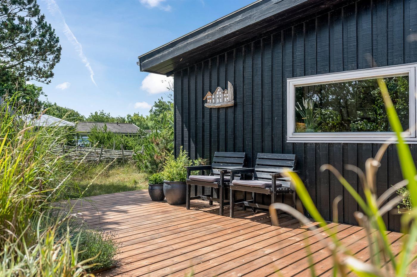 Udendørs byder sommerhuset på fire skønne terrasser, hvor solen kan nydes dagen lang. Den nordvendte terrasse er lukket, mens den sydvendte netop er blevet renoveret. Den store naturgrund på 1.807 m² giver rig mulighed for udeliv, og med kun 1 km til havet er der kort afstand til Fanøs smukke strande.
