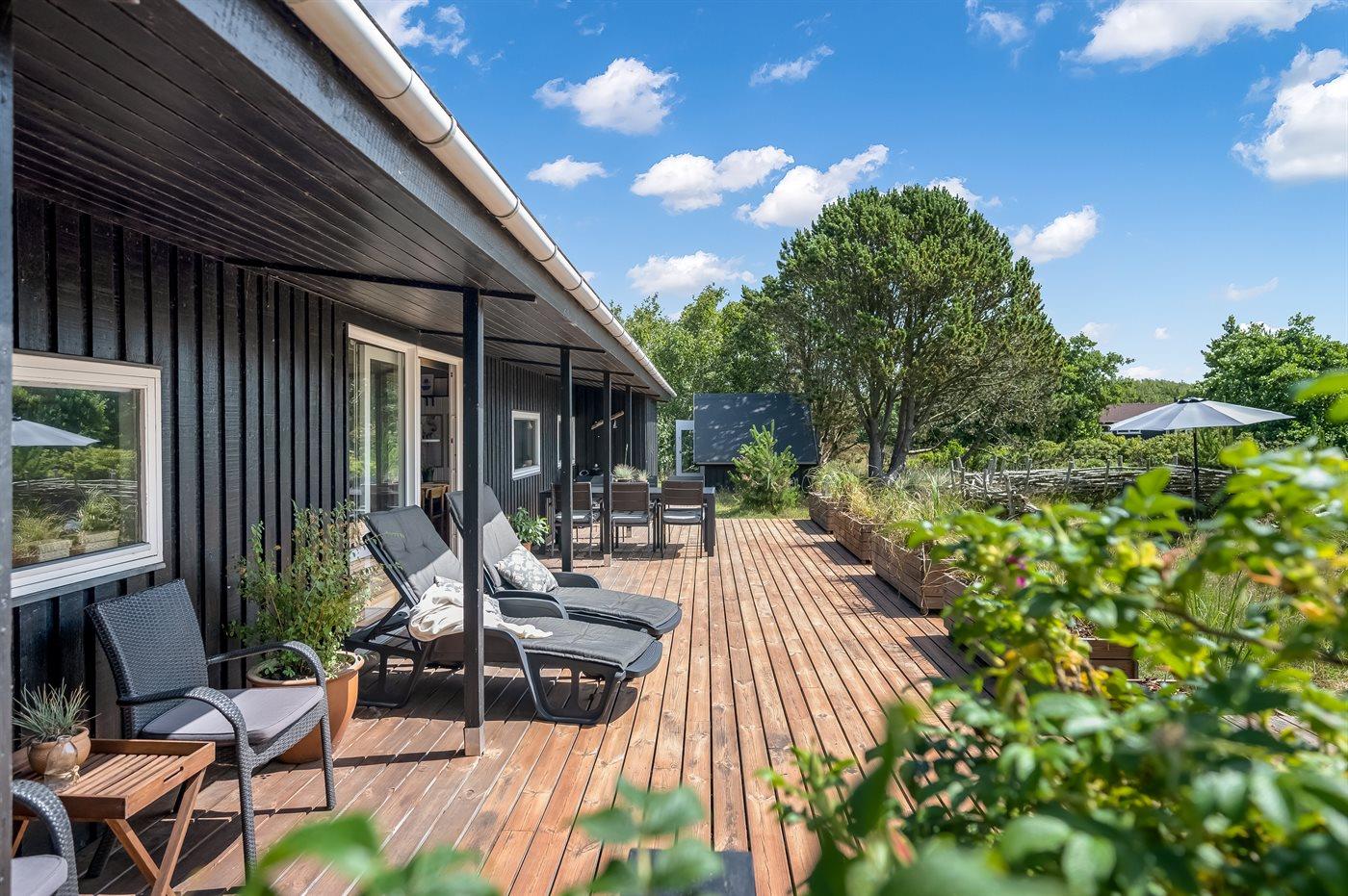 Moderne sommerhus med fire terrasser og naturgrund