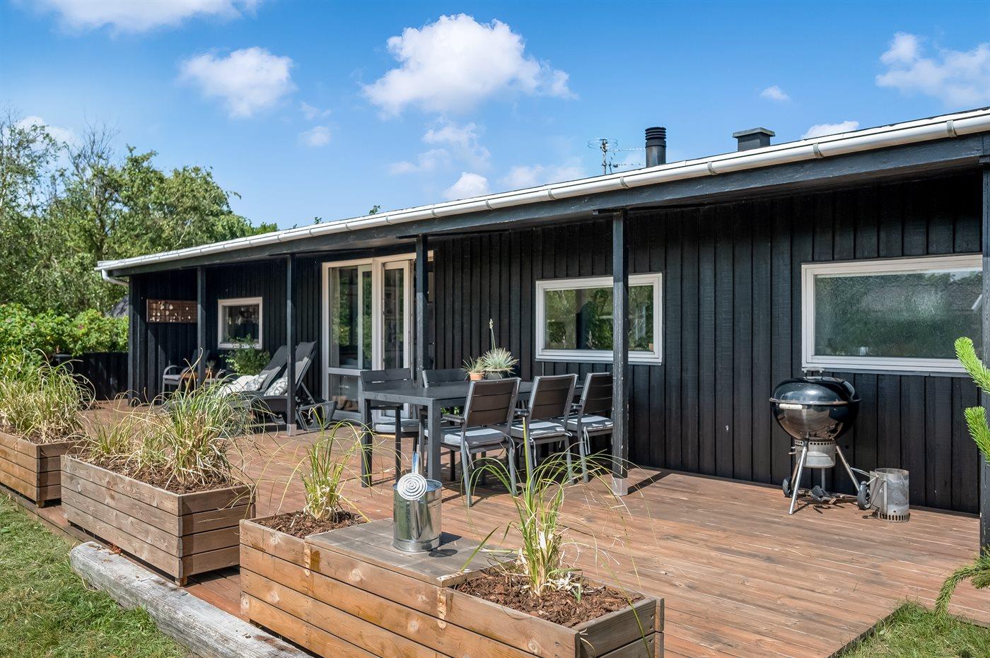Moderne sommerhus i Rindby Strand med fire terrasser og kun 1 km til stranden, perfekt til afslapning i naturskønne omgivelser.