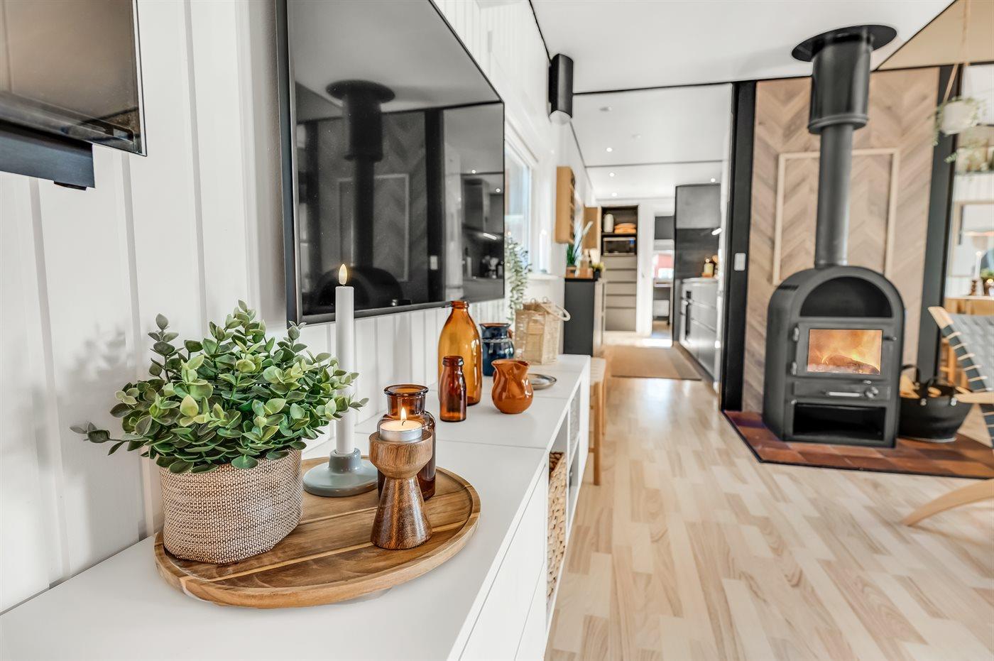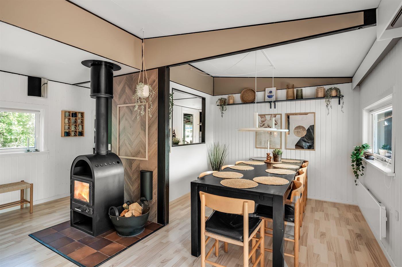 Der er plads til otte personer samt et barn op til tre år, og indretningen er både funktionel og hyggelig. De fire soveværelser er udstyret med gode, nye senge fordelt på fire sovepladser i dobbeltsenge og fire i enkeltsenge. Derudover findes en barneseng og en barnestol. Brændeovnen skaber en hyggelig atmosfære på kølige dage, mens en energivenlig luft-til-luft varmepumpe sikrer et behageligt indeklima. Huset har desuden to badeværelser, begge med gulvvarme, bruseniche og toilet.