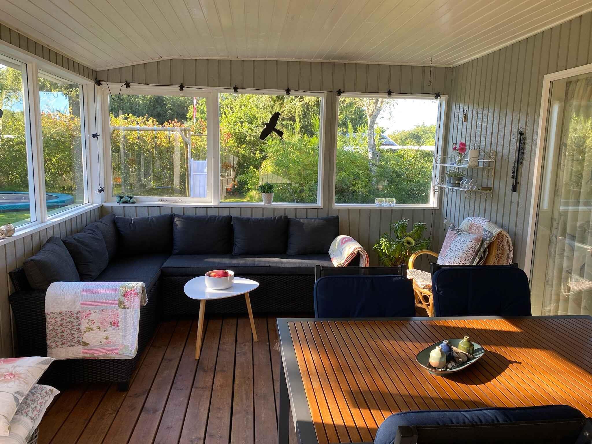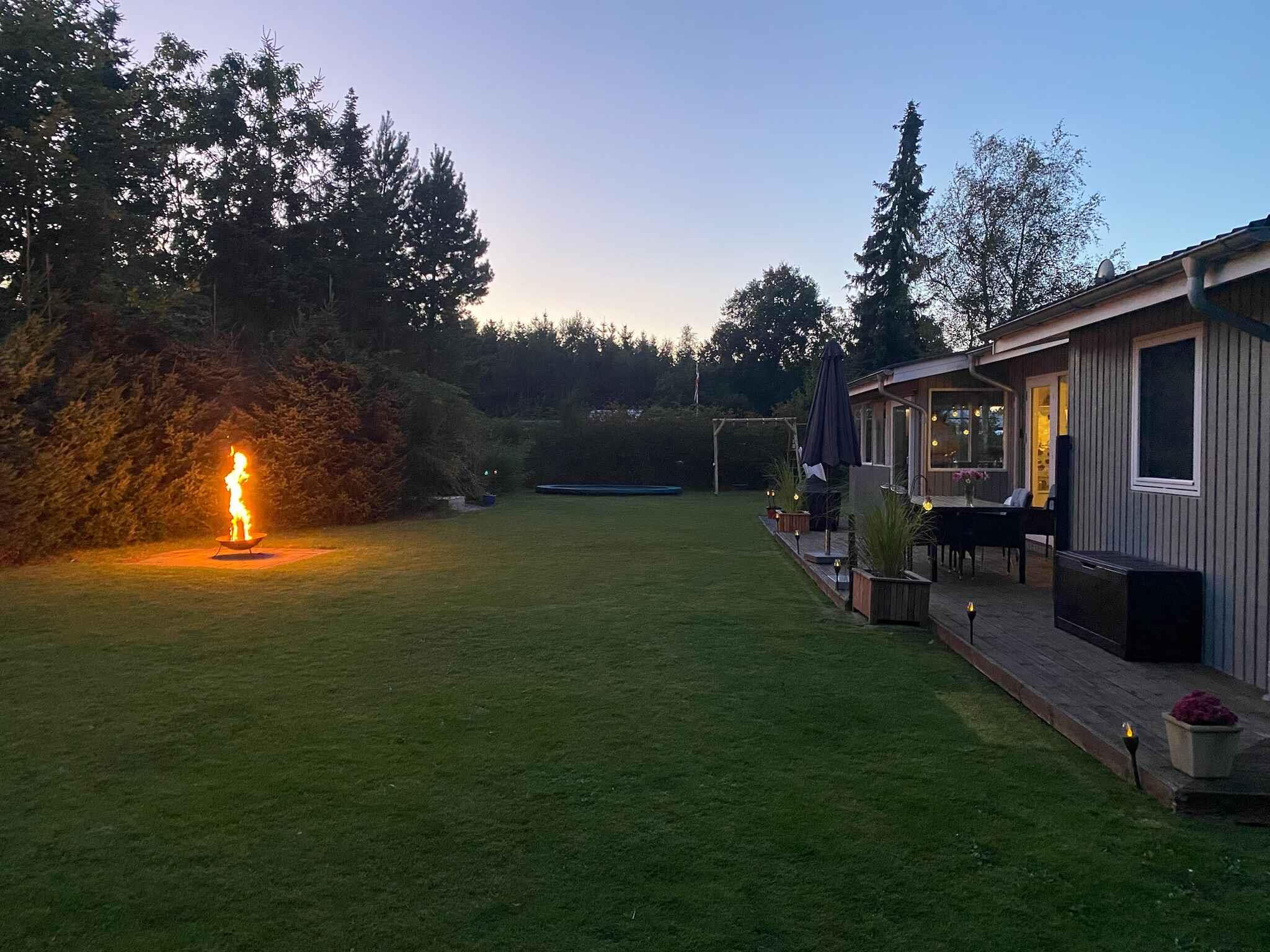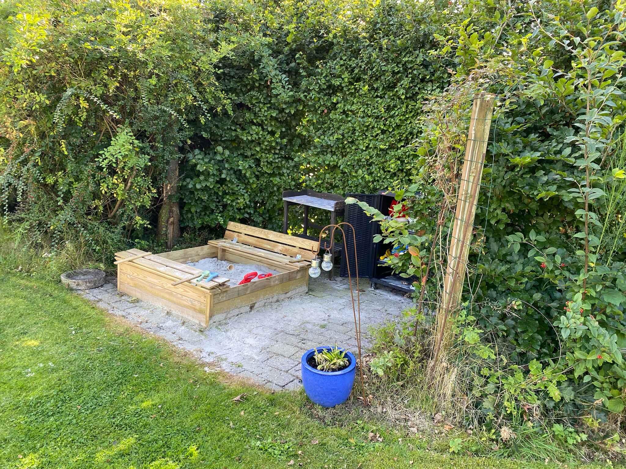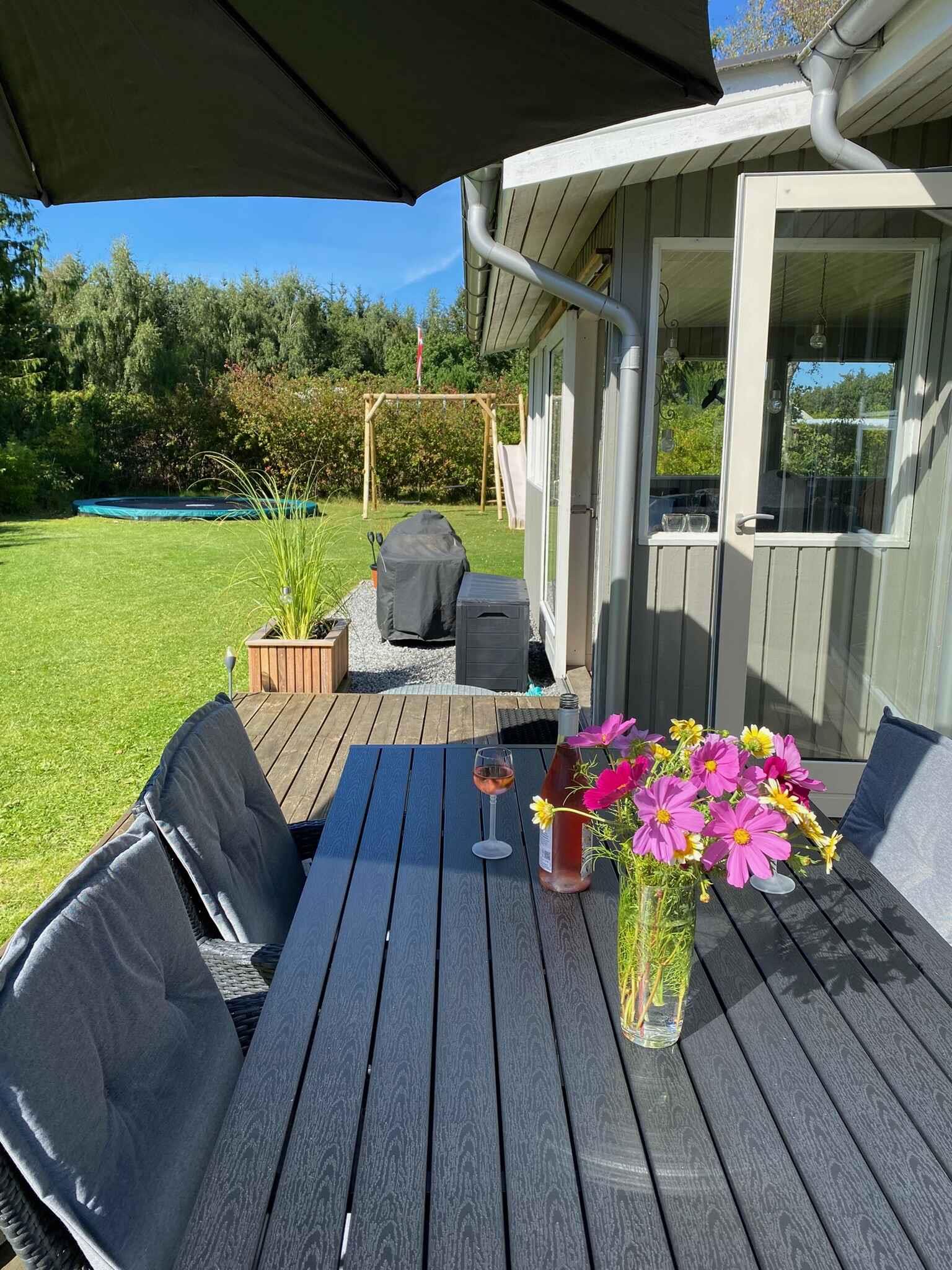 Charmerende sommerhus nær børnevenlig strand med trampolin og bålplads, perfekt til familieferie i naturskønne omgivelser.
