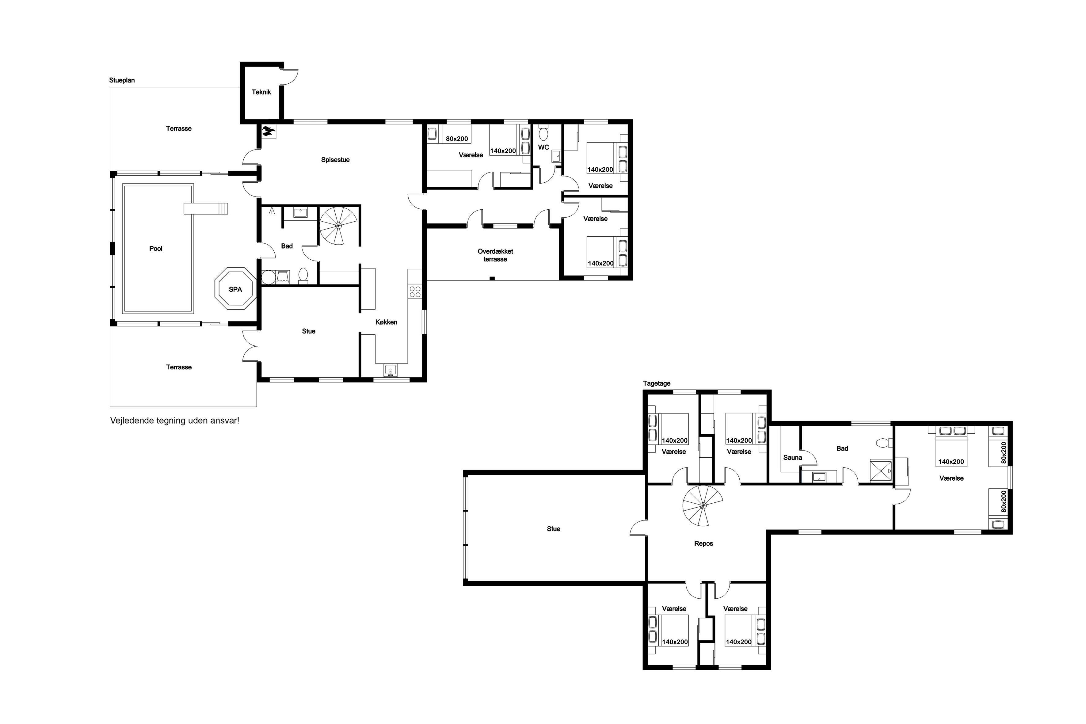 Indenfor finder du otte velindrettede soveværelser, herunder 6 værelser med dobbeltseng, 1 værelse med 1 dobbeltseng og 1 køjeseng, samt 1 værelse med 1 dobbeltseng og 2 enkeltsenge, hvilket sikrer komfortable sovepladser til alle gæster. Huset har i alt to badeværelser og et gæstetoilet, hvilket gør det nemt for alle at få deres daglige rutiner til at fungere glat. Badeværelserne er udstyret med bruser og toilet, så du kan nyde en forfriskende bad efter en lang dag med aktiviteter.
