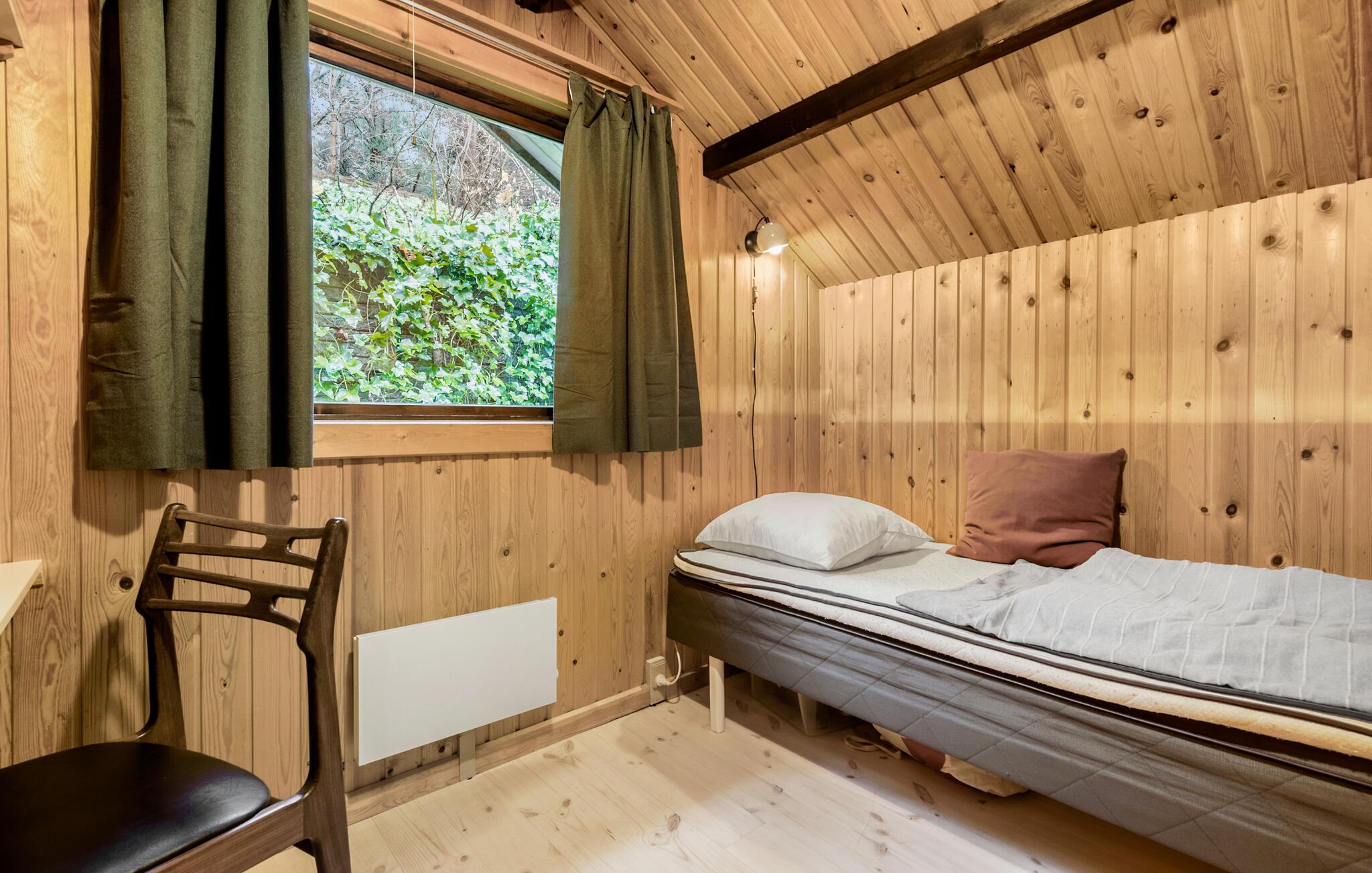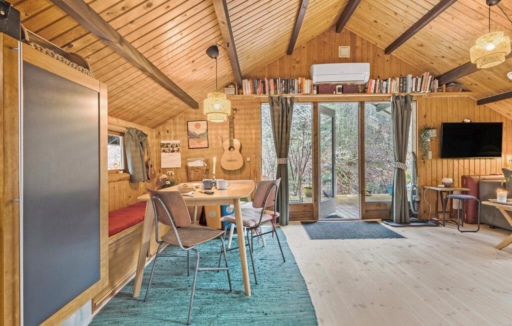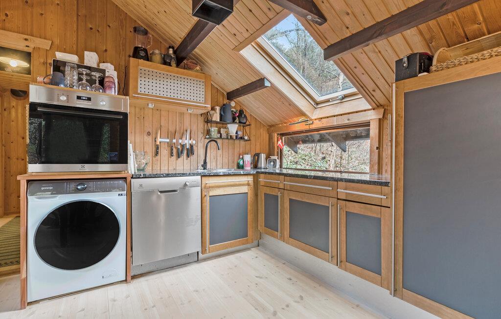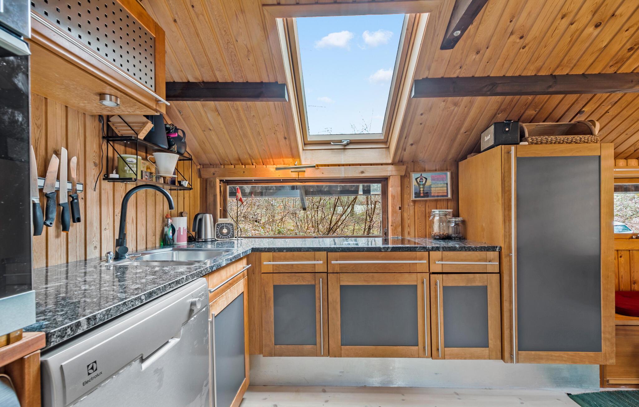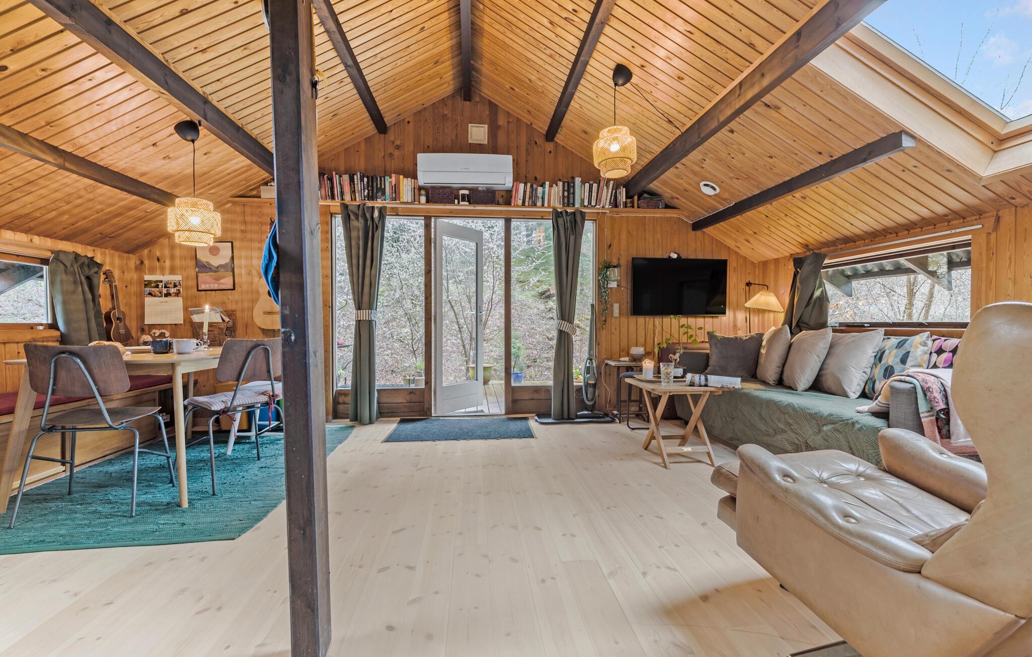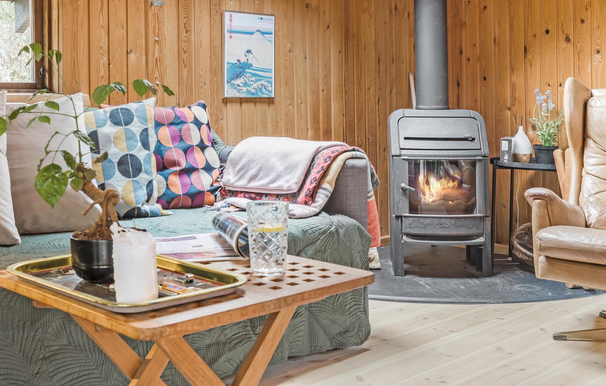 Tag en velfortjent pause fra hverdagen og rejs til Djursland, hvor I midt i Mols Bjerge finder denne lille, hyggelige perle af et træhus. Indvendigt fremtræder huset varmt og idyllisk med loft-til-kip, træpaneler og gode møbler, der gør det nemt at sænke skuldrene og bare slappe af. Tænd op i brændeovnen på de køligere dage og dæk op til en lækker aftensmad, inden I runder dagen af i sofaen med en god film eller brætspil. Måske familiens guitarist skal spille op til fællessang?
