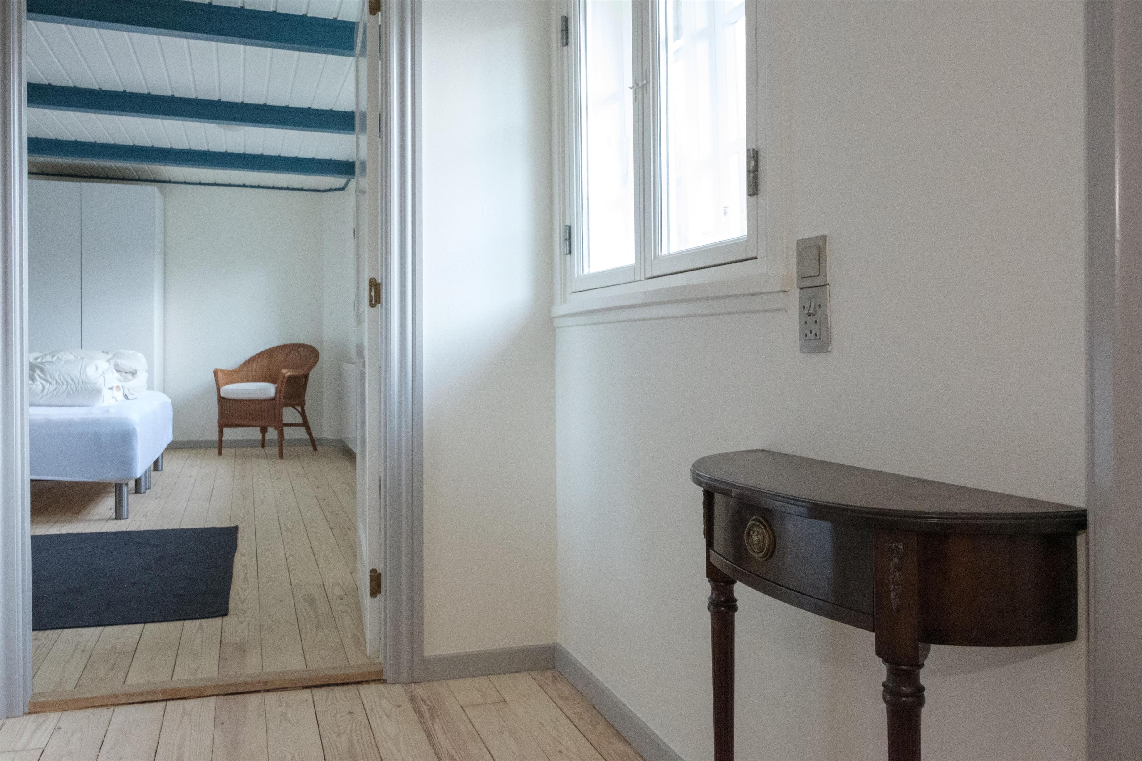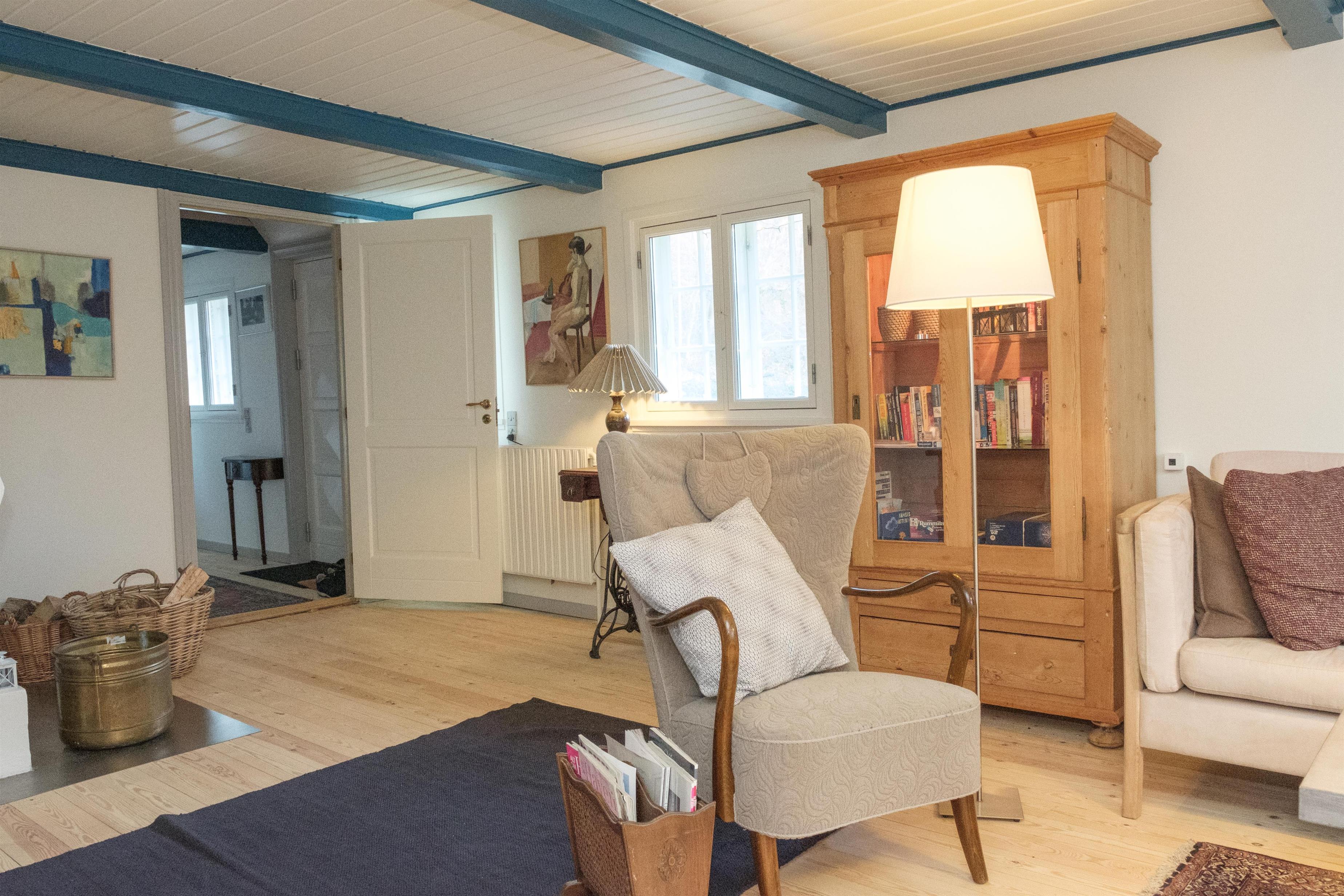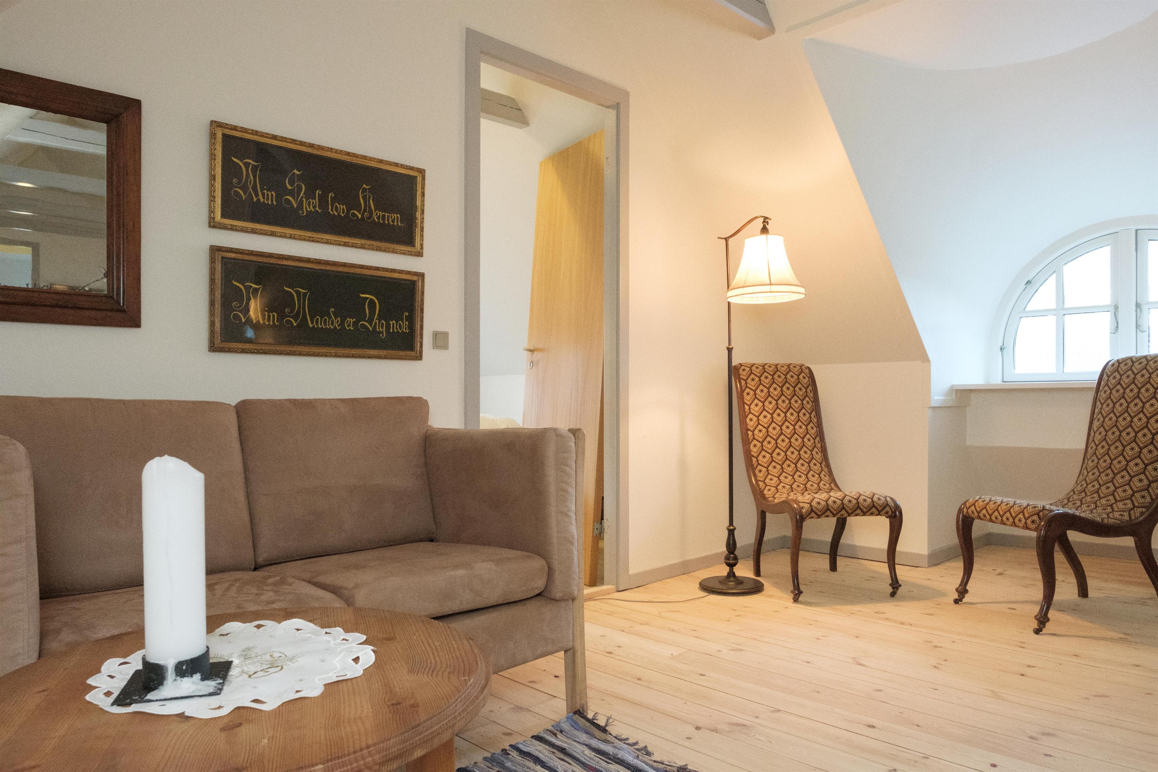 Hovedindgangen med den flotte dobbeltdør åbner til stor entré med trappe til 1. sal og indgang til den store, lyse stue, hvor samlingspunktet er den originale, murede kamin med brændeovnsindsats. Stuen er lige som resten af huset gennemført indrettet og møbleret med en smagfuld blanding af gammelt og nyt, og her er spiseplads til 10 personer, hyggeligt og bekvemt sofamøblement samt TV med danske (inkl. TV2) og tyske kanaler. Det store og praktiske køkken har keramisk komfur med ovn, køle-/fryseskab og opvaskemaskine. I stueplan er der 2 store, dejlige soveværelser med dobbeltseng, og på 1. sal ligeledes 2 soveværelser med dobbeltseng foruden opholdsstue med dobbelt sovesofa, i alt 10 sovepladser. Godt og rummeligt flisebadeværelse med brusekabine, vaskemaskine og puslebord; desuden et gæstetoilet, ligeledes i stueplan. Til de mindste gæster er der barneseng og højstol. Der er internetadgang.