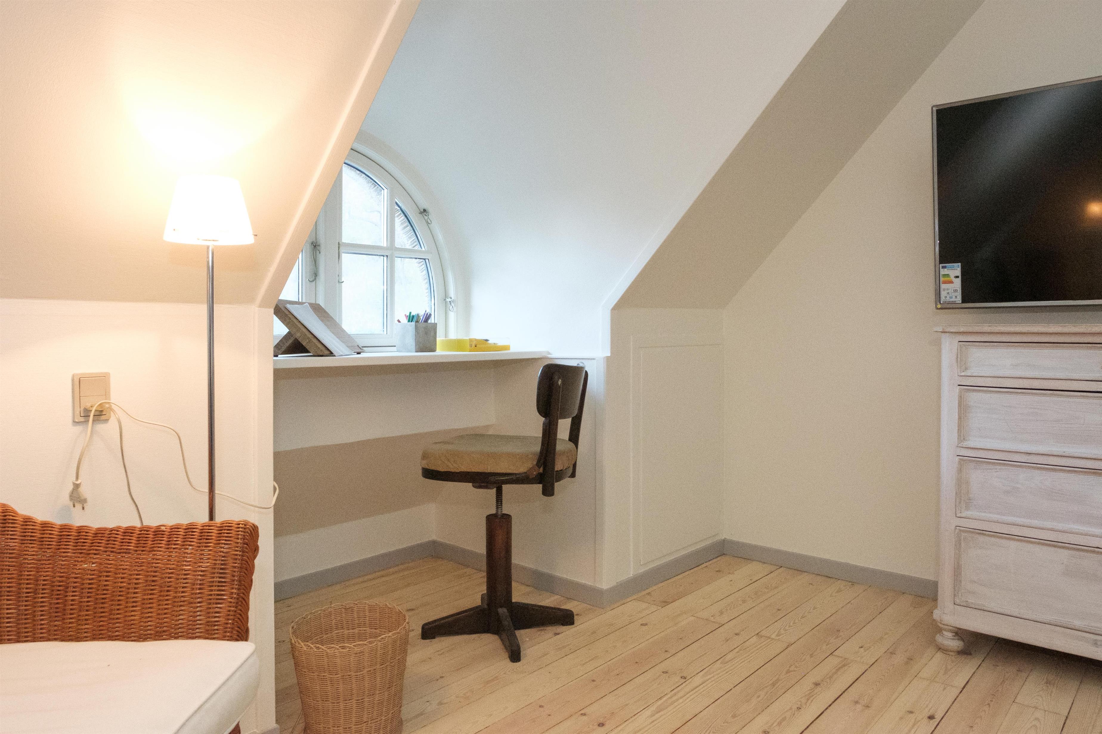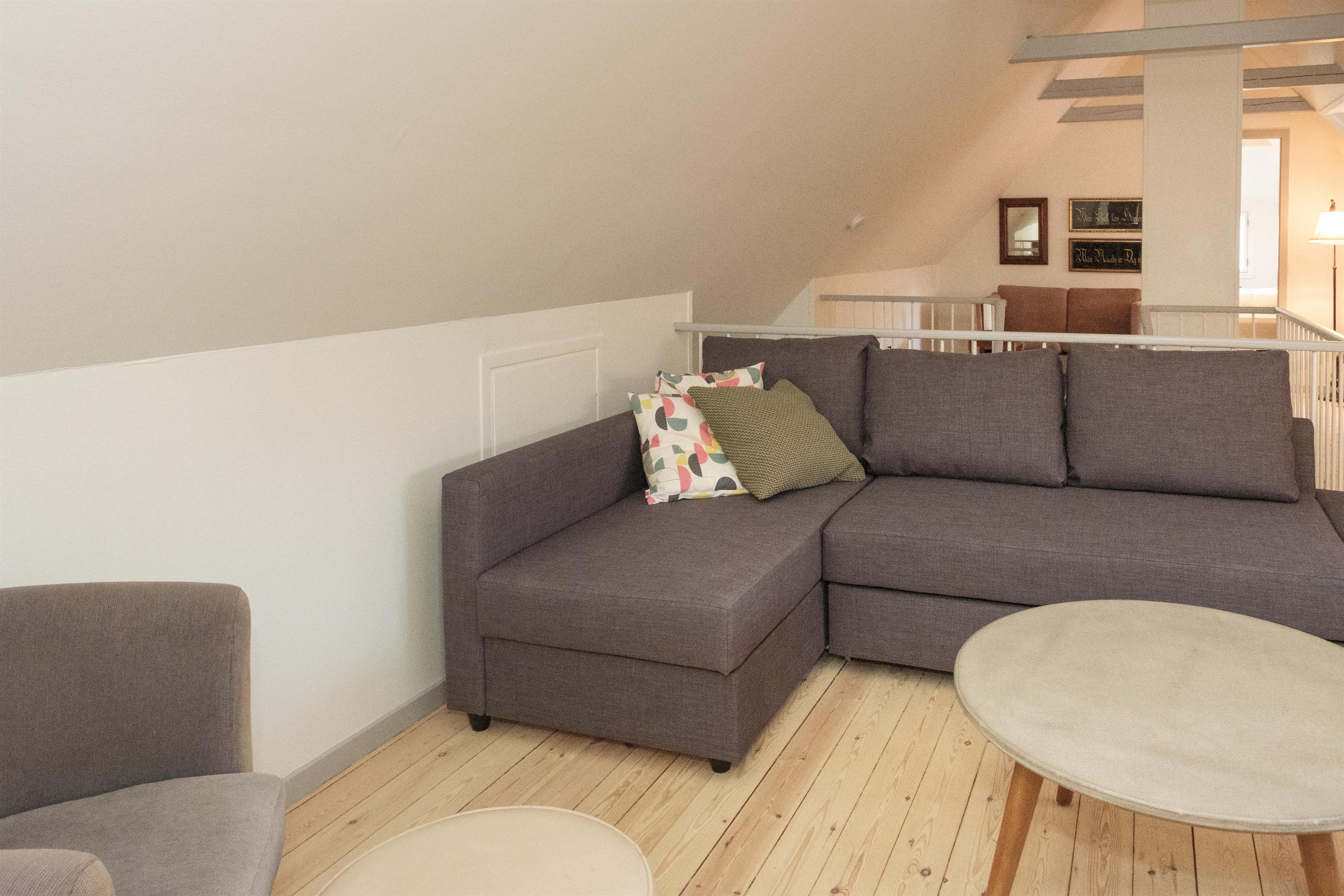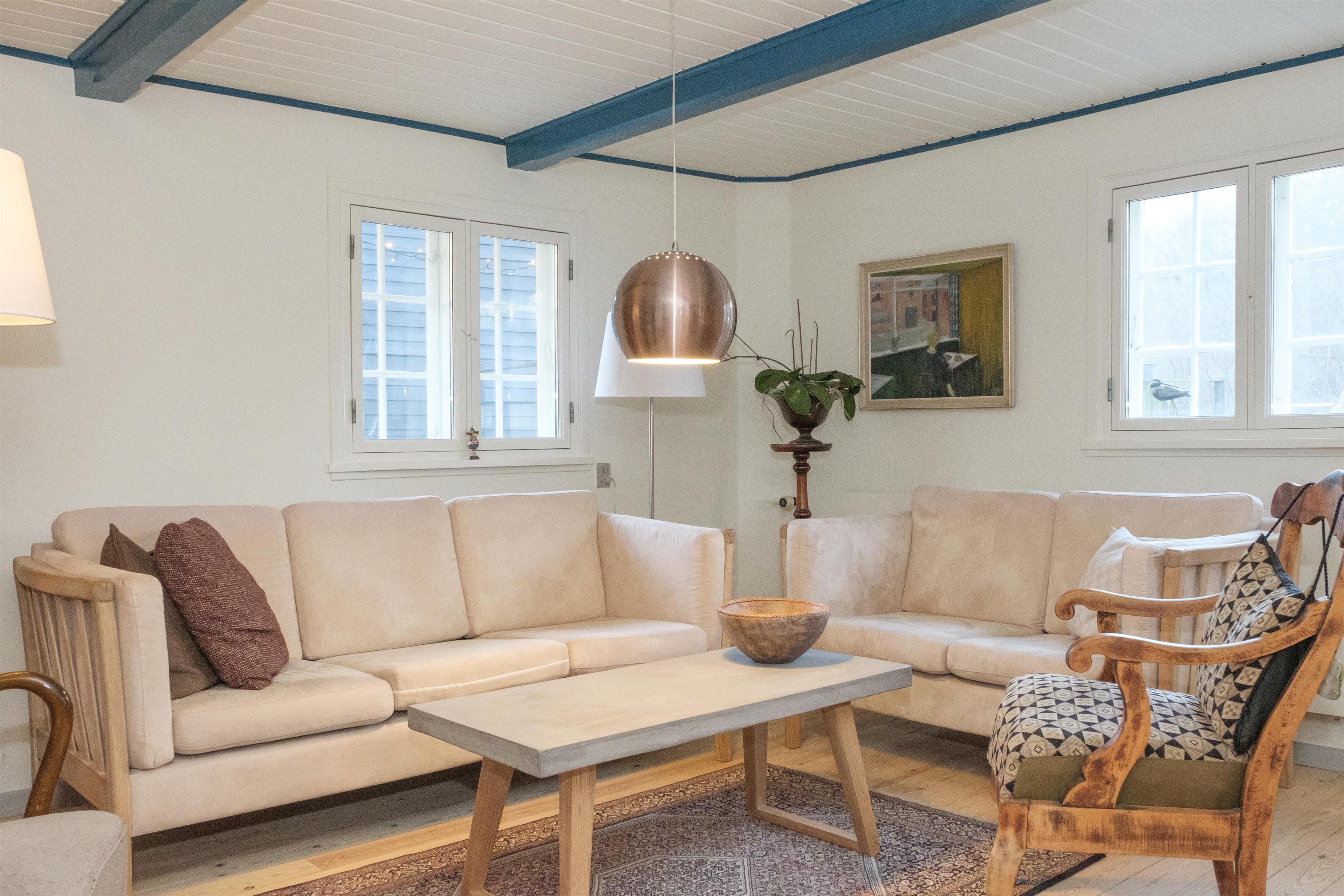 Hovedindgangen med den flotte dobbeltdør åbner til stor entré med trappe til 1. sal og indgang til den store, lyse stue, hvor samlingspunktet er den originale, murede kamin med brændeovnsindsats. Stuen er lige som resten af huset gennemført indrettet og møbleret med en smagfuld blanding af gammelt og nyt, og her er spiseplads til 10 personer, hyggeligt og bekvemt sofamøblement samt TV med danske (inkl. TV2) og tyske kanaler. Det store og praktiske køkken har keramisk komfur med ovn, køle-/fryseskab og opvaskemaskine. I stueplan er der 2 store, dejlige soveværelser med dobbeltseng, og på 1. sal ligeledes 2 soveværelser med dobbeltseng foruden opholdsstue med dobbelt sovesofa, i alt 10 sovepladser. Godt og rummeligt flisebadeværelse med brusekabine, vaskemaskine og puslebord; desuden et gæstetoilet, ligeledes i stueplan. Til de mindste gæster er der barneseng og højstol. Der er internetadgang.