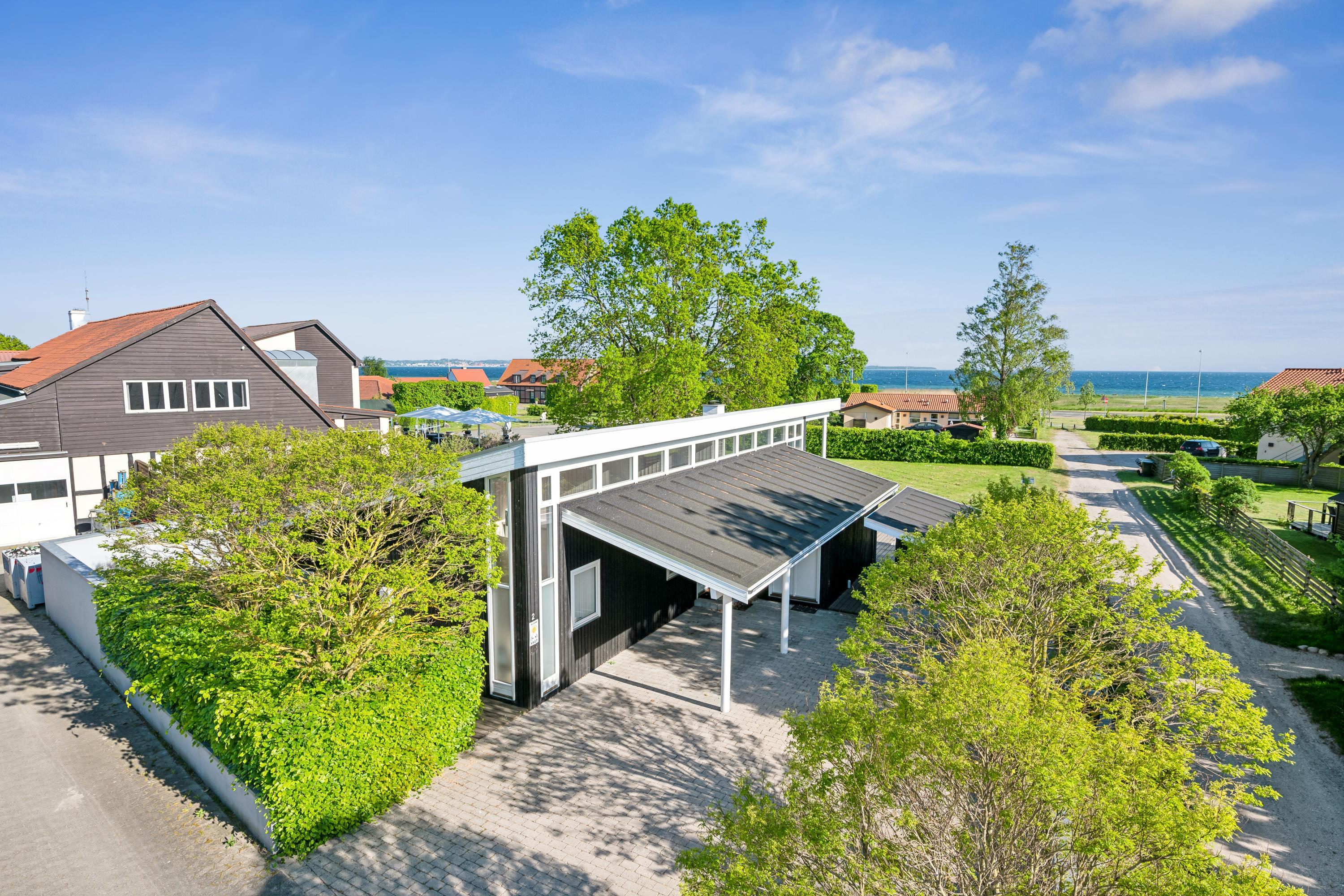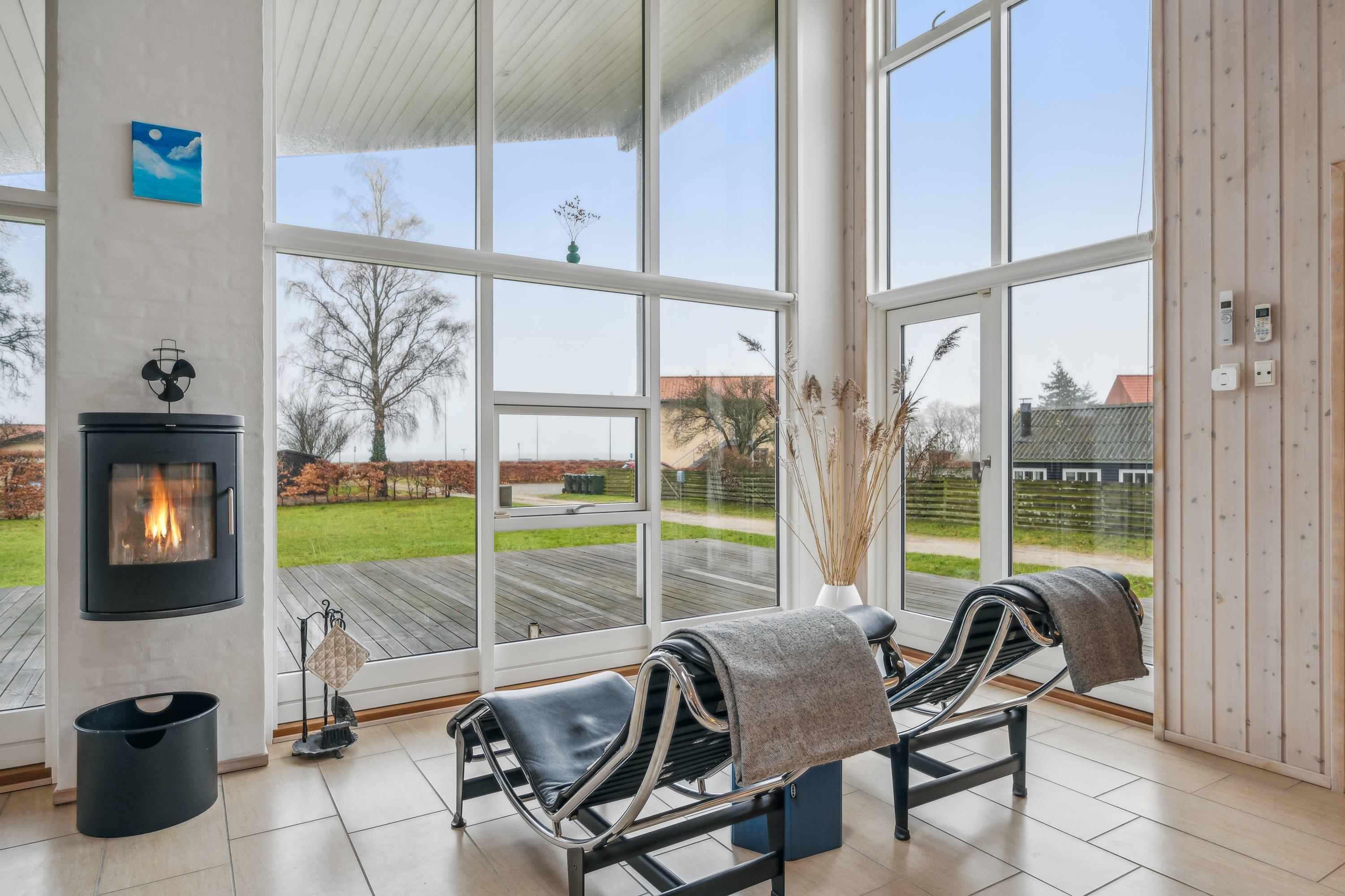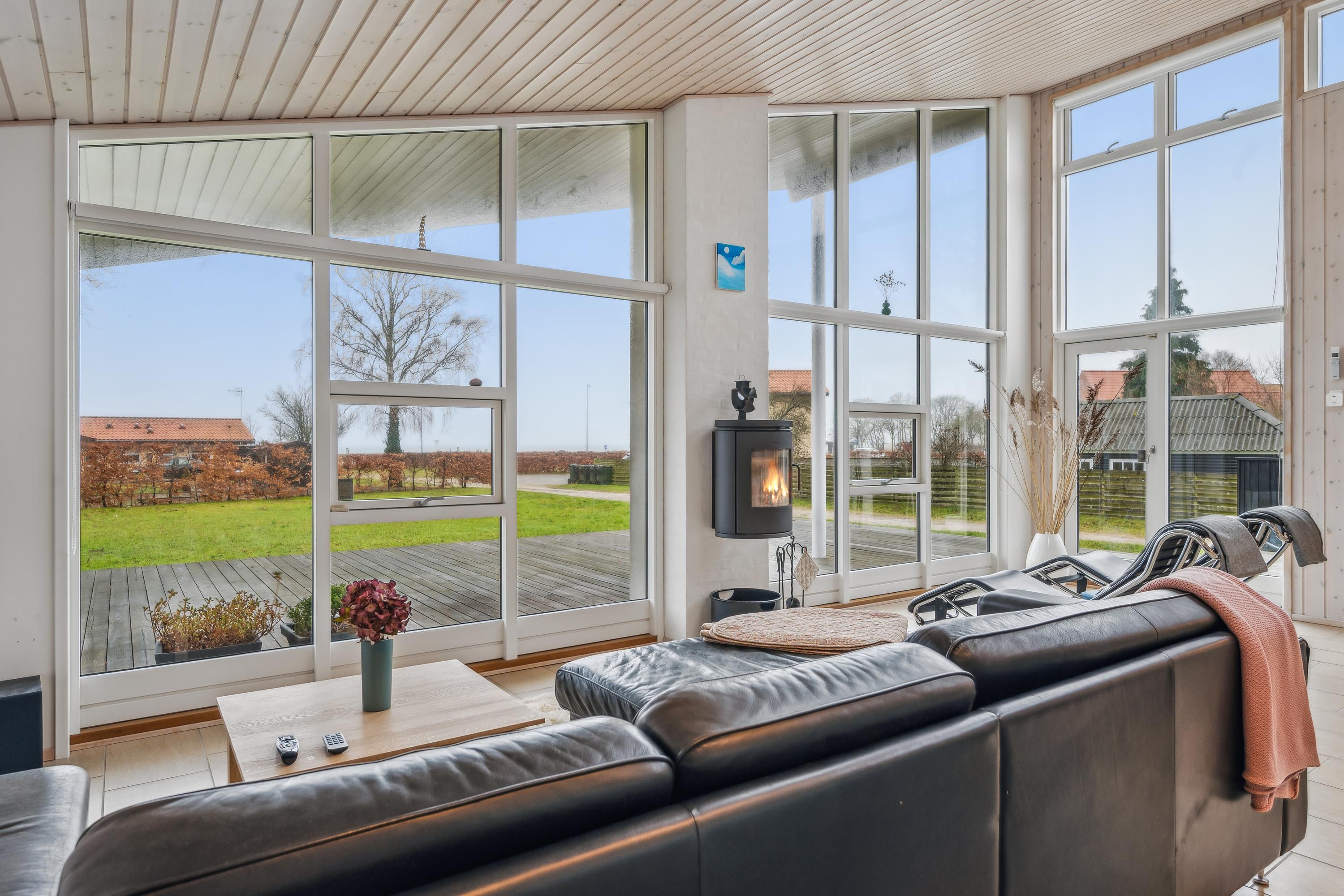 Flot feriehus ved Femmøller strand med terrasse, spa, brændeovn og udsigt til vandet i naturskønne omgivelser.