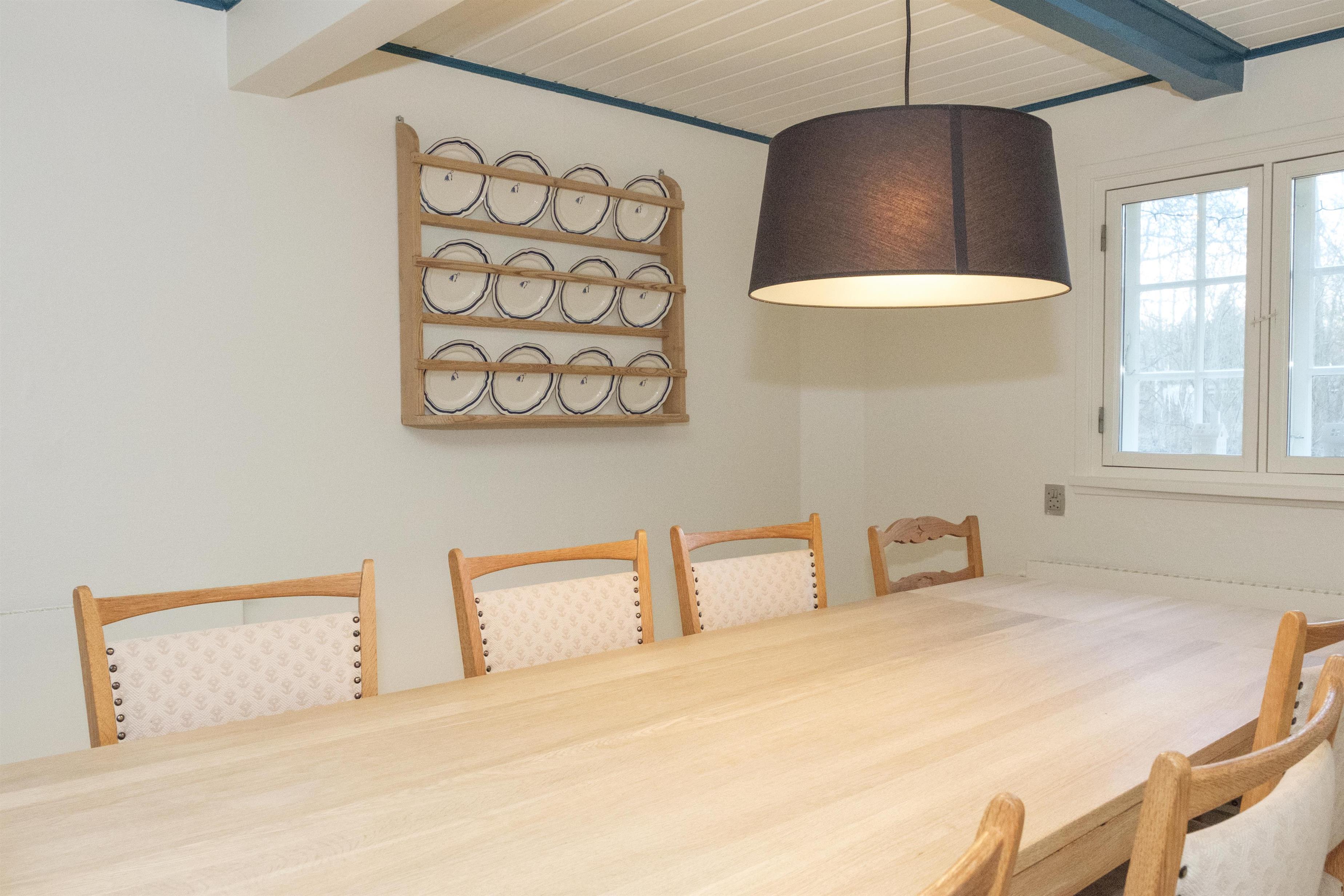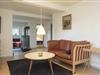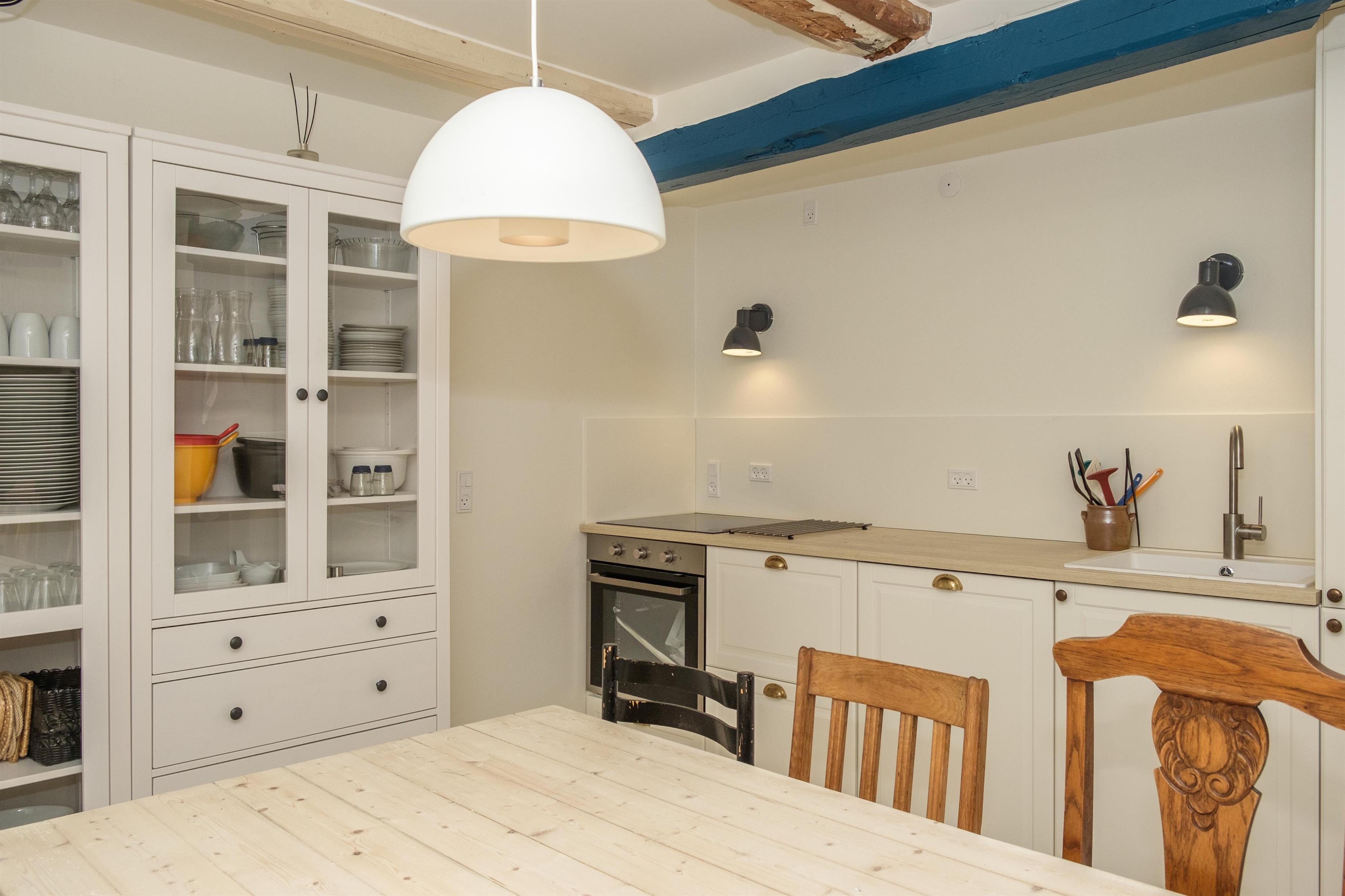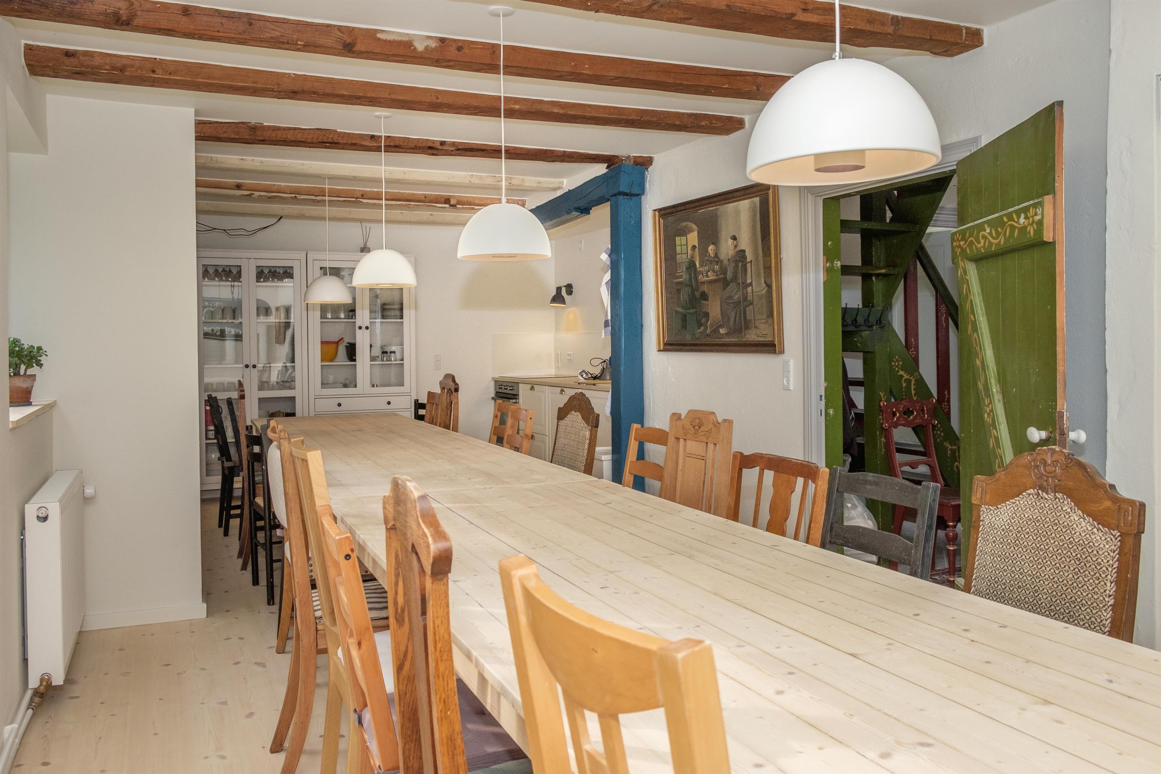 Hovedlængen med den flotte dobbeltdør er på 180 kvm og har plads til 10 personer. Her er lige som i resten af ejendommen gennemført indrettet og møbleret med en smagfuld blanding af gammelt og nyt. I den store, lyse stue samles man om den originale, murede kamin med brændeovnsindsats, og her er desuden spiseplads til 10 personer. Det store og praktiske køkken har keramisk komfur med ovn, køle-/fryseskab, opvaskemaskine og mikrobølgeovn. Huset rummer 10 sovepladser fordelt på 2 store, dejlige soveværelser i stueplan med dobbeltseng, og på 1. sal ligeledes 2 soveværelser med dobbeltseng foruden opholdsstue med dobbelt sovesofa.