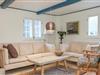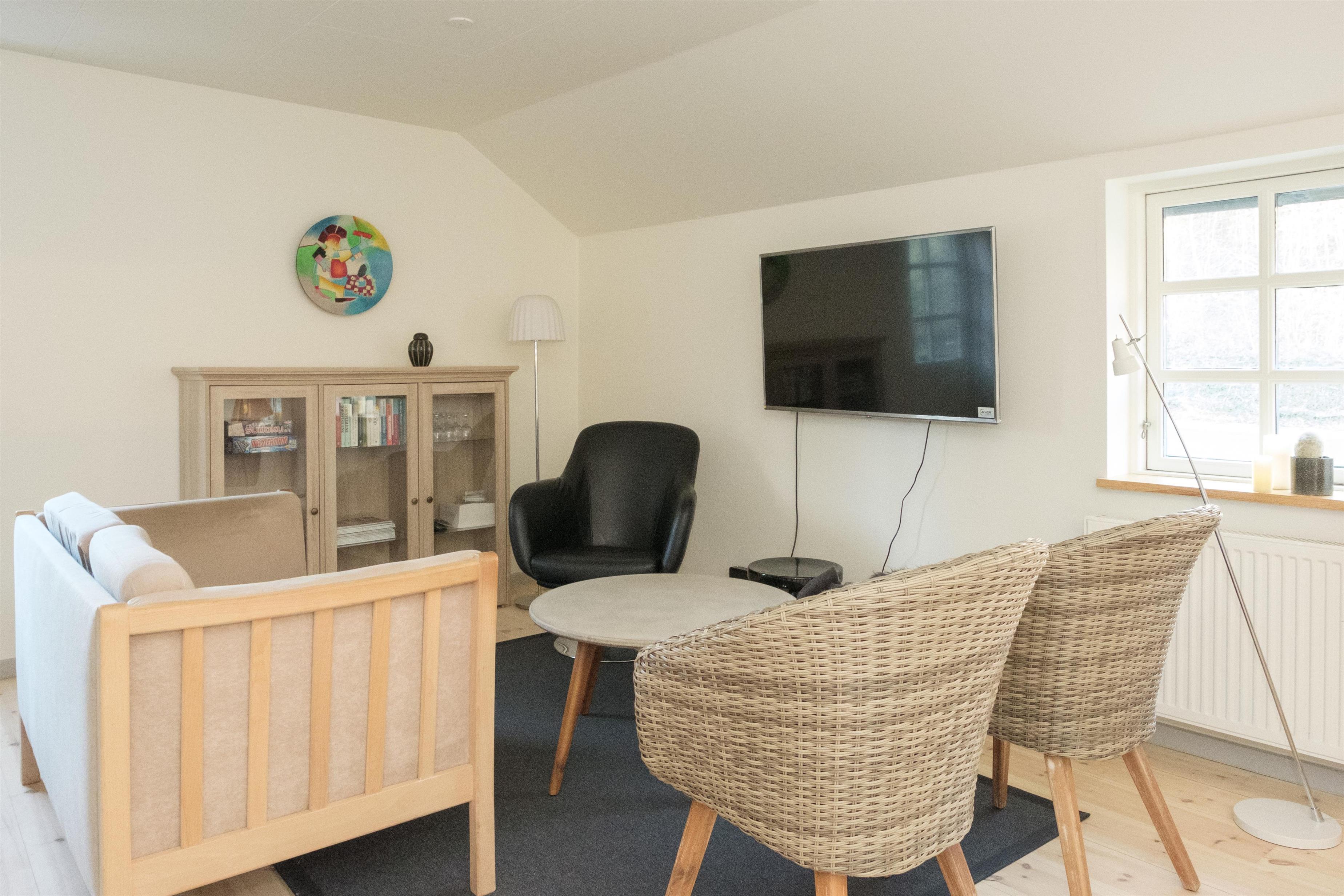 Møllens anden længe rummer endnu en lys og skøn ferielejlighed. Fra entréen er der indgang til den store stue med to dejlige sofaafdelinger samt brændeovn. Den hyggelige spiseafdeling har plads til 6 personer og ligger i åben forbindelse med godt, rummeligt køkken med keramisk komfur med ovn, køle-/fryseskab, opvaskemaskine og mikrobølgeovn. Huset har 1 stort, godt soveværelse med dobbeltseng, 1 værelse med køjeseng samt dobbelt sovesofa i stuen, i alt 6 sovepladser. Velindrettet og regulært flisebadeværelse med bruseniche og vaskemaskine.