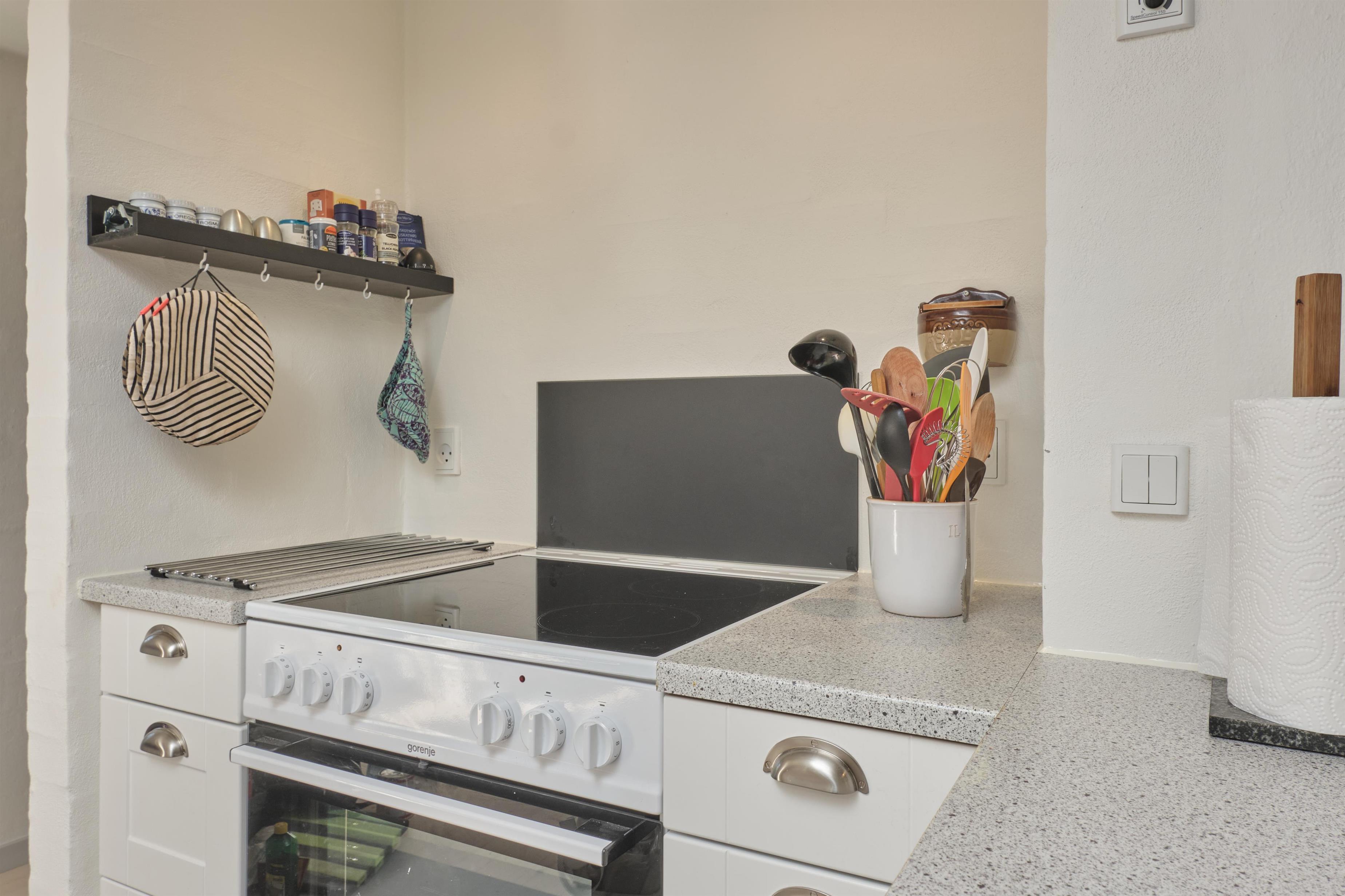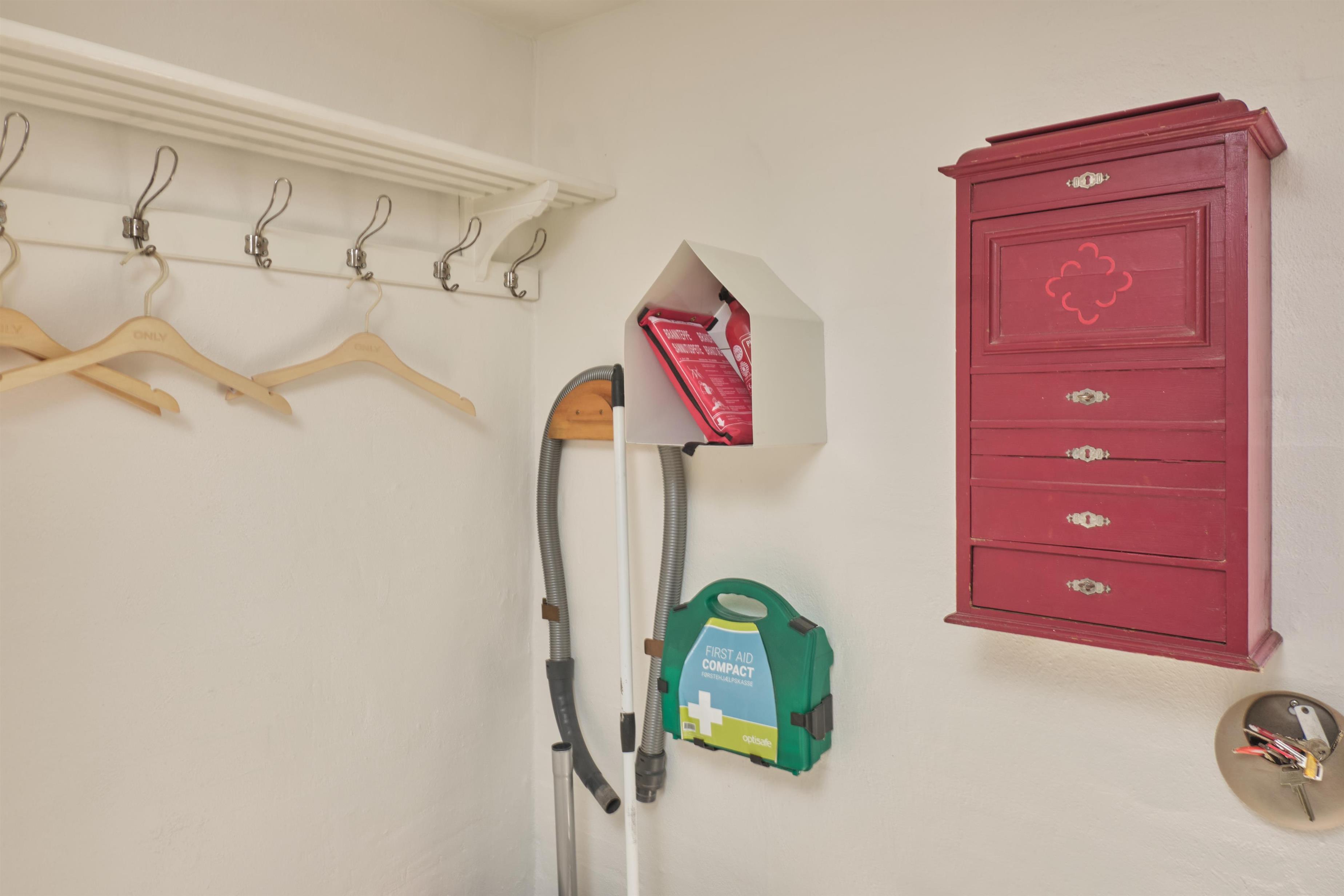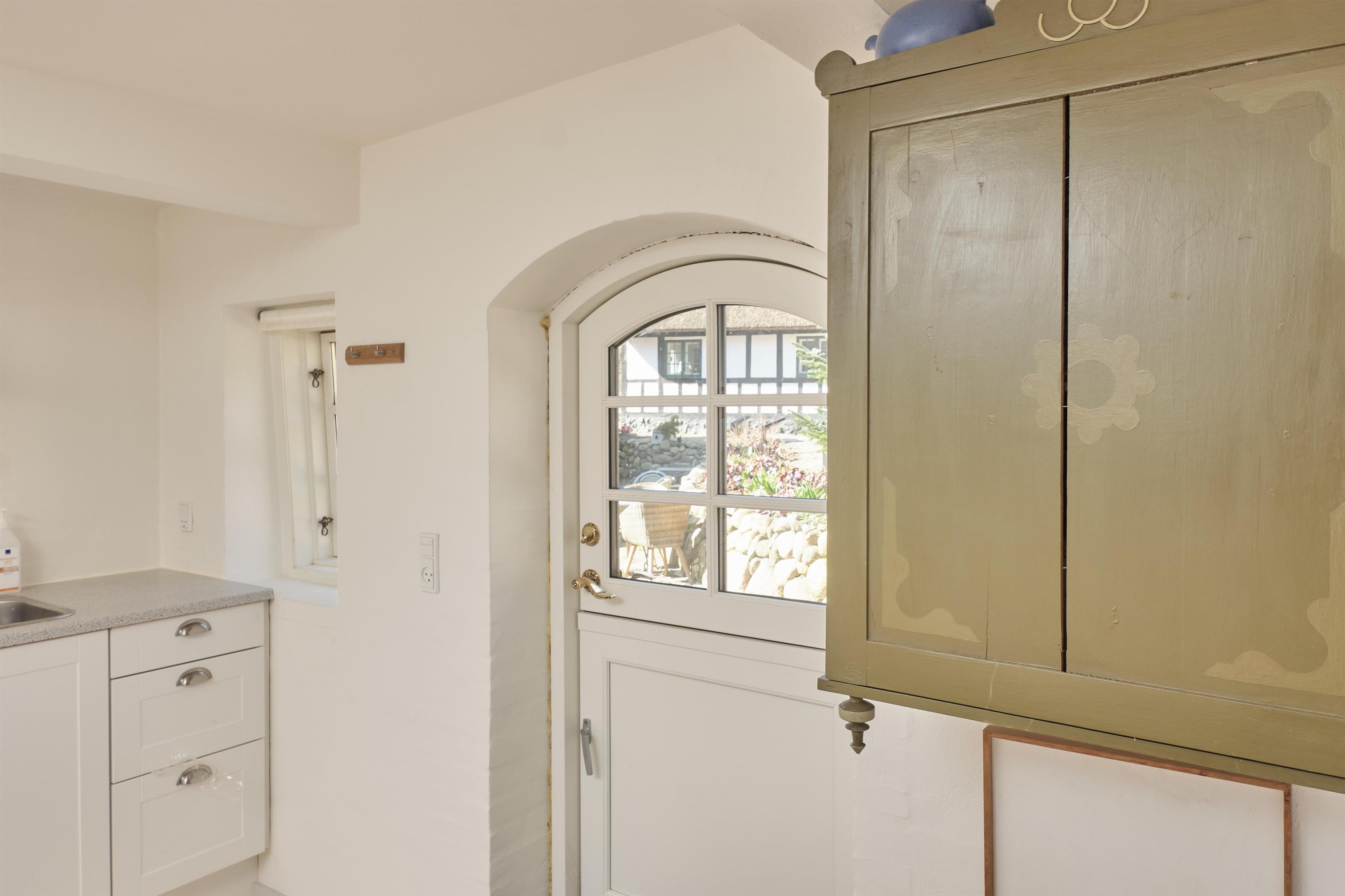 Hovedindgangen åbner til entré med indgang til den store, lyse stue med to dejlige sofaafdelinger, brændeovn og TV med danske (inkl. TV2) og tyske kanaler. Den hyggelige spiseafdeling har plads til 6 personer og ligger i åben forbindelse med godt, rummeligt køkken med keramisk komfur med ovn, køle-/fryseskab, opvaskemaskine og mikrobølgeovn. Huset har 1 stort, godt soveværelse med dobbeltseng, 1 værelse med køjeseng samt dobbelt sovesofa i stuen, i alt 6 sovepladser. Velindrettet og regulært flisebadeværelse med bruseniche og vaskemaskine. Til de mindste er der barneseng og højstol. Der er internetadgang. Hyggelig, afskærmet fliseterrasse med gode havemøbler, liggestole, parasol og grill.