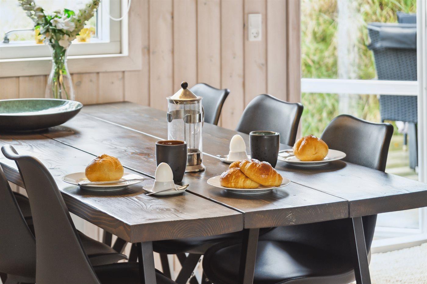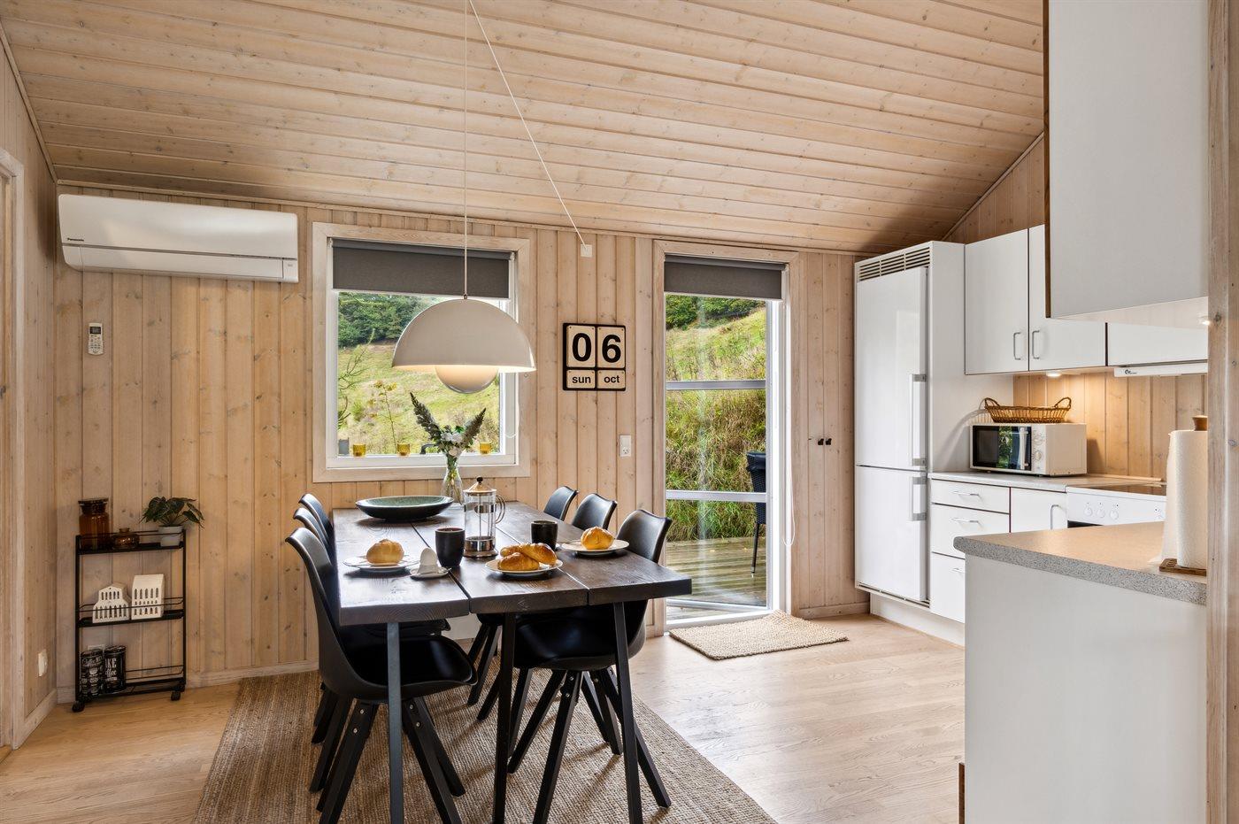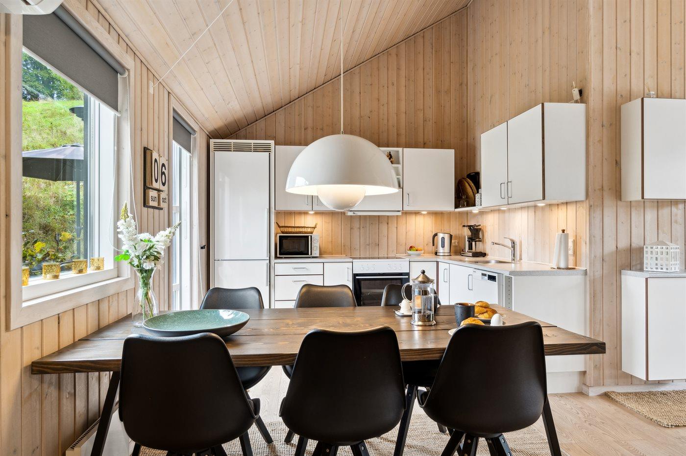 Køkkenet er udstyret med 1 køleskab. Der er 4 keramiske kogeplader, varmluftovn, mikrobølgeovn samt opvaskemaskine.