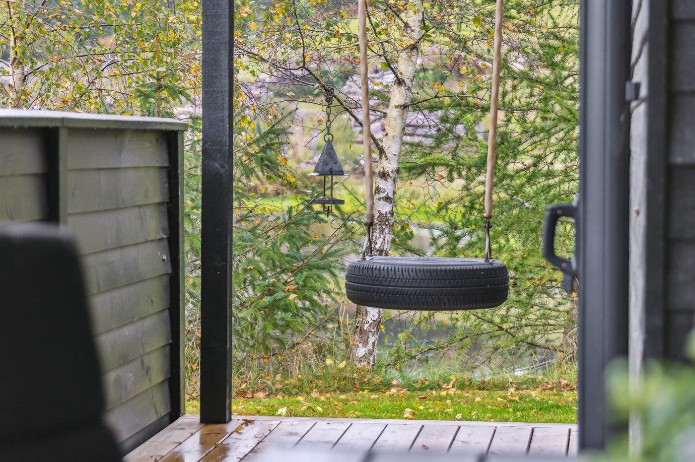 Ferieboligen er beliggende på en 1700 m² stor naturgrund. Der er 2100 m til havet. Nærmeste forretning er beliggende i en afstand af 3500 m. Til ferieboligen hører 35 m² terrasseareal. Desuden er der 15 m² overdækket terrasse. Der er redskabsrum. Gynge. Udendørs bruser. Grill til rådighed. Der er installeret stik til opladning af elbil. Type 2 stik. Med 11 kW ladeeffekt. Parkering ved ferieboligen.