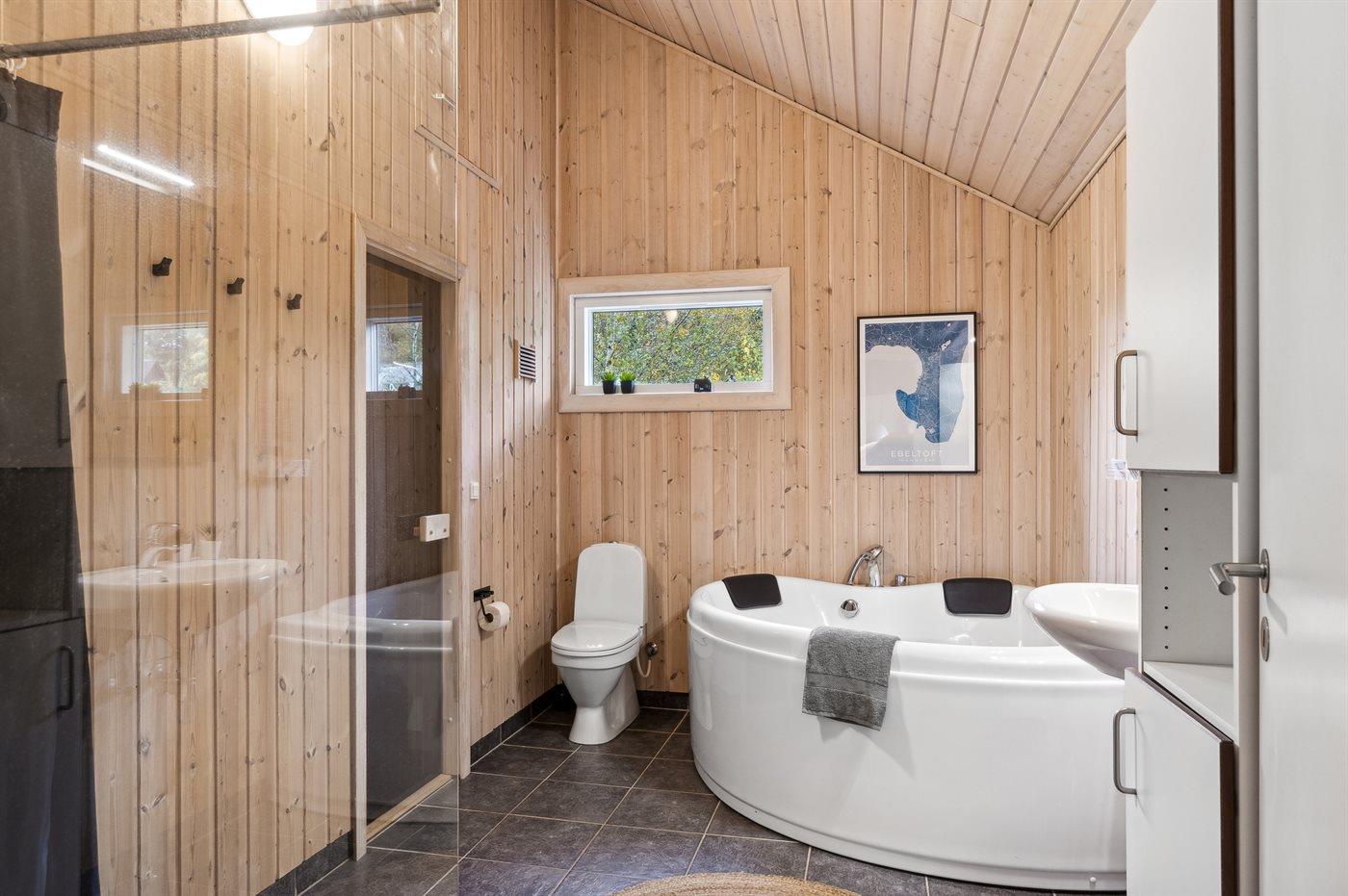 Der er 1 badeværelse med bruseniche og 2 toiletter, heraf 1 gæstetoilet. Der er gulvvarme på 1 badeværelse. I saunaen er der mulighed for afslapning.
