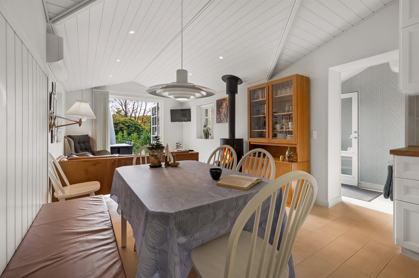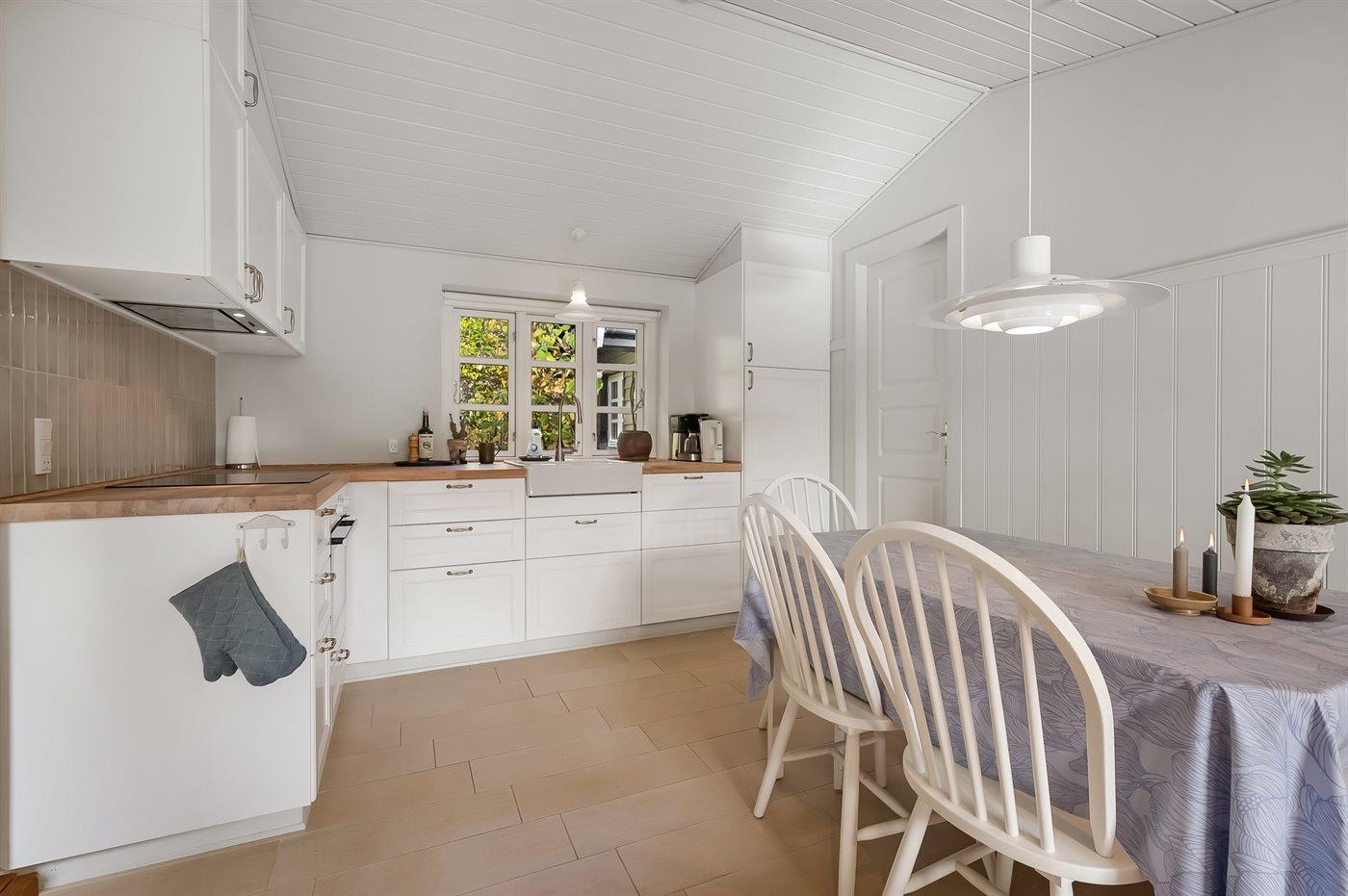 Køkkenet er udstyret med 1 køleskab. Der er 4 keramiske kogeplader, varmluftovn.