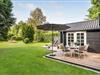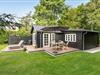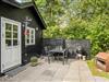 Hyggeligt træhus ved Femmøller Strand med udendørs bruser og terrasse til afslapning og familiehygge.