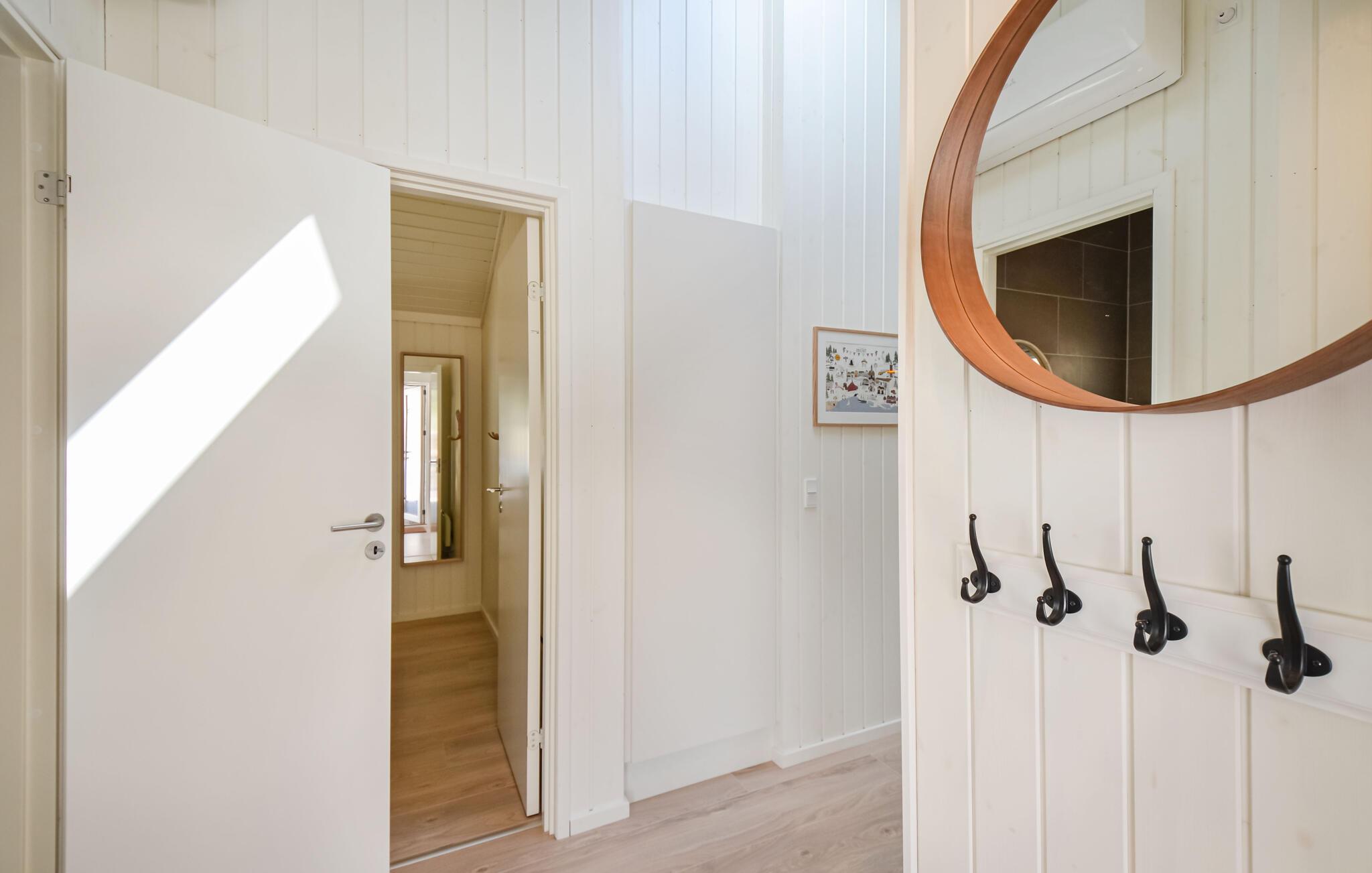 Huset er spændende indrettet, og der er kræset for detaljerne. Fra stue og spiseplads er der udgang til overdækkede og åbne terrasser, som giver mulighed for at kunne sidde ude og nyde måltiderne. Med udsigt over området fra det brændefyrede vildmarksbad eller en tur i den udendørs sauna er udelivet her meget attraktivt. Området er et flot naturområde med blandet skov og ligger tæt ved Nationalparken Mols Bjerge.