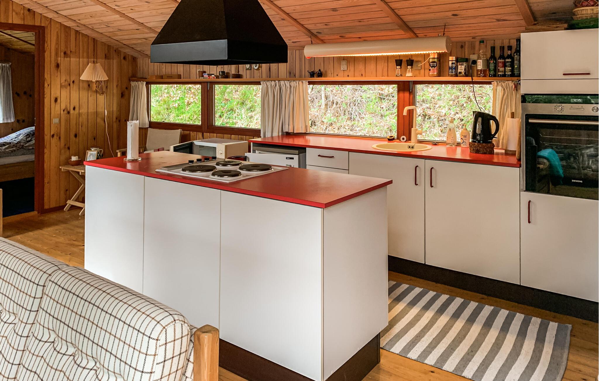 Dette charmerende træhus ligger midt i uberørt natur og giver jer den optimale base for afslappende dage med venner eller familie. Tænd brændeovnen og glæd jer til hyggelige læsetimer i sofaen og hyggelige spilleaftener ved det store spisebord. I det moderne, åbne køkken kan I tilberede måltiderne, mens I snakker med familien.