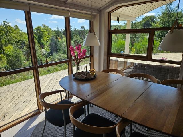 Femmøller ved Ebeltoft – fantastisk feriehus, højt beliggende med unik udsigt, lækker 2-personers spa, internet, aktivitetsrum med bordtennis mv. Nu også med shelter, hvis I selv eller børnene har lyst til at prøve at sove udenfor. Huset er veludstyret og har f.eks. både Qooker-vandhane og en Morsø Pizza-ovn.