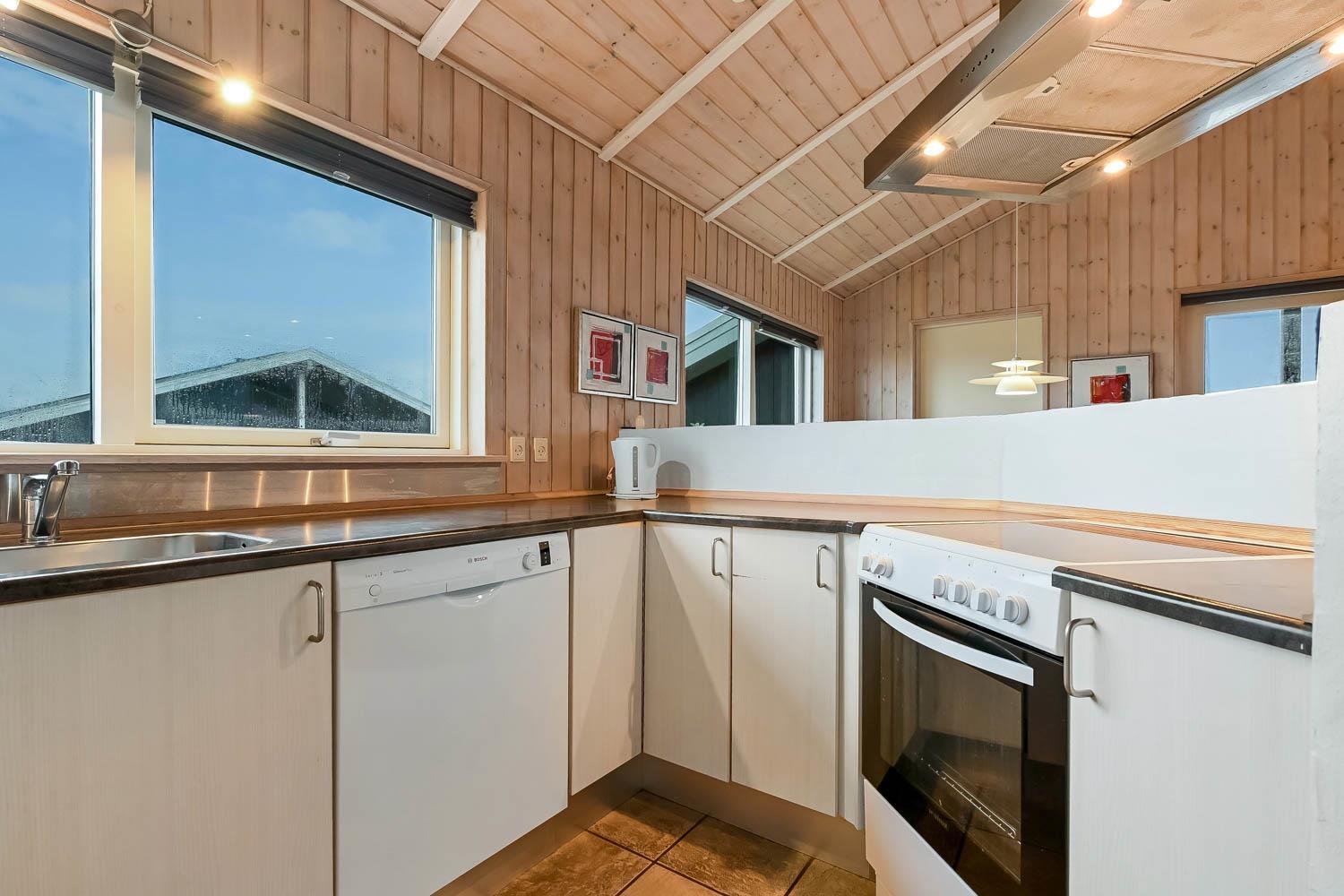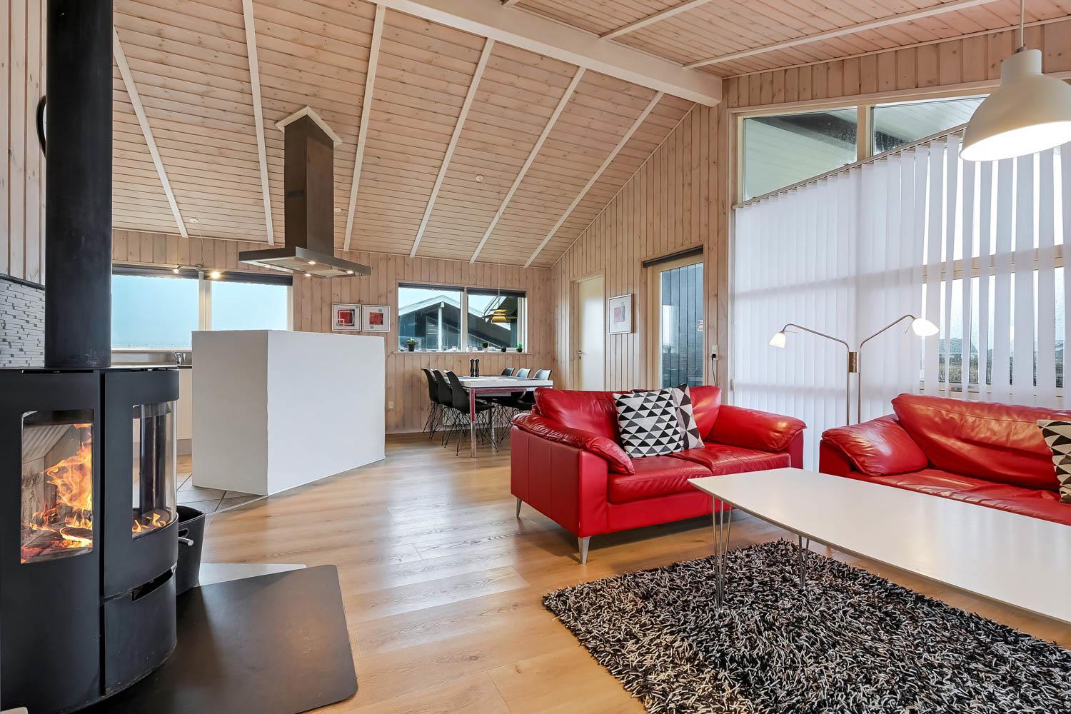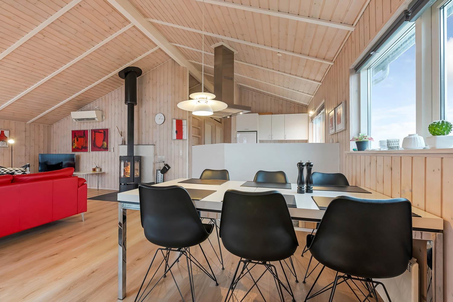 Veludstyret køkkenafdeling med bl.a. opvaskemaskine, mikroovn og køle-fryseskab, køkkenet er kombineret med husets dejlige stue, som er med komfortable møbler, fladskærms-TV med DR1 samt parabol til modtagelse af de tyske kanaler. Både stue og køkken er åbne til kip og det store vinduesparti mod terrasse giver et fantastisk lysindfald. Gulvbelægning i stue og værelser er træ, og køkken samt badeværelse er med klinker. Der er naturligvis også en skøn brændeovn, som kan nydes hele året rundt, desuden er der installeret en varmepumpe, som gør huset mere energibesparende. 3 soverum som er med 1DS + 1DS + 1DS. Husets badeværelse er med gulvvarme og har udover toilet og håndvask en skøn spa, hvor man kan få masseret kroppen. 1 husdyr er tilladt. Huset er et ikke-ryger hus.