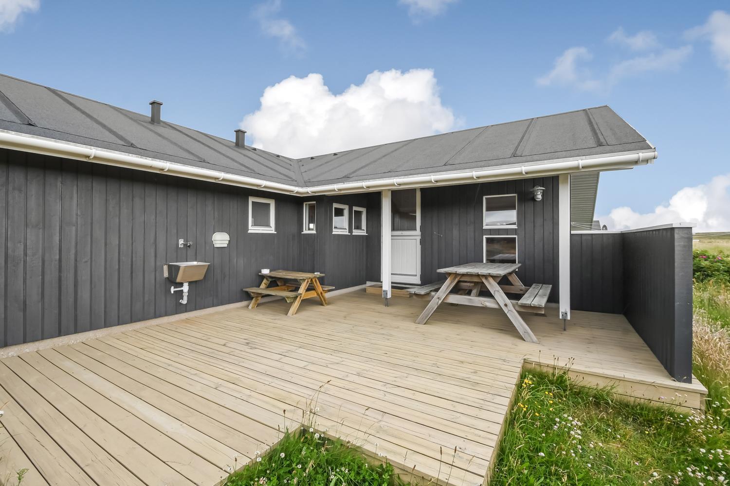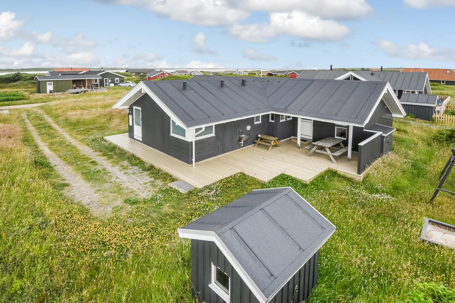 Huset er beliggende på en ca. 1200 m2 naturgrundstykke i et roligt feriehusområde ca 3 km sydøst for Vejby Klit. Afstanden til Ferring Sø er blot 200 m og Vesterhavet ligger kun 500 m væk fra huset. Til de mindste gæster er der gynger, sandkasse og legehus til rådighed. Terrasserne er gode og her er der selvfølgelig havemøbler og solvogne til rådighed. Fra terrassen er der en god udsigt over området. Alt i alt et fantastisk attraktivt feriehus til en eller to familier som ønsker at holde ferie sammen.