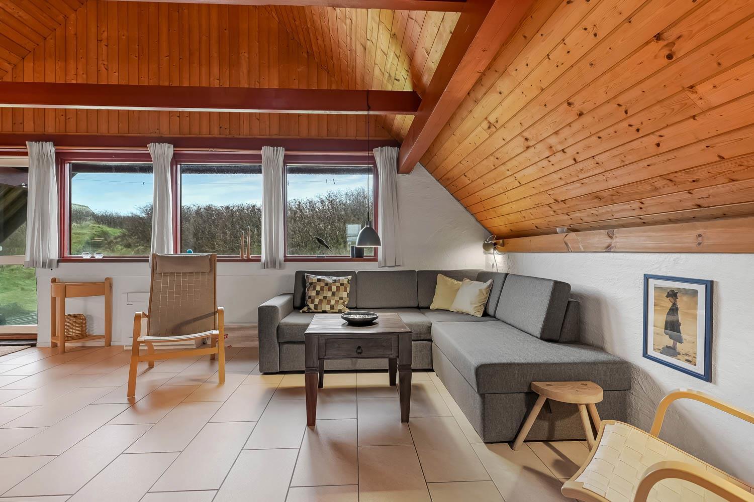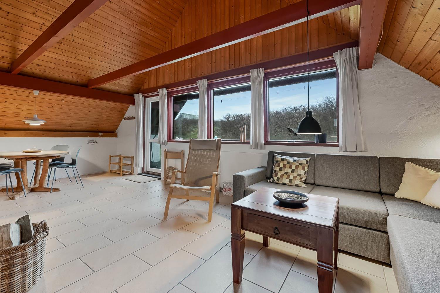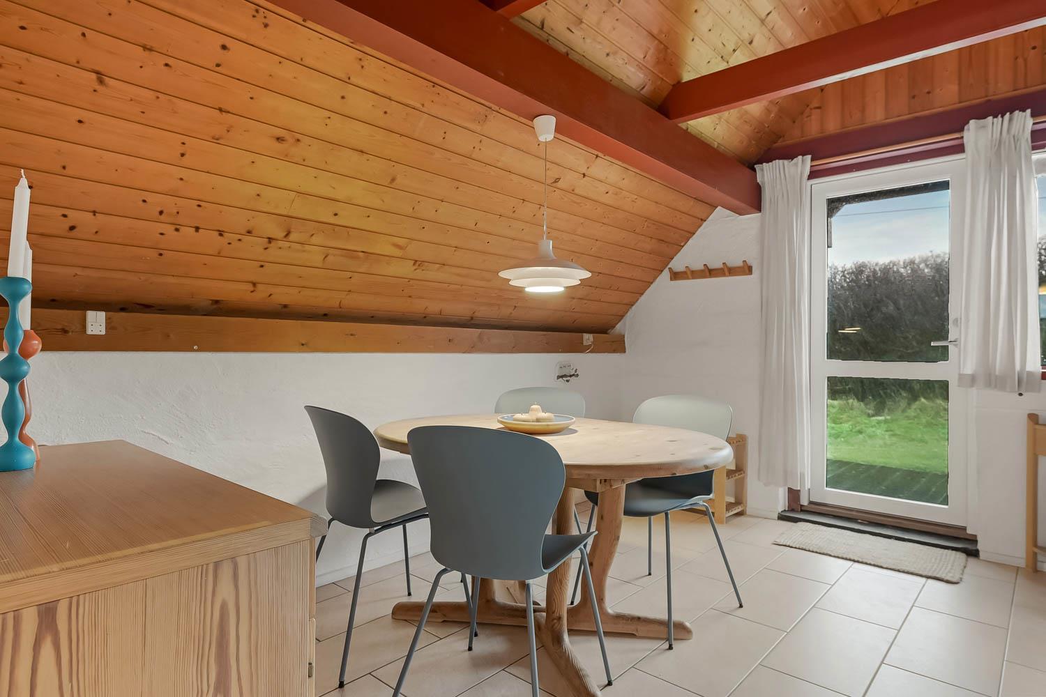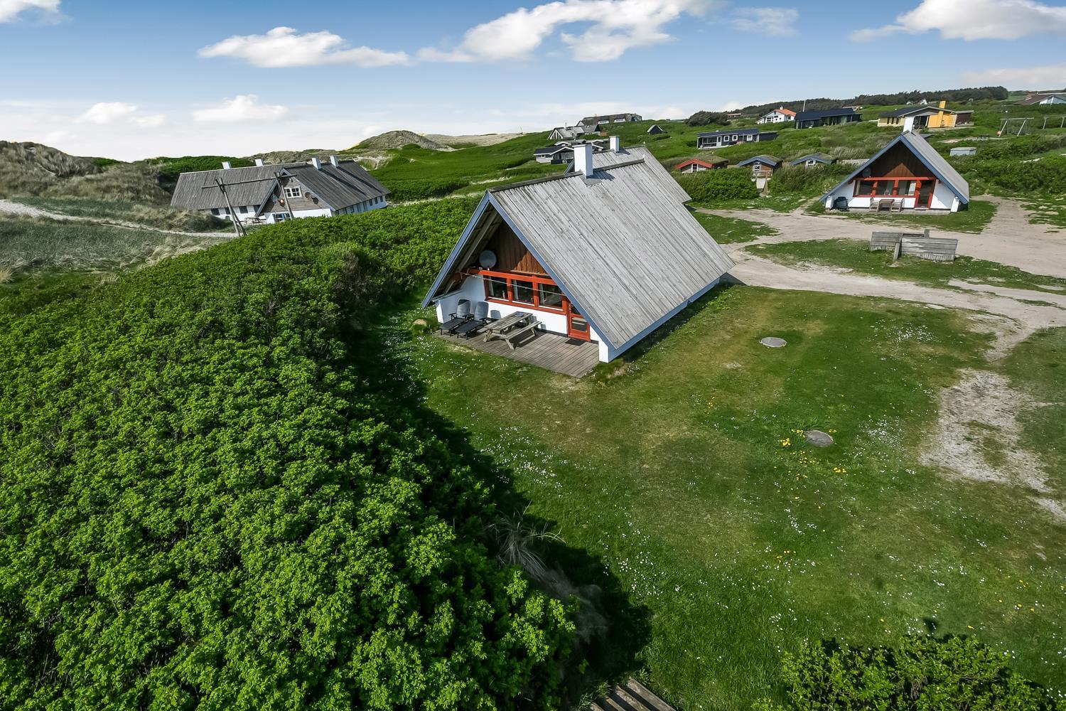 Udenfor huset er der en sydvest-vendt terrasse med havemøbler og grill. Terrassen er bindeled mellem huset og den omkringliggende natur, og bidrager i høj grad til, at følelsen af ferie, fred og ro kan sænke sig. Huset er en del af Fjaltring Ferieby som ligger klinet op ad klitterne ved Fjaltring Strand. Lige på den anden side af klitten ligger noget af det flotteste badestrand som Danmark har at byde på. Stranden og havet ligger til fri afbenyttelse året rundt.