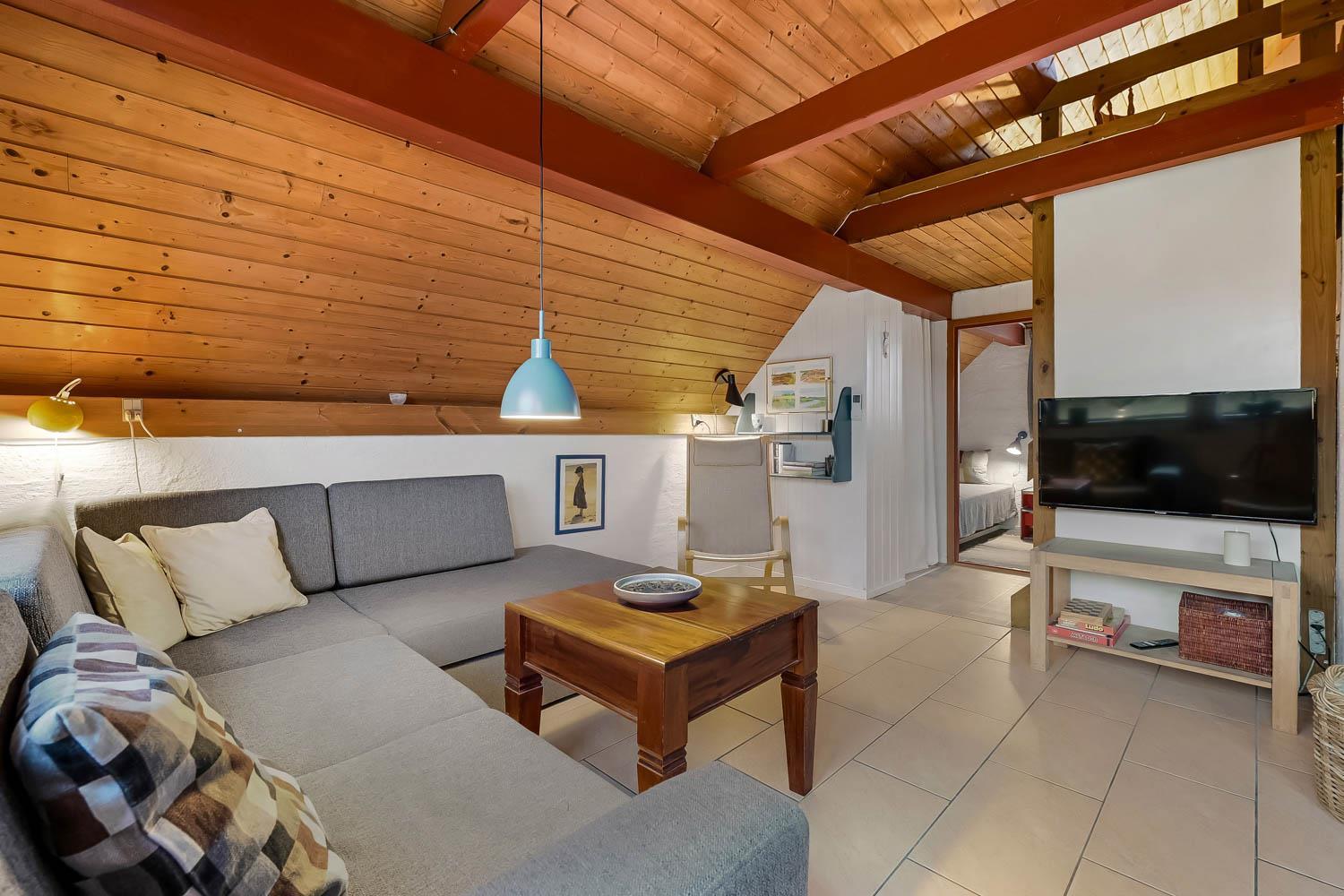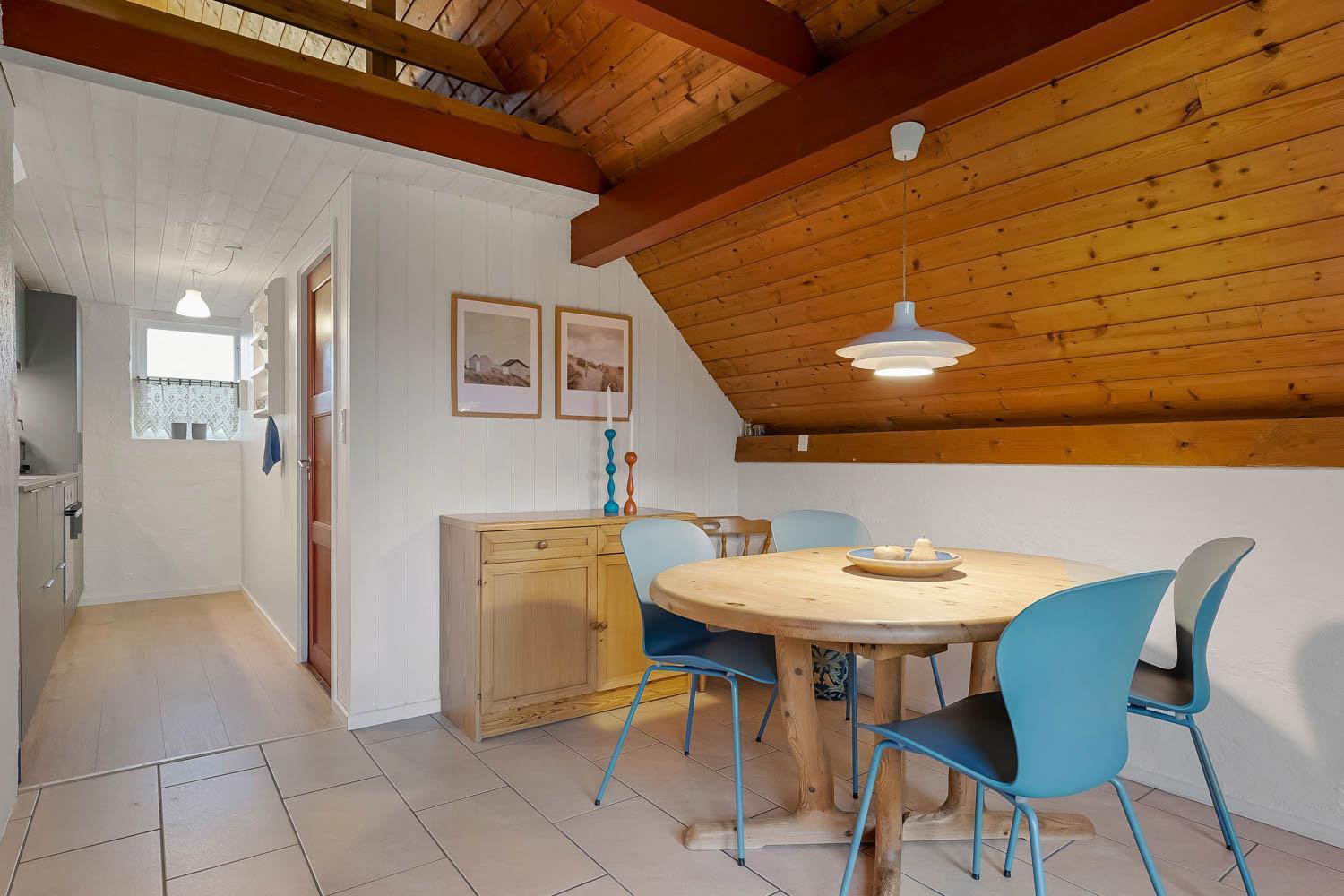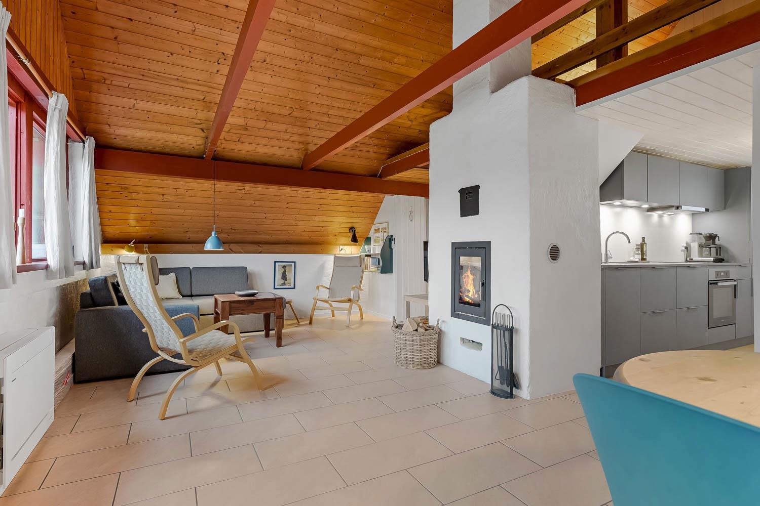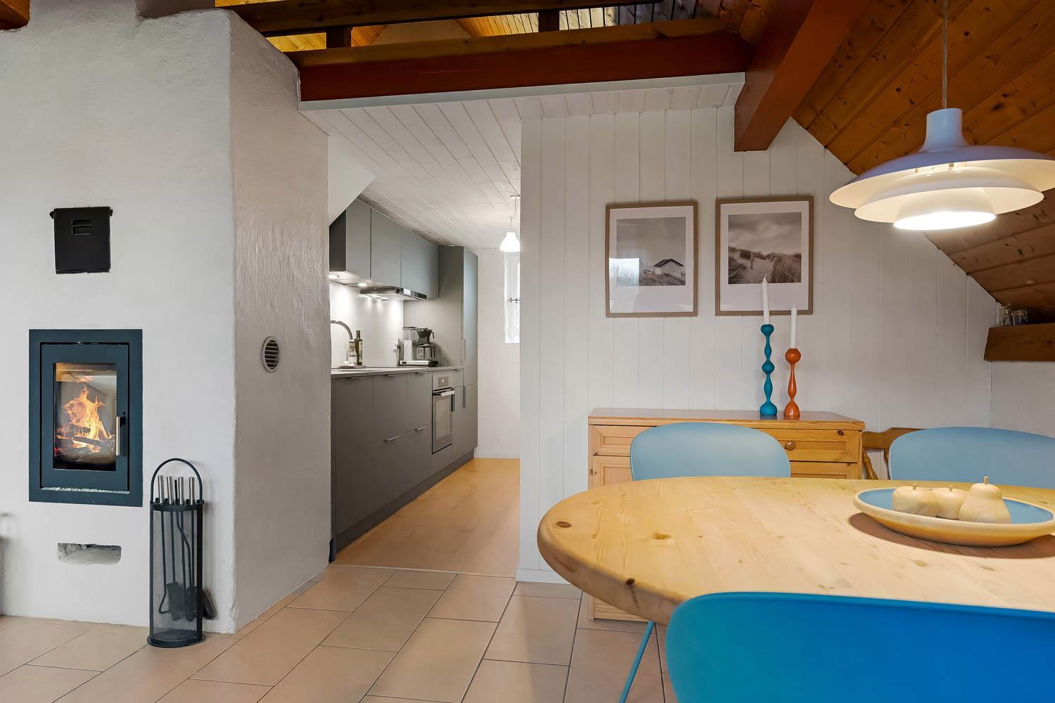 Feriehuset er på ca. 90 m2 og fremtræder næsten færdigrenoveret. Der er en hyggelig lys opholdsstue med højt til loftet. Der er gode, komfortable møbler, og på kølige aftener er det muligt at gøre opholdet behageligt ved at tænde op i brændeovnen og/eller varmepumpe. Der er installeret et nyt køkken med afdæmpede blå farvenuancer. Køkkenet indeholder de fleste moderne bekvemmeligheder såsom køl og frys, keramiske kogeplader, ovn og opvaskemaskine. Hvis feriehygge indbefatter hjemmelavet mad, så byder huset på rig mulighed dertil. Huset giver plads til 2 soveværelser i stueplan med i alt 3 sovepladser. Desuden er der en hems med to store enkeltsenge, som kan danne en dobbeltseng. Badeværelset er udstyret med toilet, håndvask, badekar og bruser.