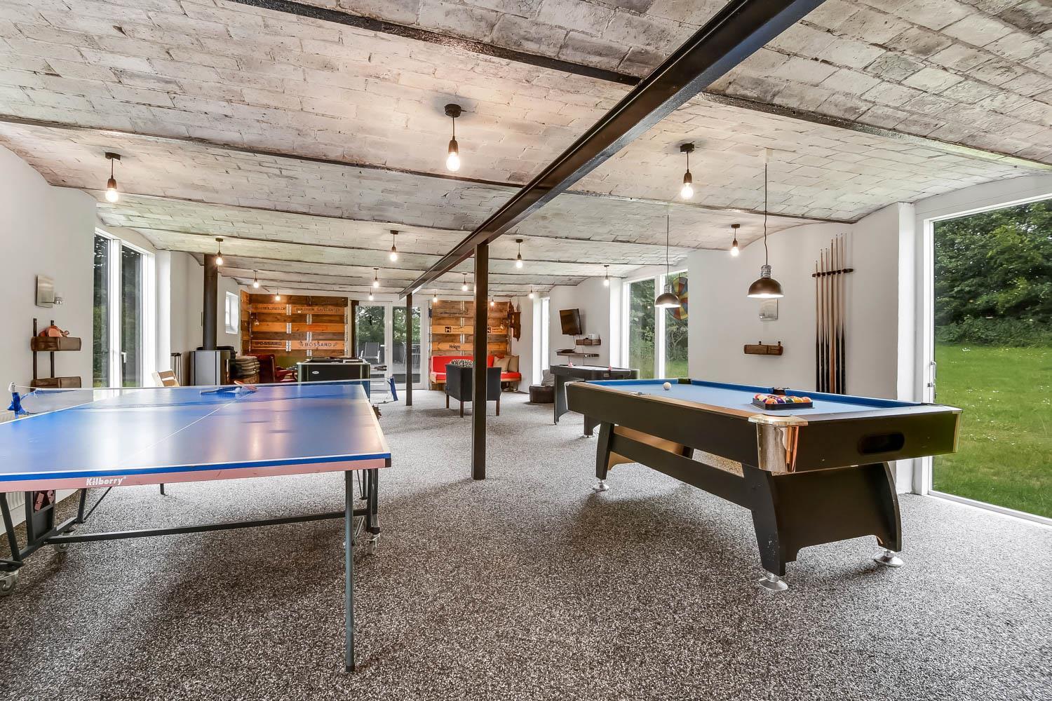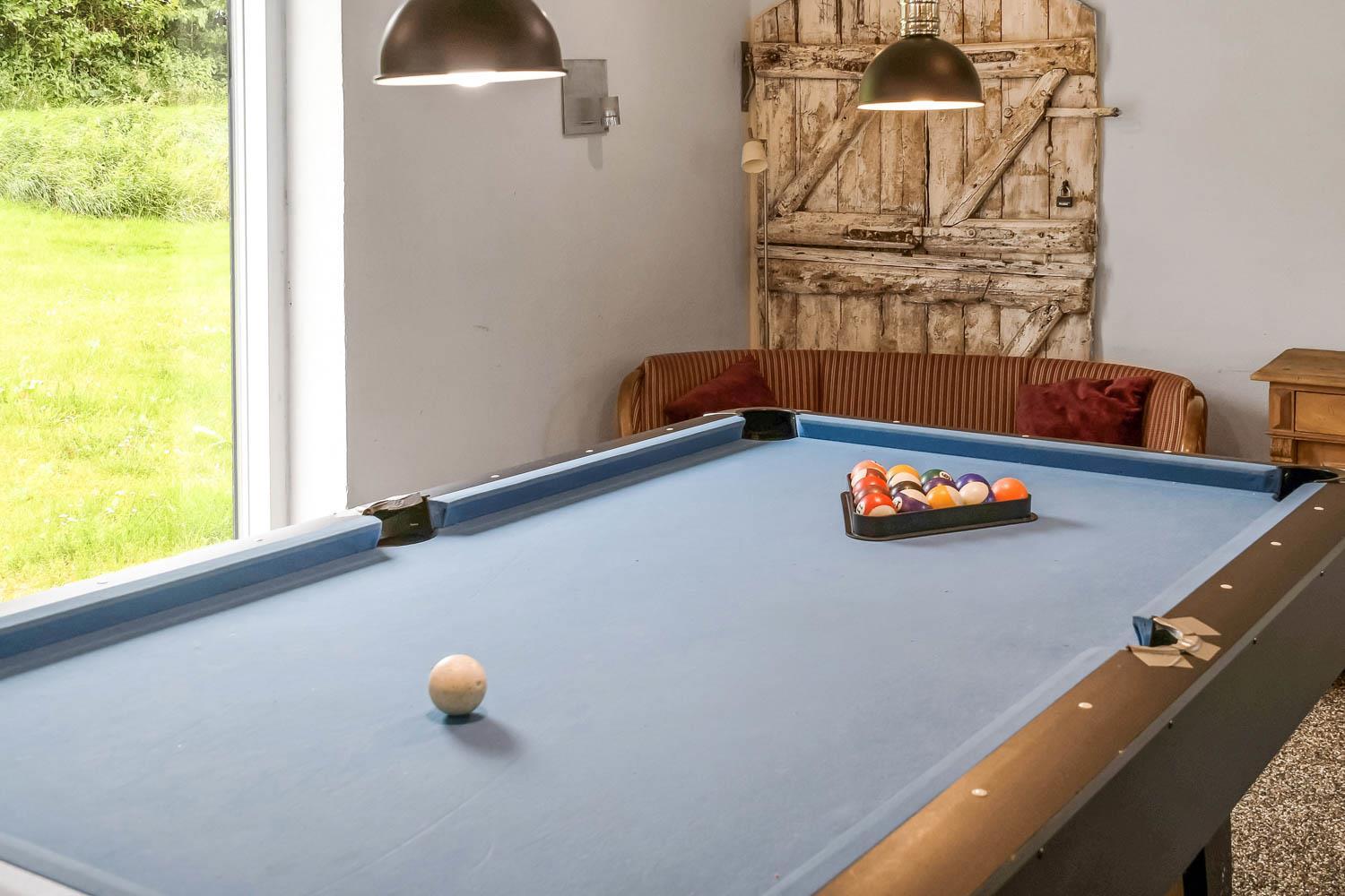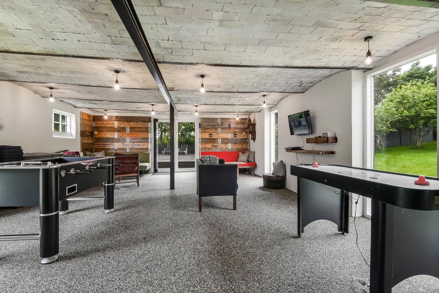 Huset har i alt 11 sovepladser. Nedenunder er der et værelse med dobbeltseng og et værelse med 4 køjesenge. Ialt 6 soveplader nedenunder. Ovenpå er der et værelse med en dobbeltseng og på hemsen, som har forbindelse med stuen, er der 3 sovepladser. Stuen, er bygget sammen med køkkenet og, er stilfuld indrettet med epoxy-stengulv, fladskærm med tysk og dansk tv, cromecast og brændeovn. Hertil er der også spisebord og sofagruppe. Det lækre køkken har 2 elkomfurer, køleskab, en 40 liters fryser, mikroovn og opvaskemaskine. Der er 2 badeværelser som ligger ved siden af hinanden i stueetagen. Det store badeværelse har gulvvarme, dampkabine med bruser, toilet, spabad og håndvask. Det mindre badeværelse har blot toilet og håndvask. Det store aktivitetsrum er i modsatte ende af stuen og byder på bordtennis, bordfodbold, poolbord og Playstation2 samt ekstra spiseborde hvis man af praktiske grunde skal spise eller på anden måde opholde sig her. Herudover har huset en barnestol, en barneseng, en tørretumbler samt en vaskemaskine. Huset er lavet som et energi rigtigt hus der opvarmes med jordvarme. Rengøring er obligatorisk ved dette hus.